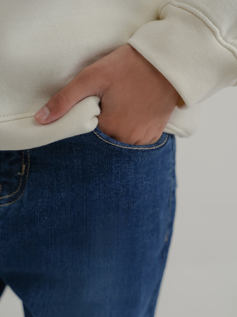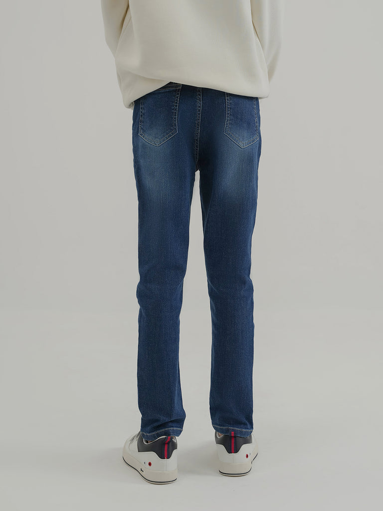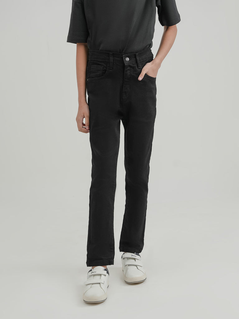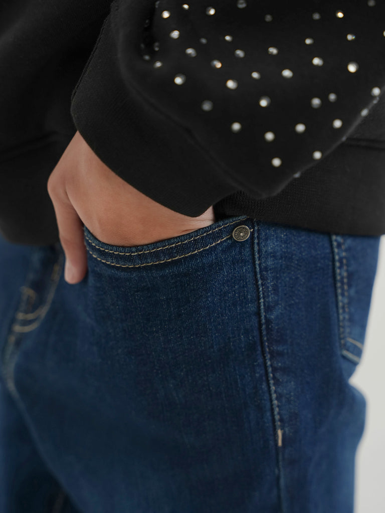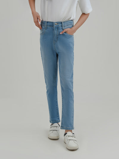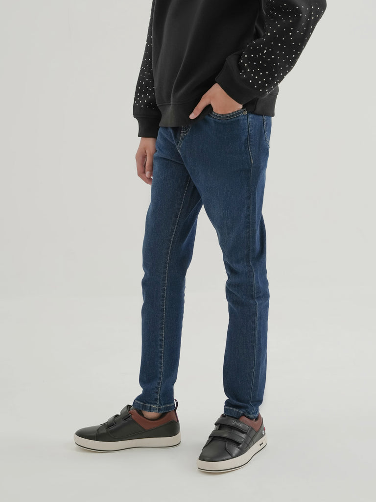 These girls' denim pants feature a slim fit for a smart and stylish look. Made with soft and durable fabric, they offer comfort and easy movement for everyday wear. Perfect for school, outings, or casual days, these pants are a great match with any top or t-shirt.