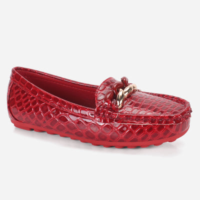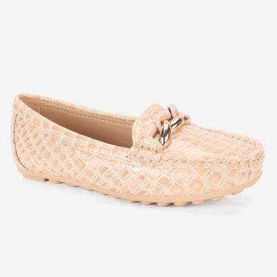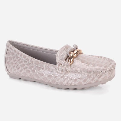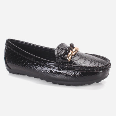 Let's be sure that your child walks with confidence and comfort by dressing their feet in these beautifully adorned flat moccasin shoes. The vamp of these shoes is embellished with a chained buckle, adding a touch of elegance. Moreover, the slip-on design allows for effortless wearing and removal, providing convenience and ease.