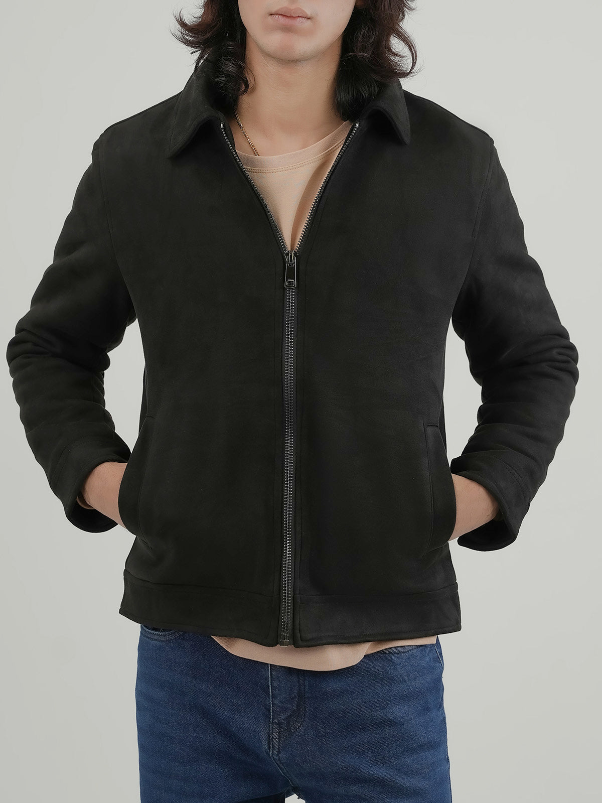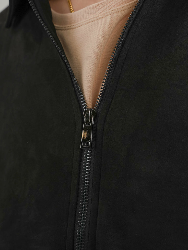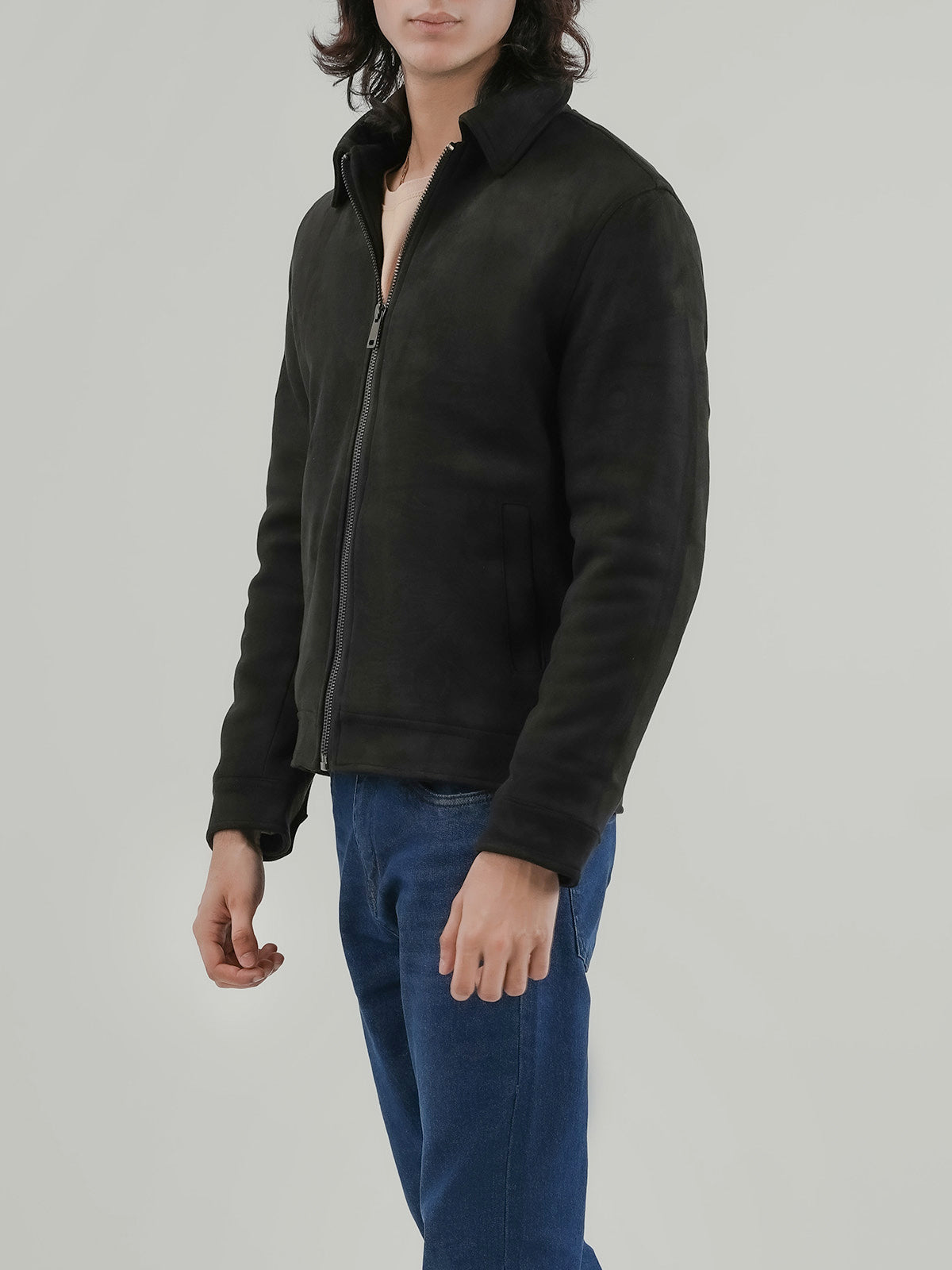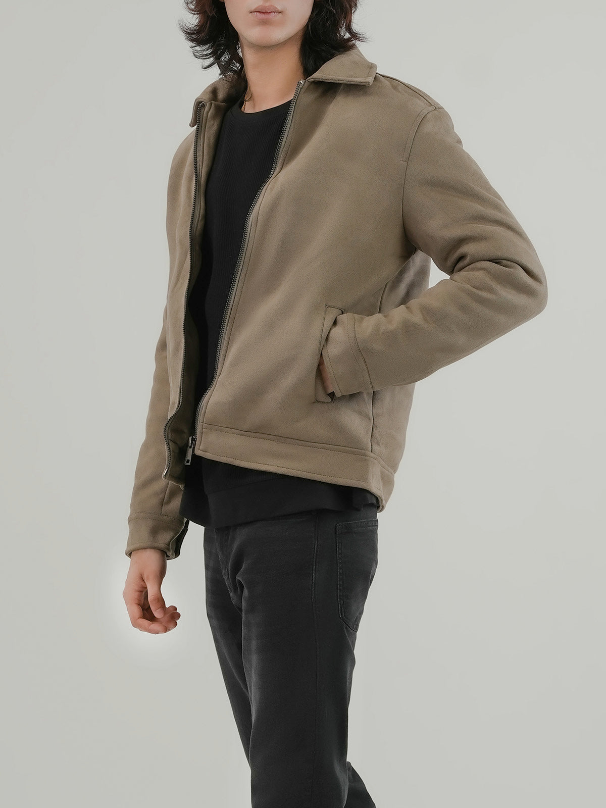Stay warm and look sharp with this classic suede jacket. Made with soft fabric and a stylish zip-up front, it’s perfect for both casual and smart looks.
