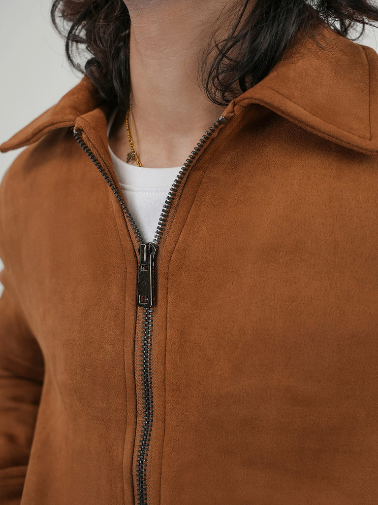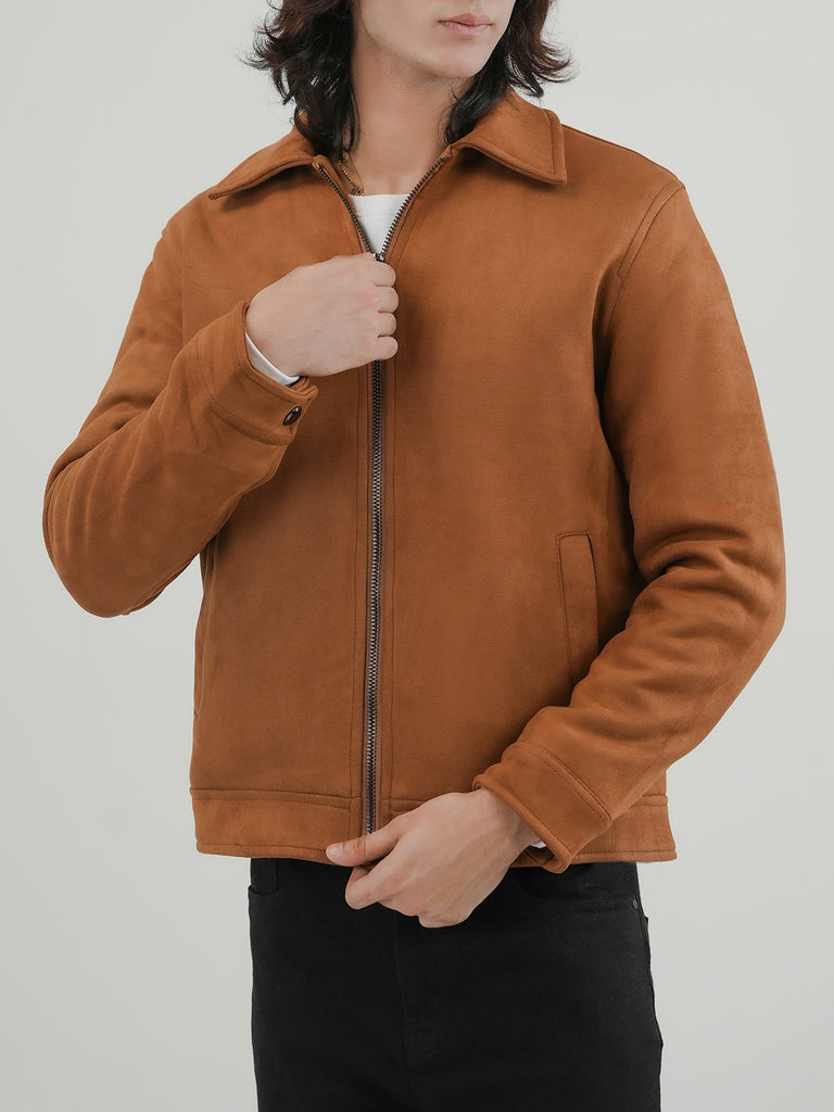 Stay warm and look sharp with this classic suede jacket. Made with soft fabric and a stylish zip-up front, it’s perfect for both casual and smart looks.