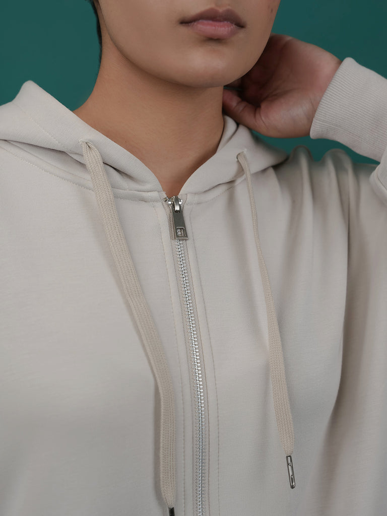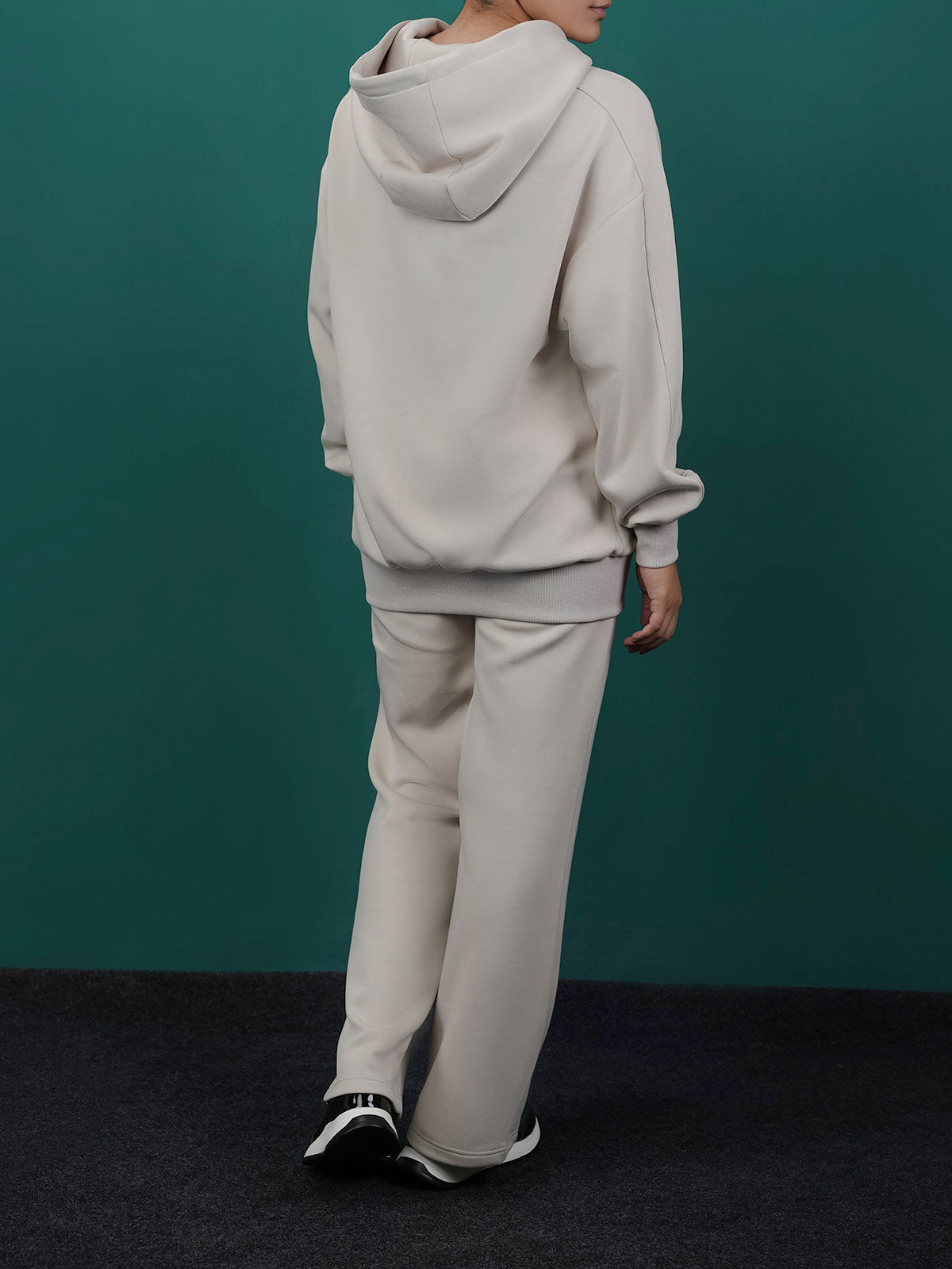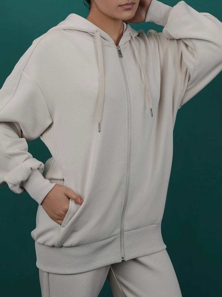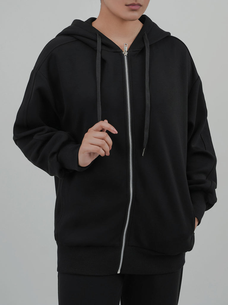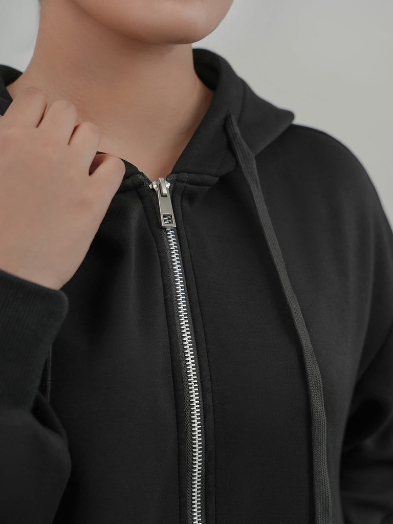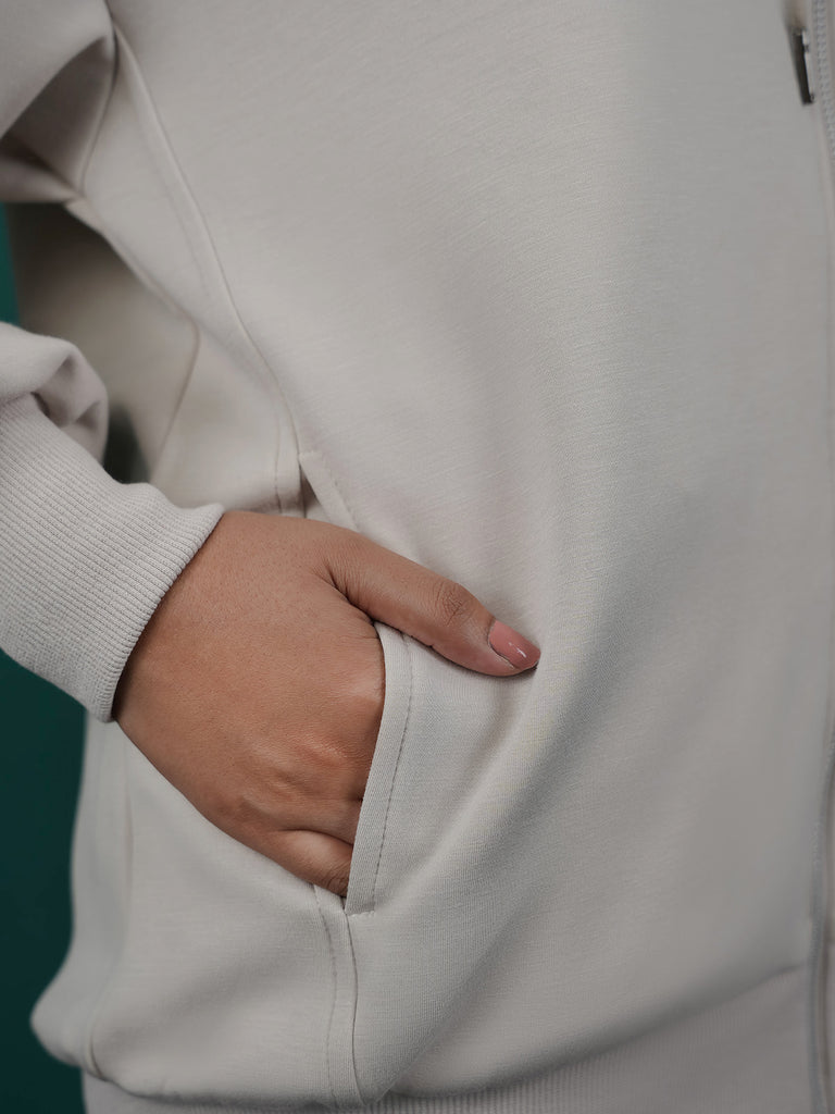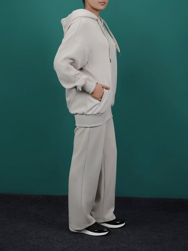 This women's fleece co-ord set is perfect for a cozy, casual look. It comes with a zip-up hoodie and matching pants with zip detail at the bottom. Made from soft fabric, it's great for everyday wear and staying warm.