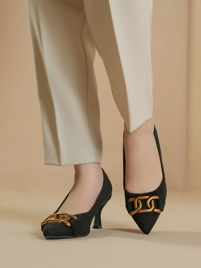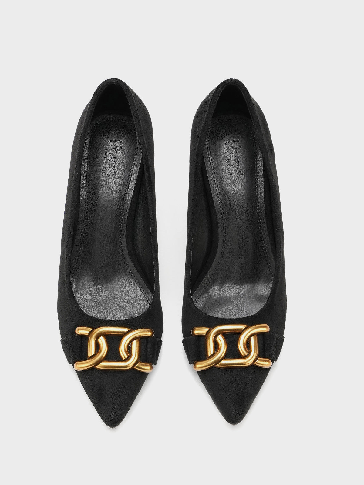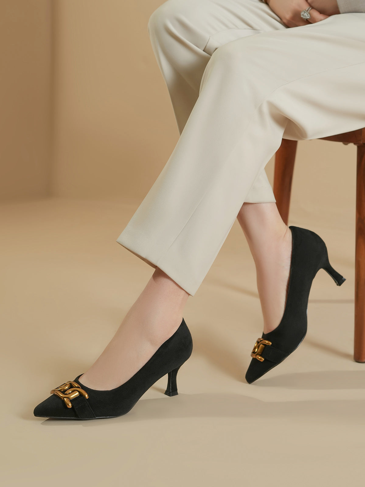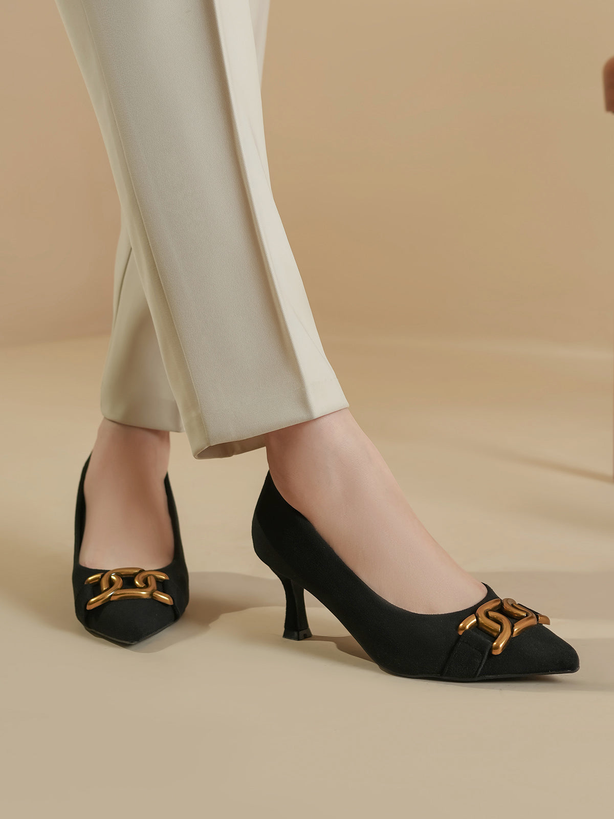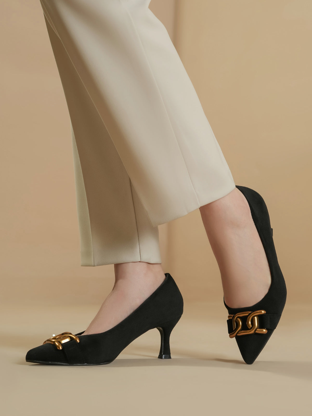Step into elegance with this stylish women’s court shoe set. Featuring a pointed toe and sleek kitten heel, the black suede shoe is adorned with a bold gold chain detail for a chic, modern touch, while the rich brown suede pair offers a classic, clean finish.