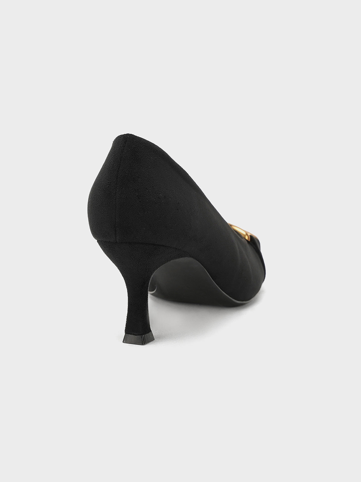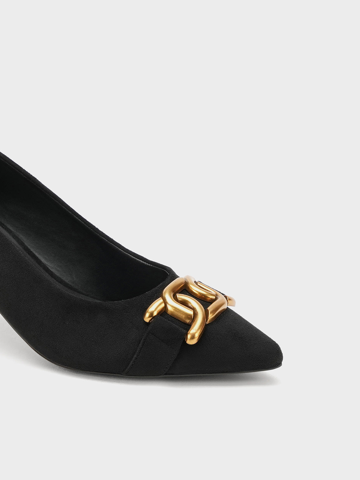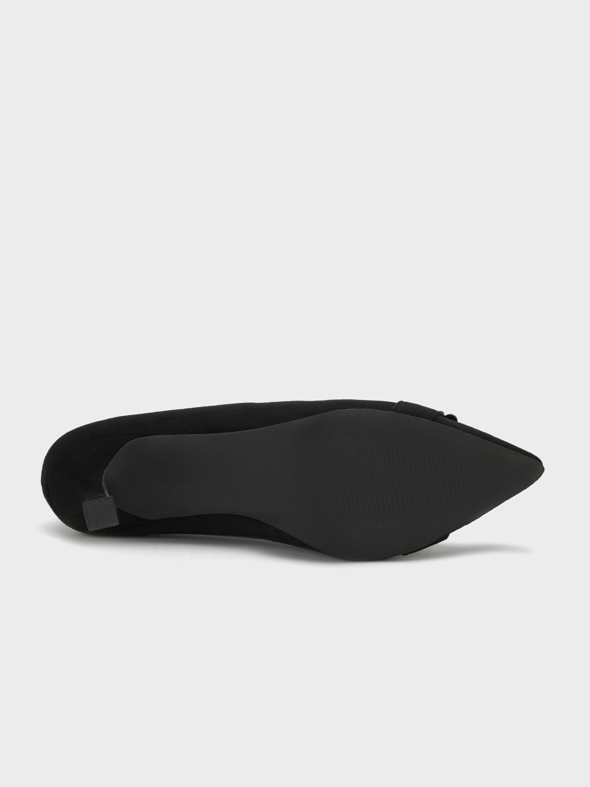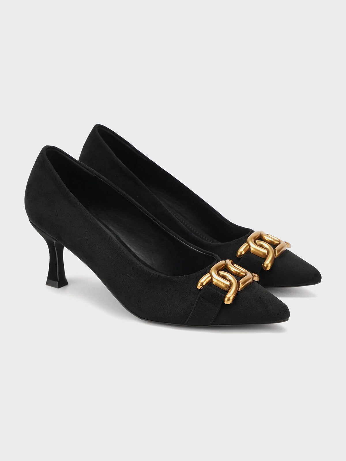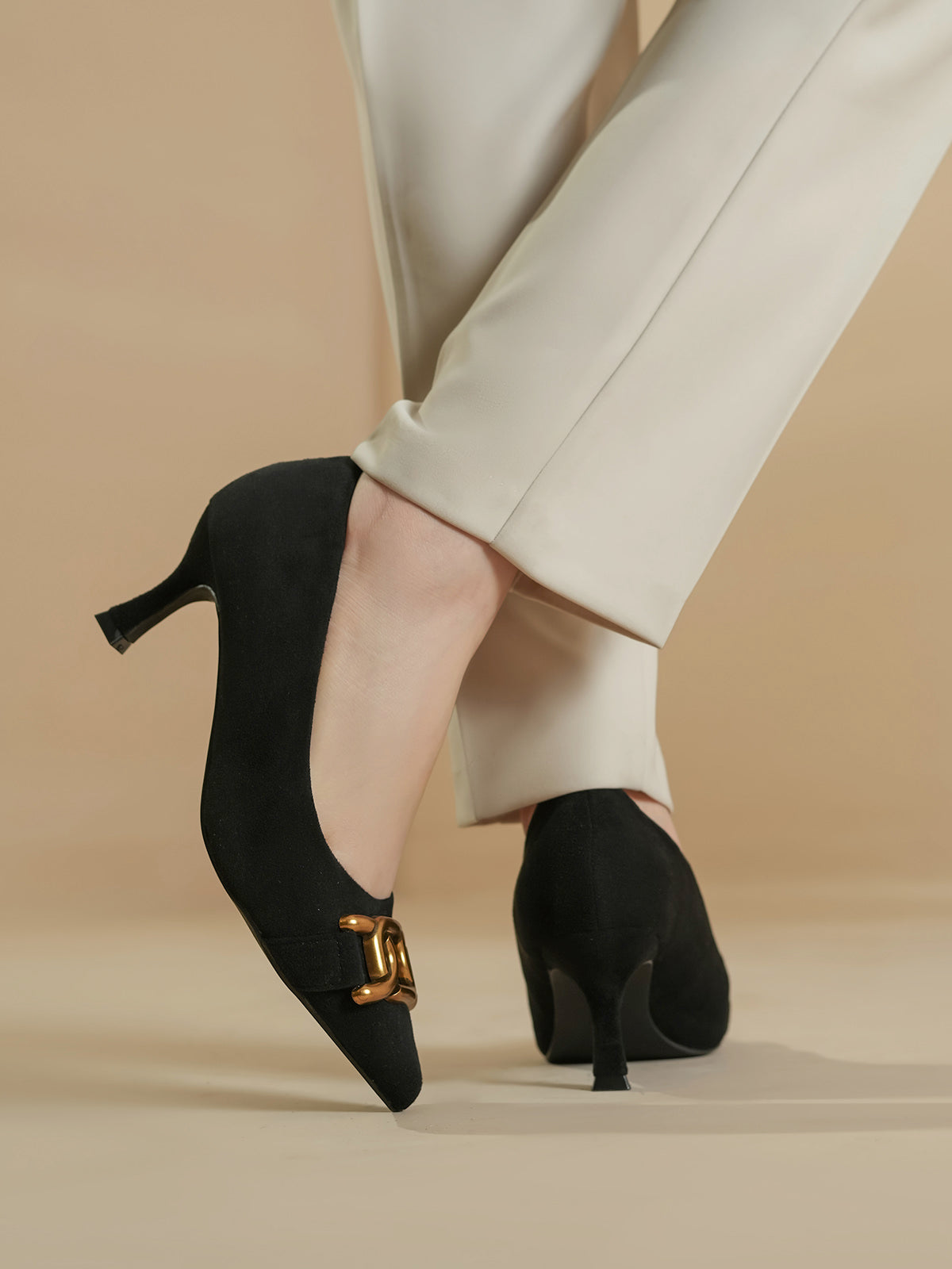 Step into elegance with this stylish women’s court shoe set. Featuring a pointed toe and sleek kitten heel, the black suede shoe is adorned with a bold gold chain detail for a chic, modern touch, while the rich brown suede pair offers a classic, clean finish.