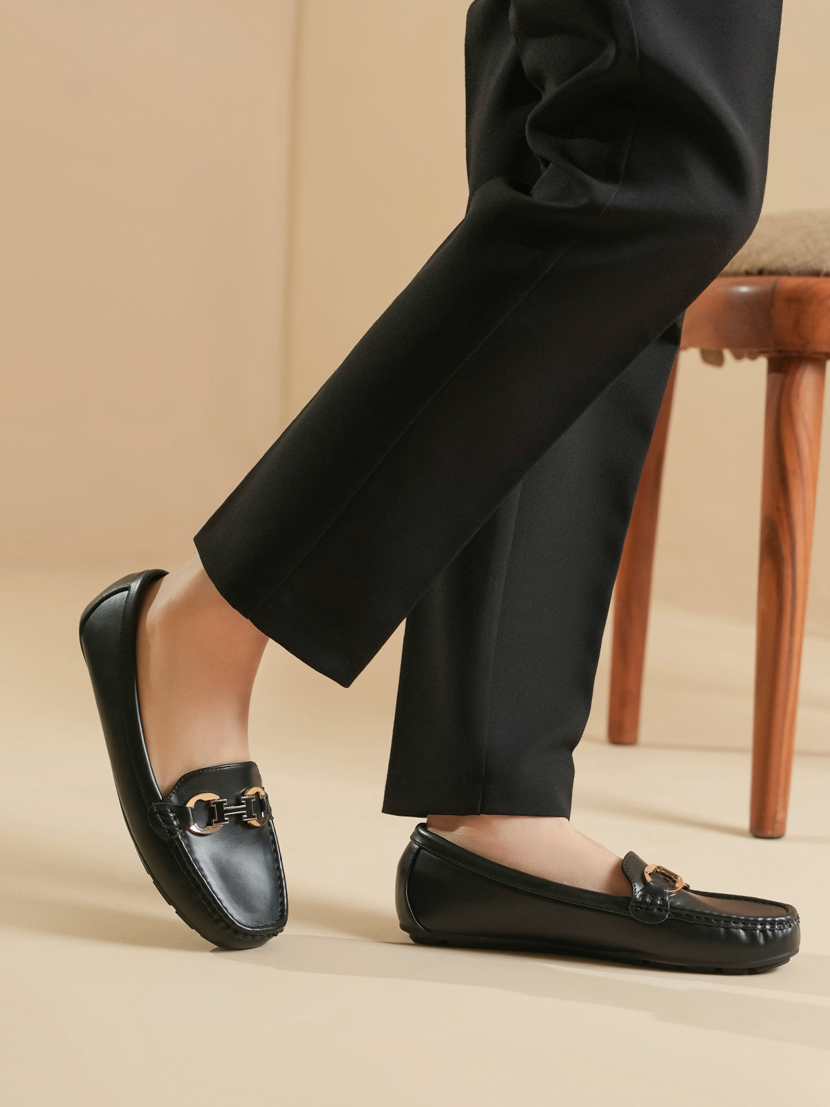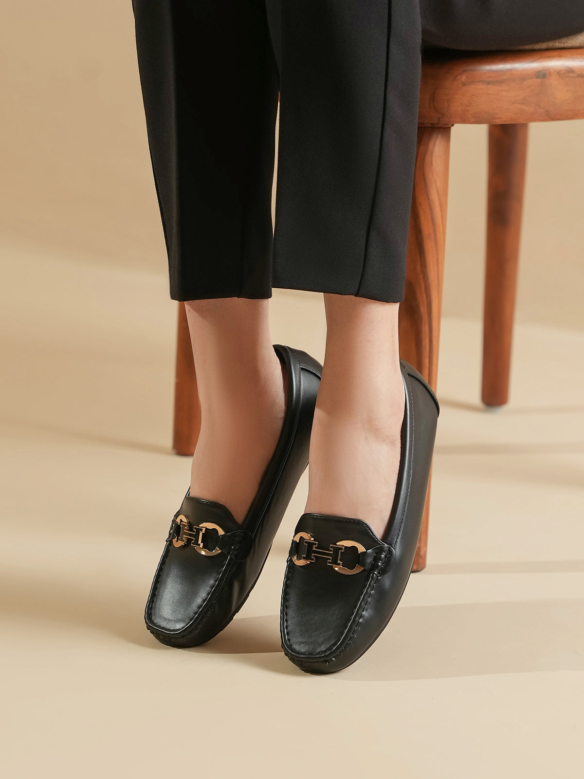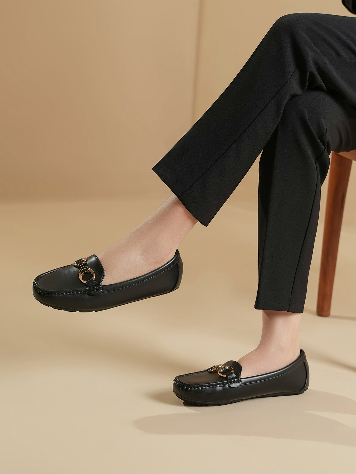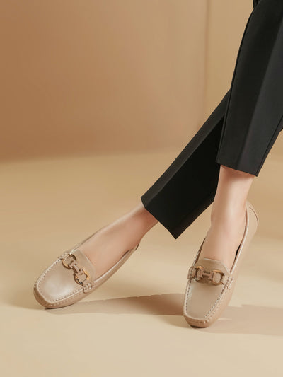 These moccasins feature a sleek design with a stylish metal buckle on the front. Made for all-day comfort, they are soft, easy to wear, and perfect for everyday or office looks. A great mix of elegance and ease.