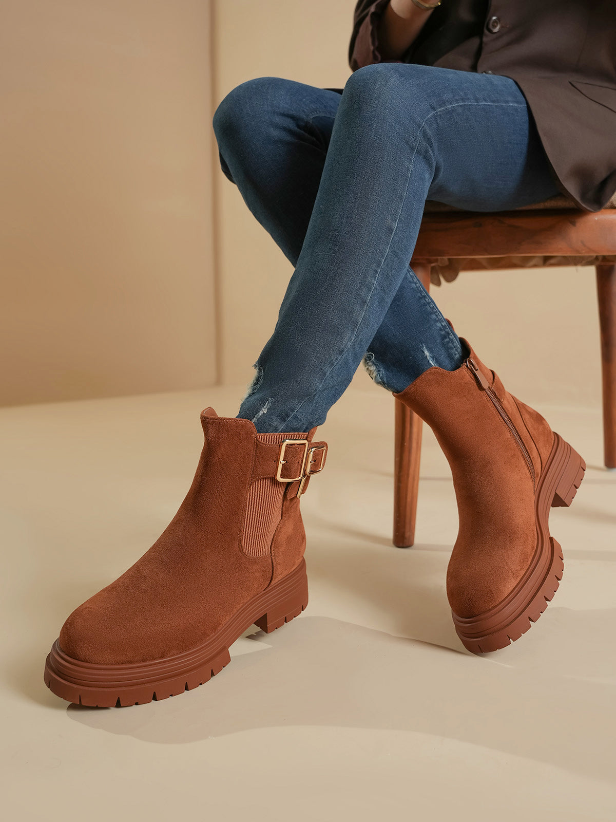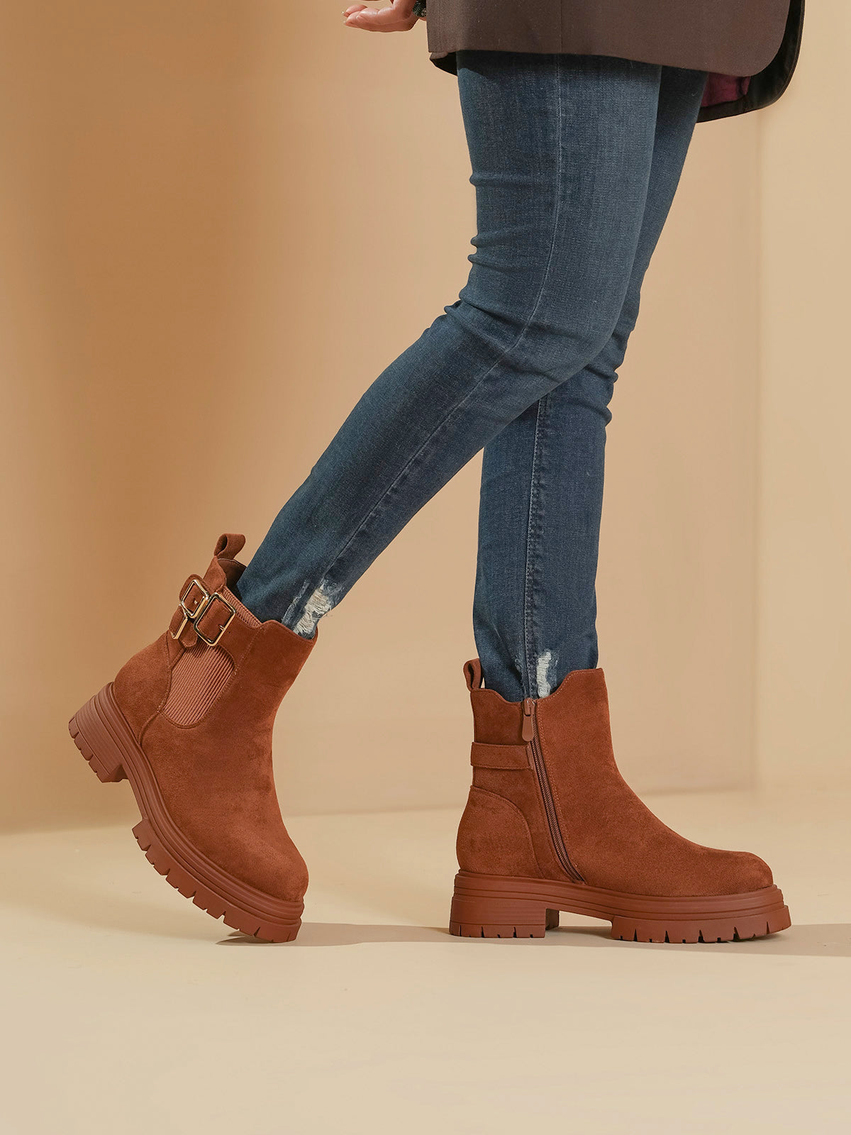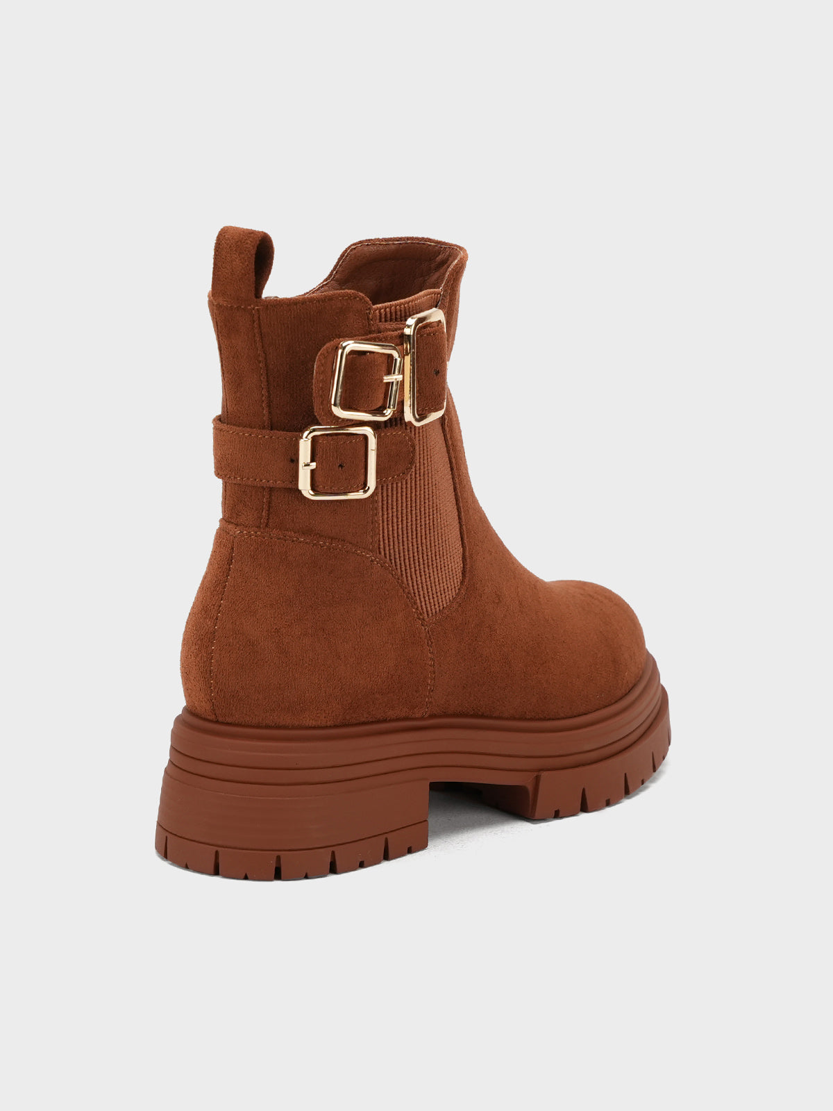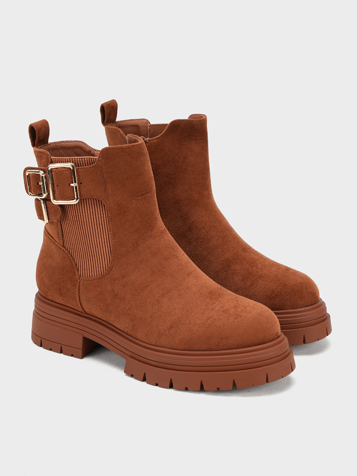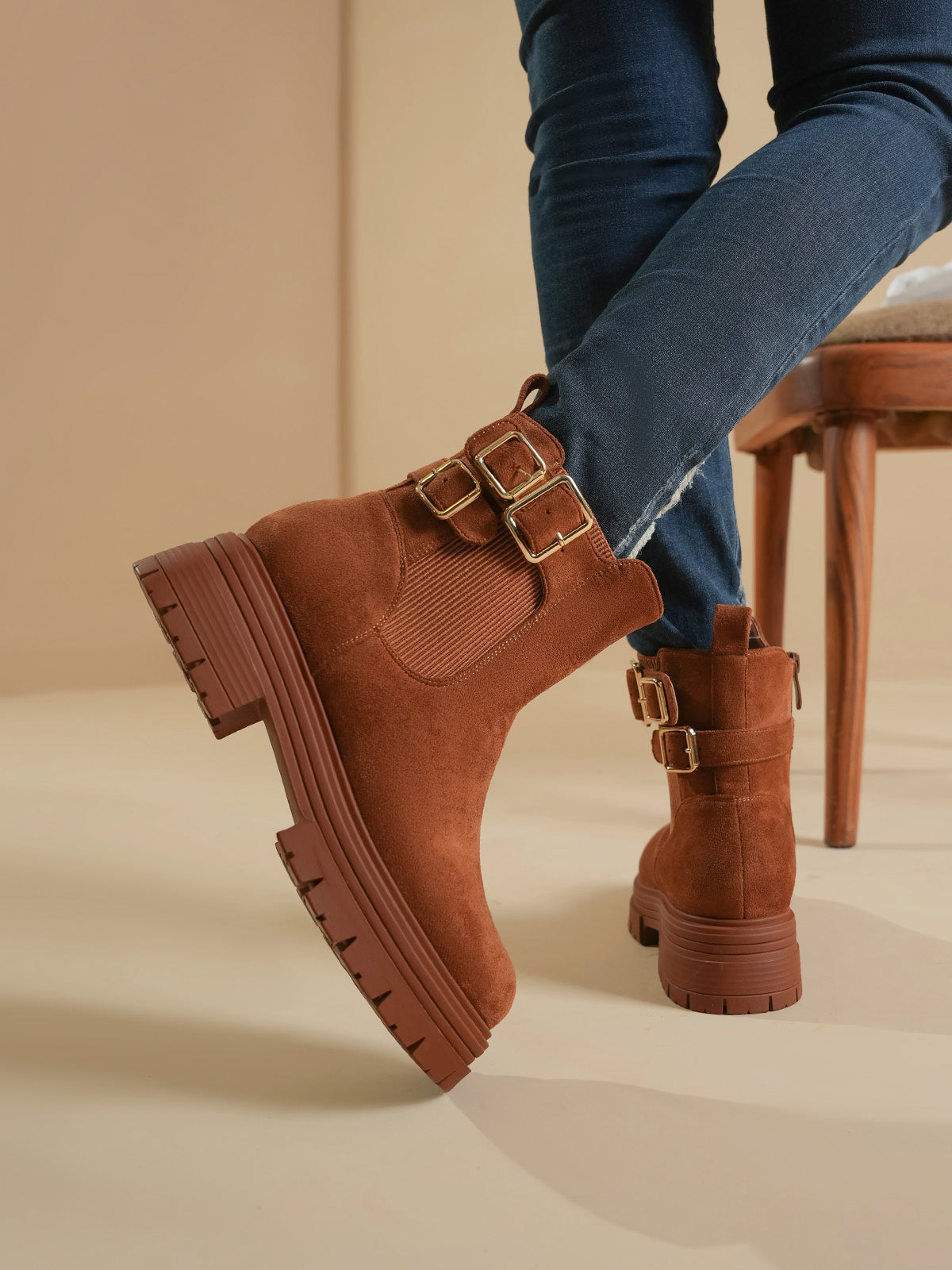 Stay warm and stylish with these trendy women’s ankle boots. Crafted in a soft suede-like material, they feature double gold-tone buckles and a side elastic panel for extra comfort and flexibility. A perfect choice for casual outfits and chilly days.