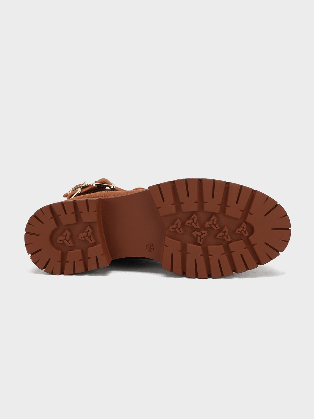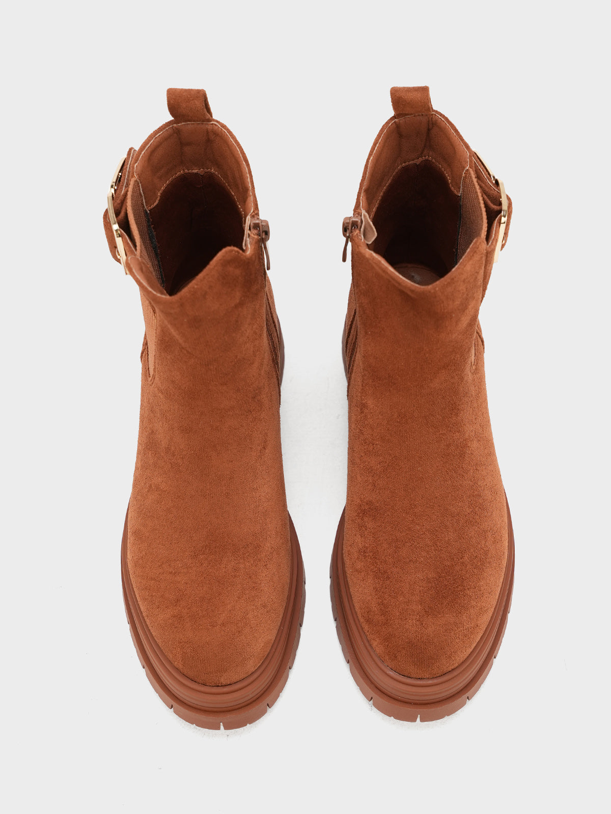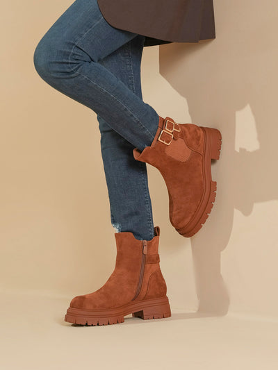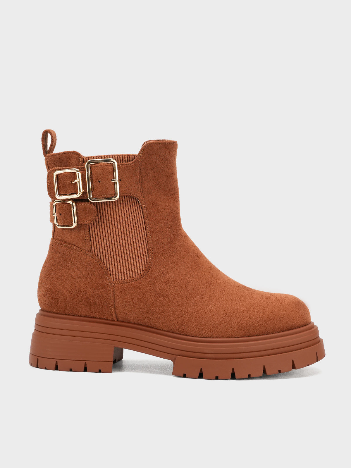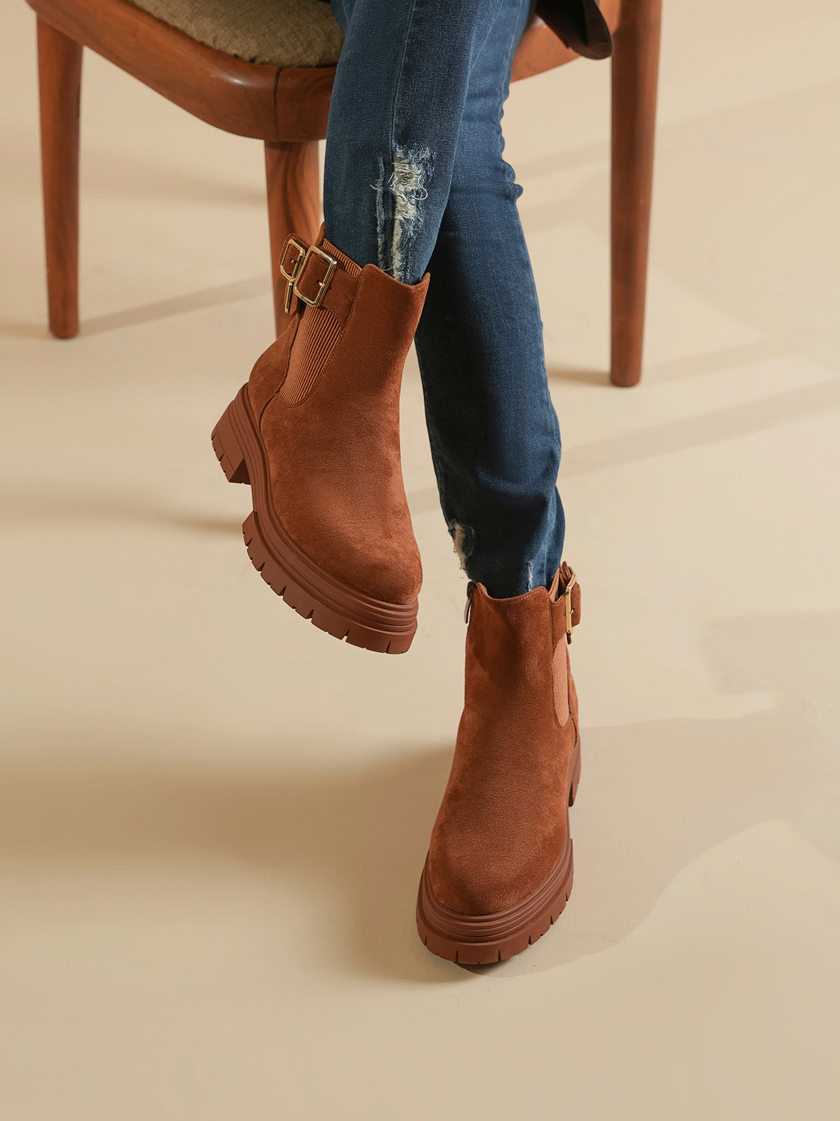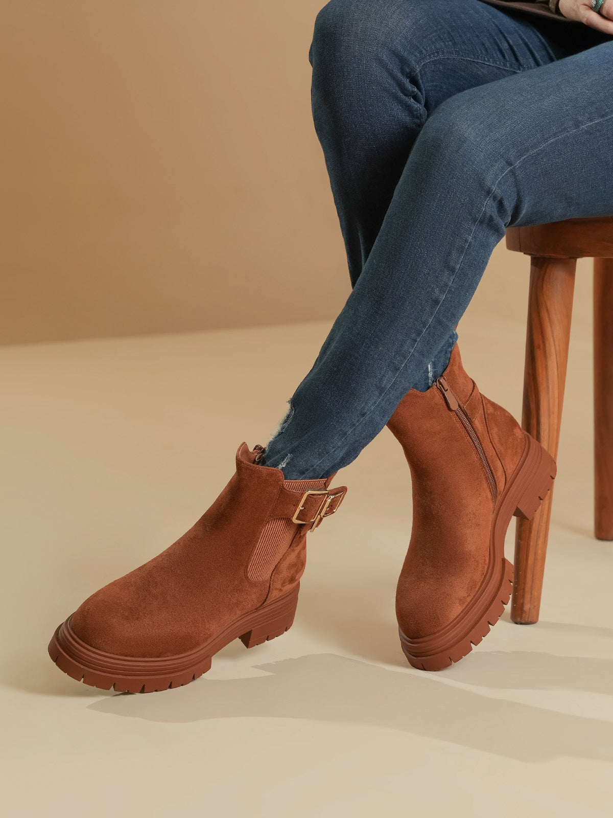 Stay warm and stylish with these trendy women’s ankle boots. Crafted in a soft suede-like material, they feature double gold-tone buckles and a side elastic panel for extra comfort and flexibility. A perfect choice for casual outfits and chilly days.