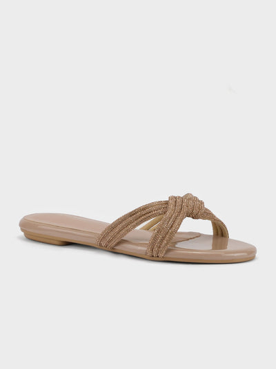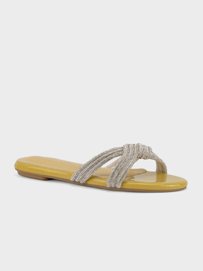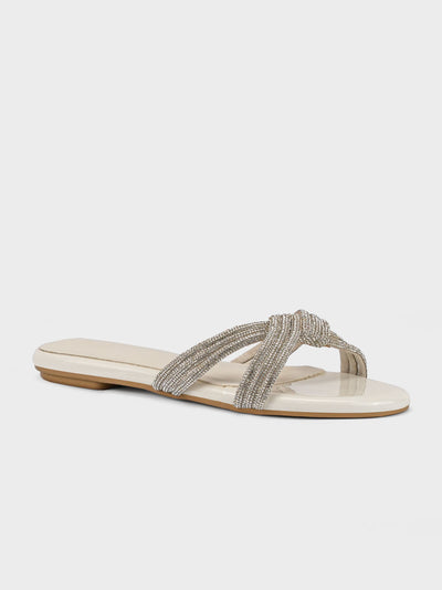Add a touch of sparkle to your summer wardrobe with these flat open-toe slippers featuring a dazzling crystal-embellished upper. Perfect for casual outings or evening chic. These slippers have rounded toe with padded footbed.