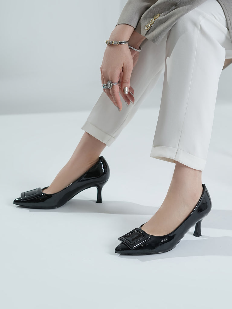 Add a touch of shine to your look with this elegant patent leather court shoe set. Featuring a pointed toe and kitten heel, the black pair stands out with a bold buckle detail,