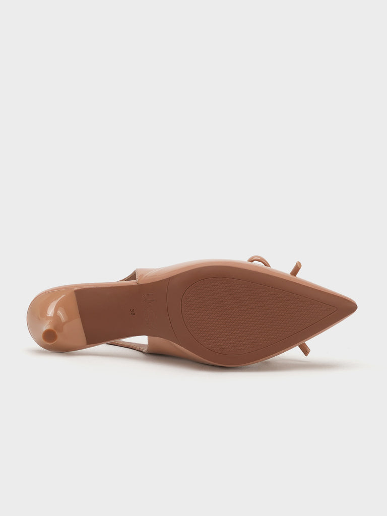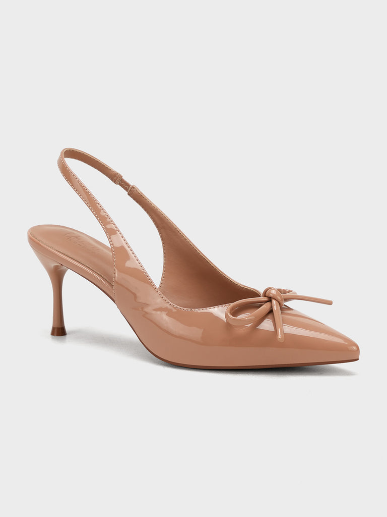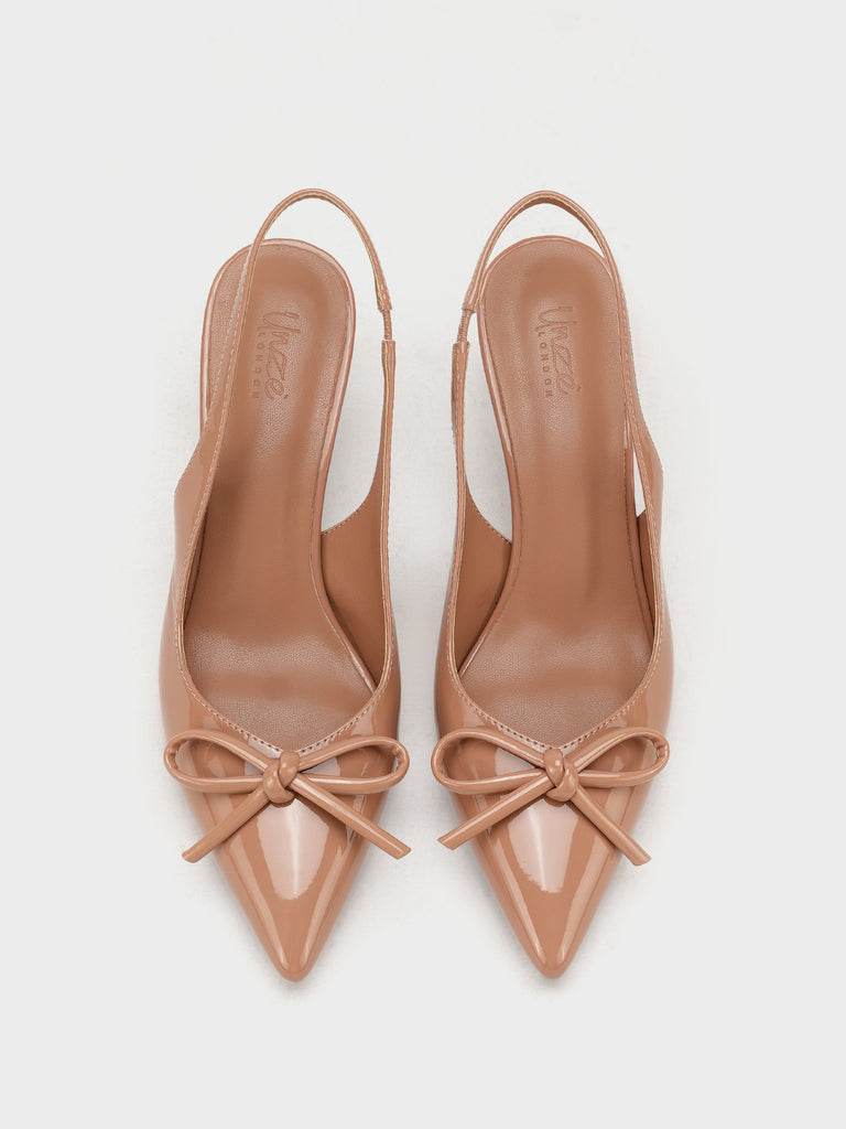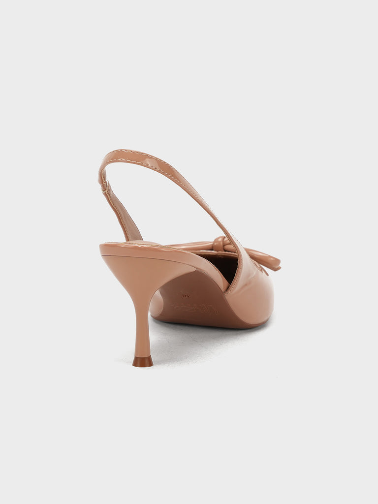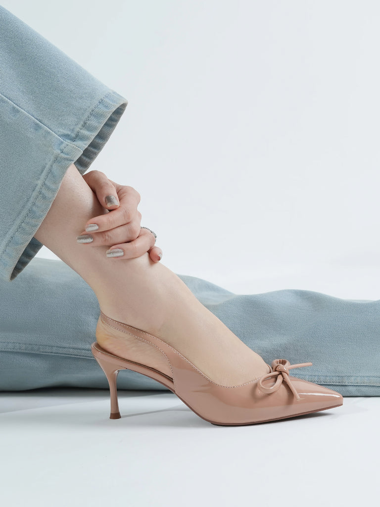 Elevate your look with these stylish women’s slingback sandals, designed with a sleek pencil heel for a touch of elegance. Crafted in a glossy finish with a pointed toe and chic bow detail, these sandals combine sophistication with modern charm.