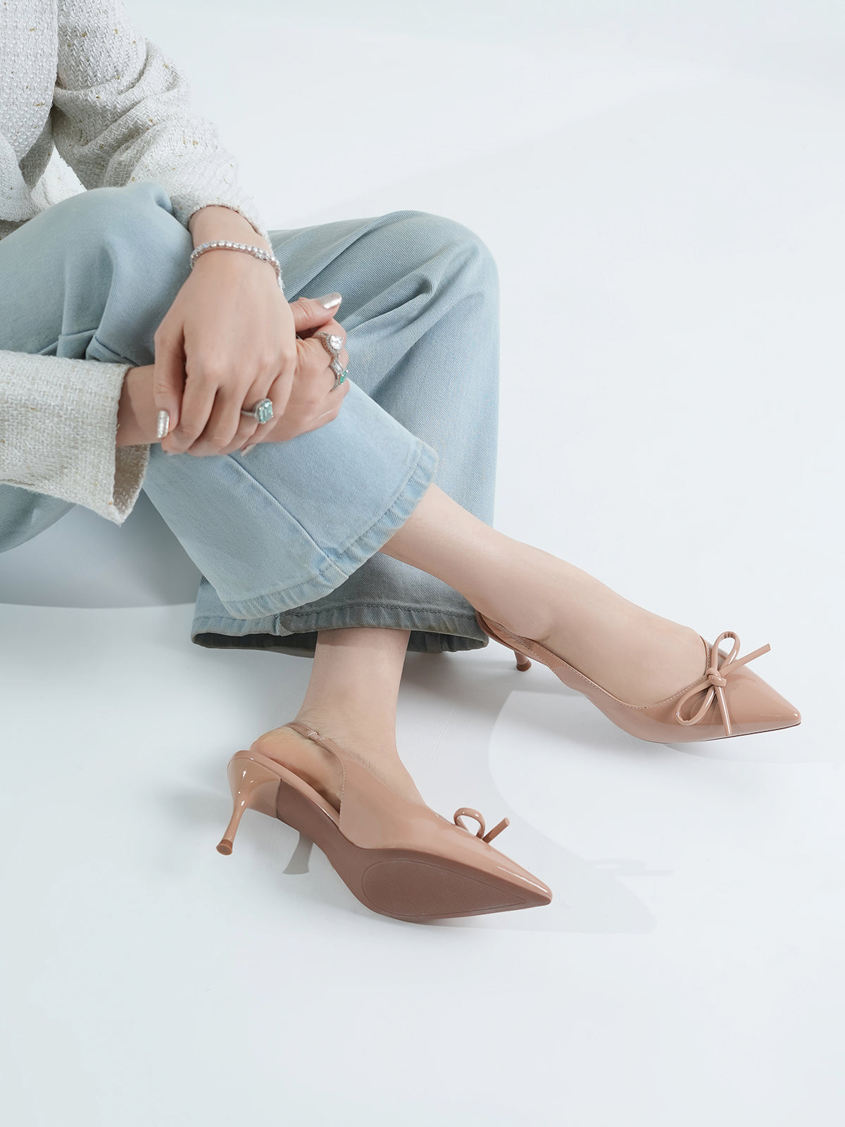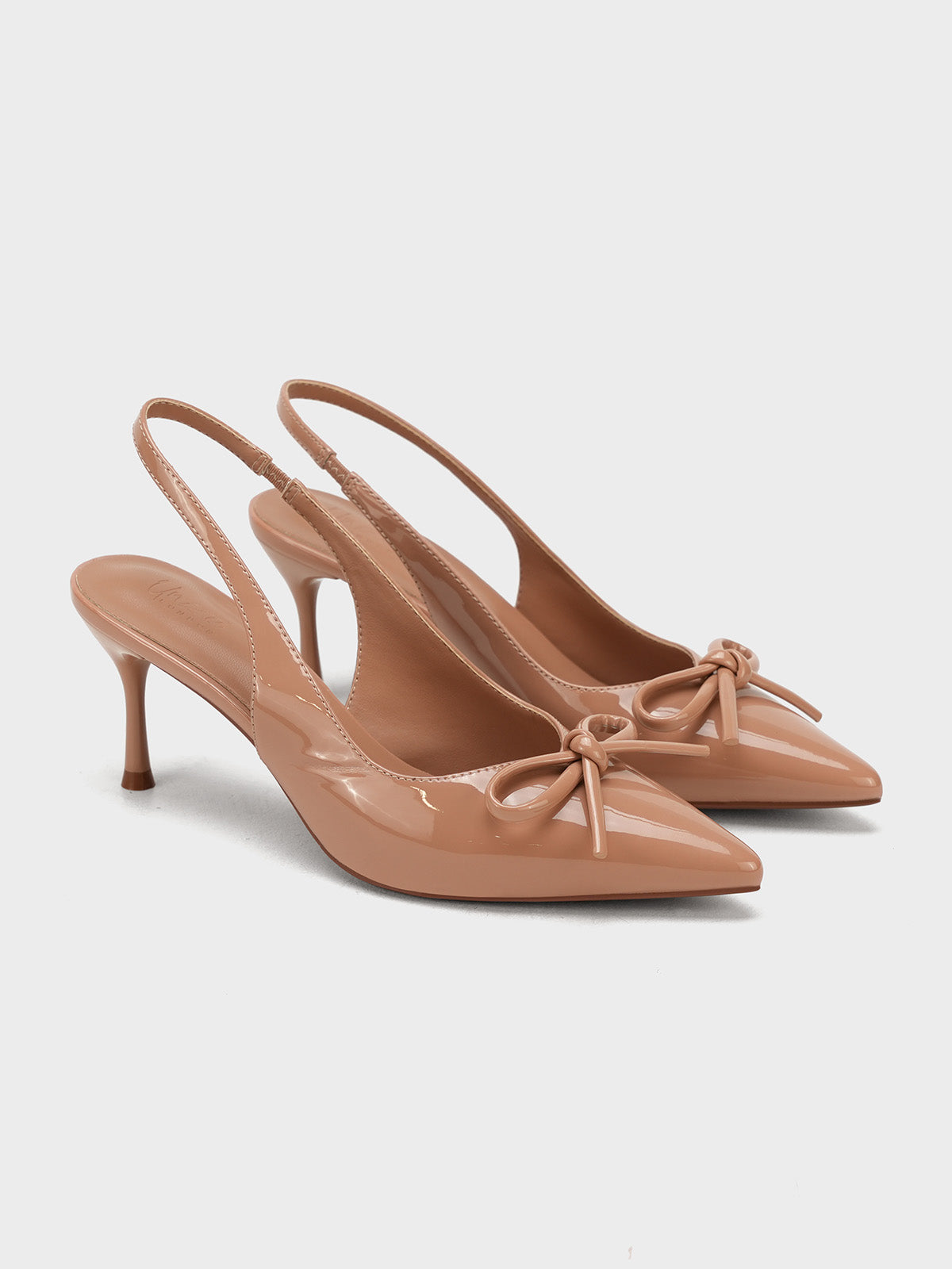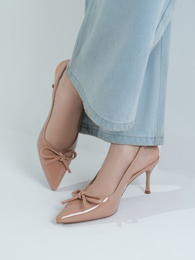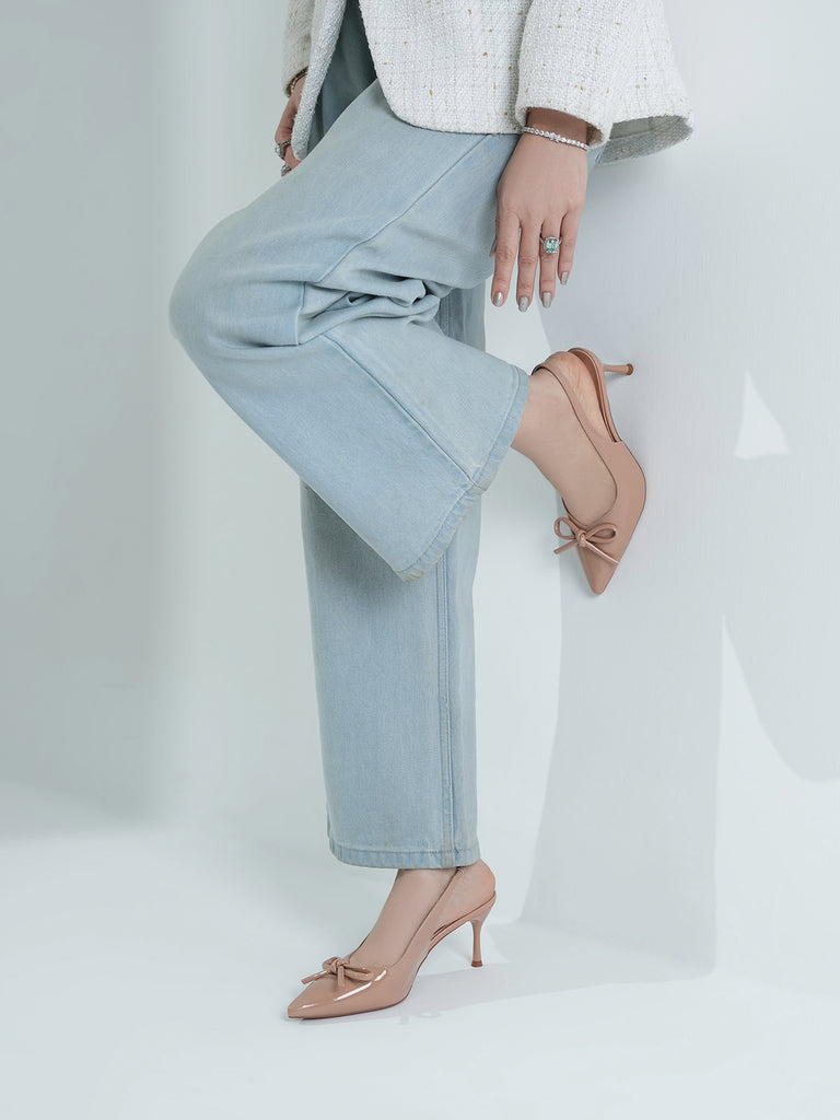 Elevate your look with these stylish women’s slingback sandals, designed with a sleek pencil heel for a touch of elegance. Crafted in a glossy finish with a pointed toe and chic bow detail, these sandals combine sophistication with modern charm.