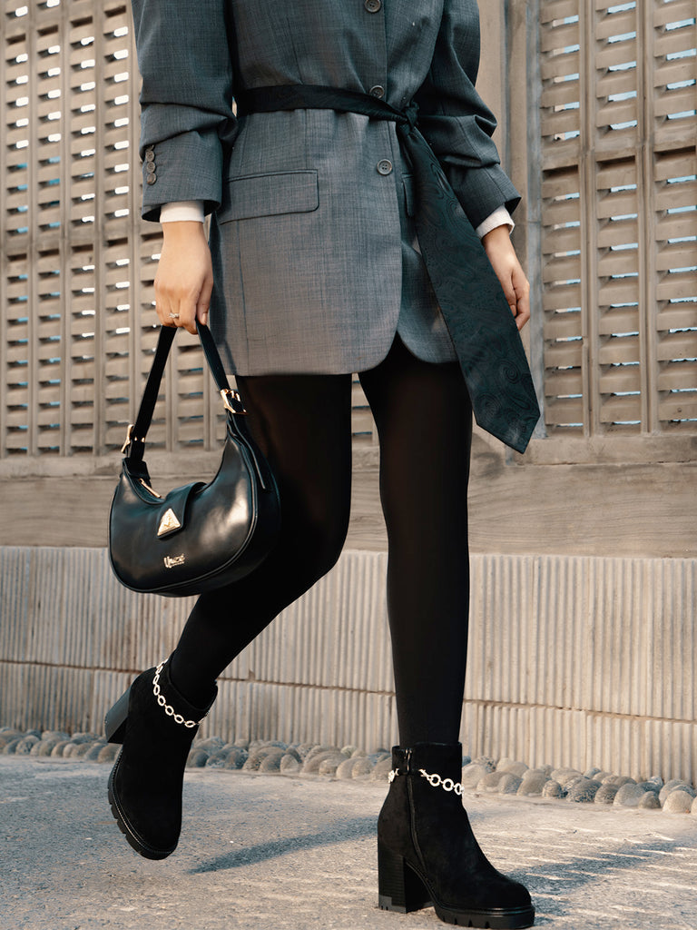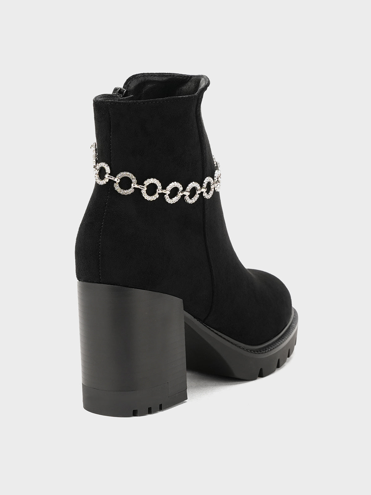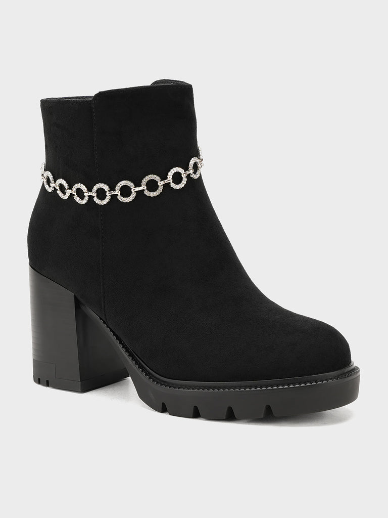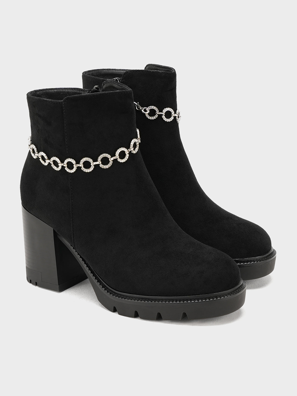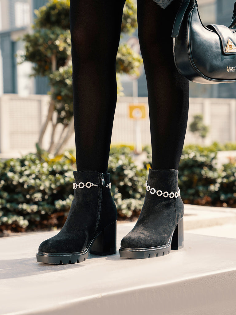 Make a bold statement with these women’s ankle boots featuring a stylish chain detail around the ankle. The sleek design is elevated with a sturdy block heel that adds height without compromising comfort. Perfect for adding a touch of edge to your outfit.