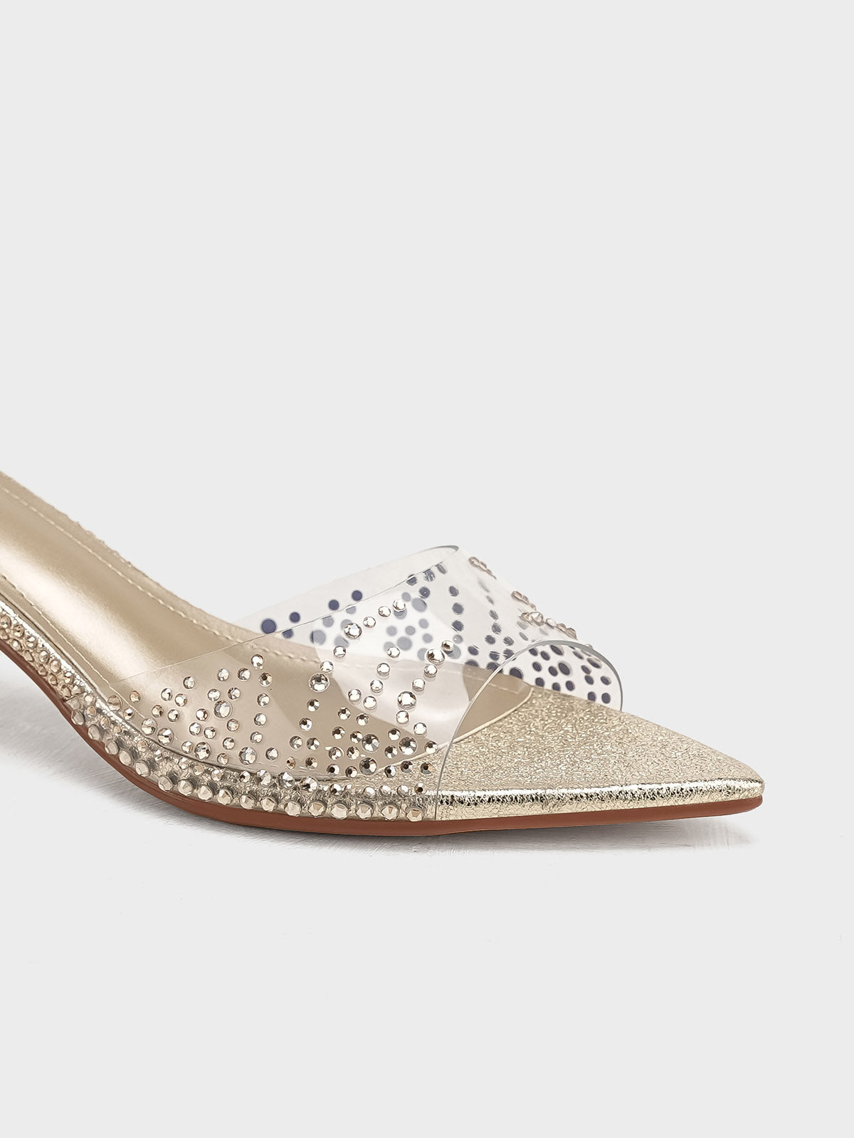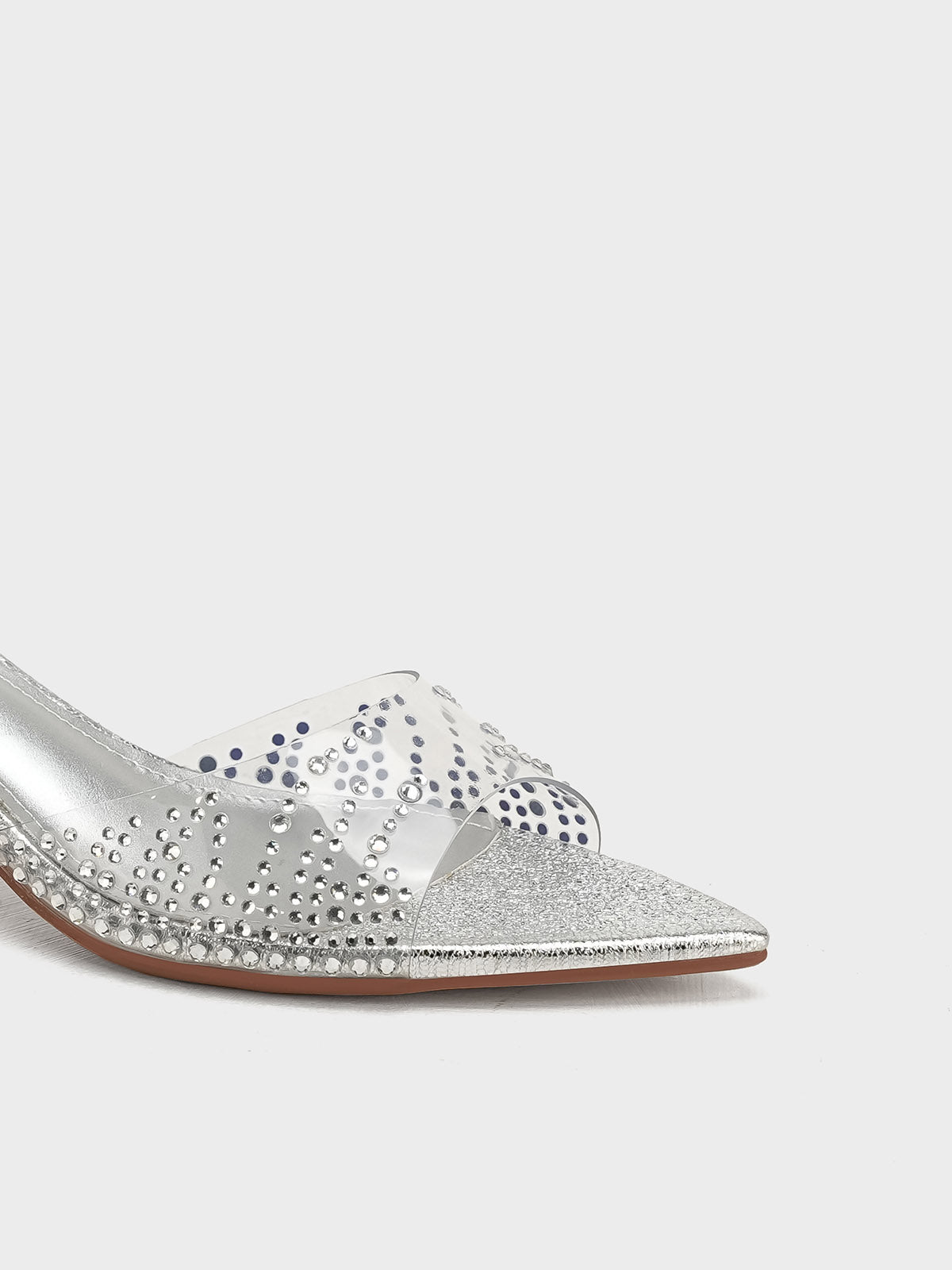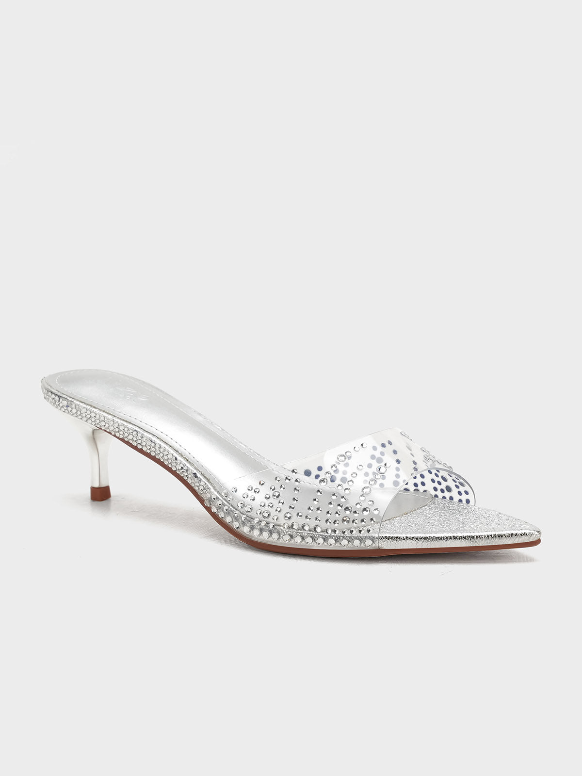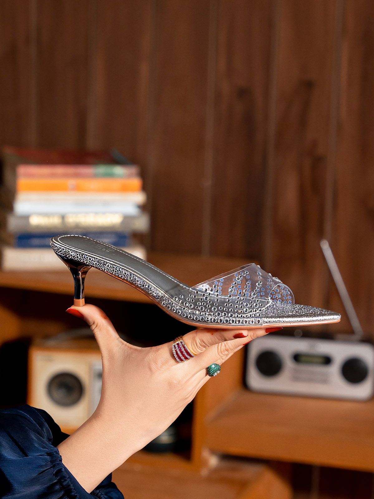 Step into elegance with these Women transparent Slip-On Fancy Sandals.Designed for effortless wear, the slip-on style ensures convenience without compromising on style. The clear heel creates a subtle yet striking look, perfect for parties, evening events where you want to shine.
