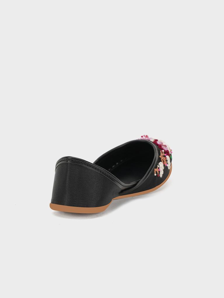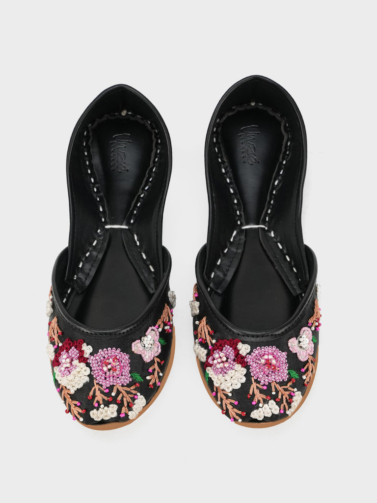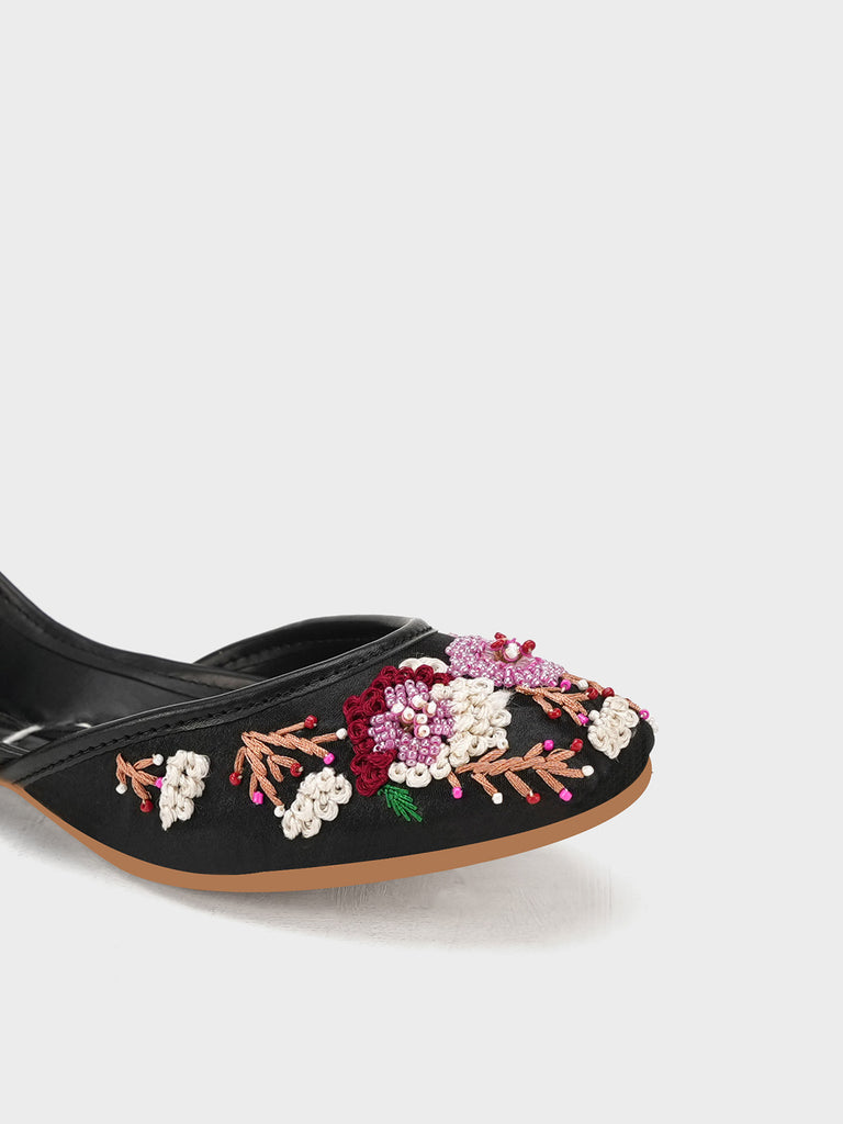 These women’s khussa shoes showcase timeless elegance with intricate hand embroidery on a sleek black base.They bring a vibrant touch of tradition and artistry. Crafted for comfort with a classic flat sole.
