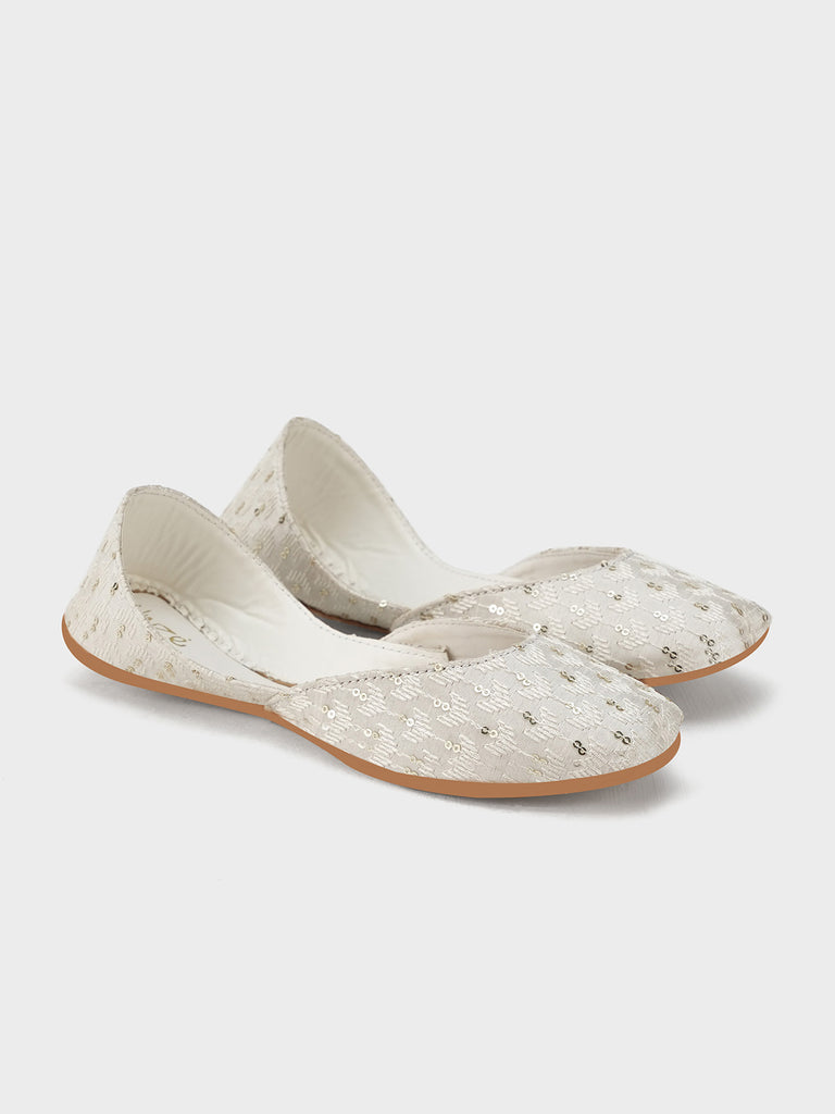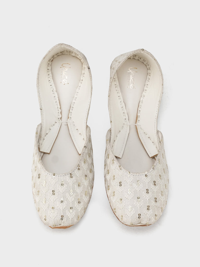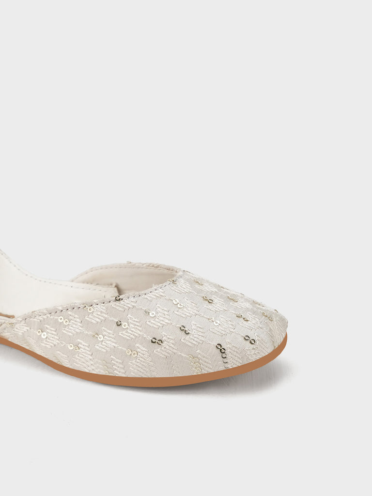This women’s khussa features a graceful ivory base adorned with delicate embroidery, adding a subtle touch of elegance. Designed with traditional craftsmanship and a comfortable flat sole, it blends cultural heritage with modern charm.
