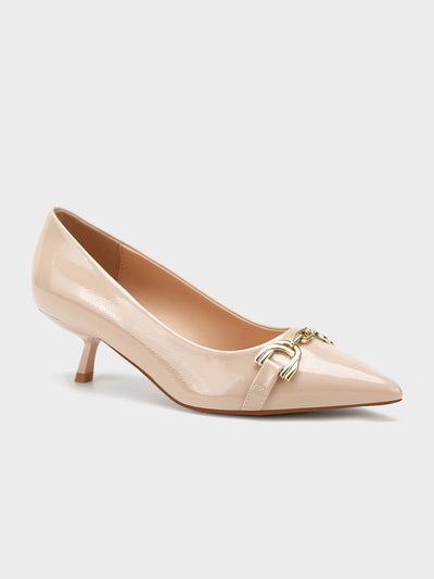 Add a touch of class to your look with these stunning pointed-toe court shoes. Featuring a sleek patent finish and a delicate gold buckle detail, they offer timeless elegance with a modern twist.