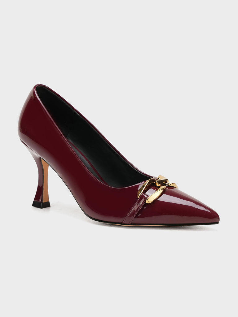 These elegant women’s court shoes feature a sleek pointed toe and a shiny patent finish. Designed with a comfortable kitten heel, they are perfect for both formal and evening wear.
