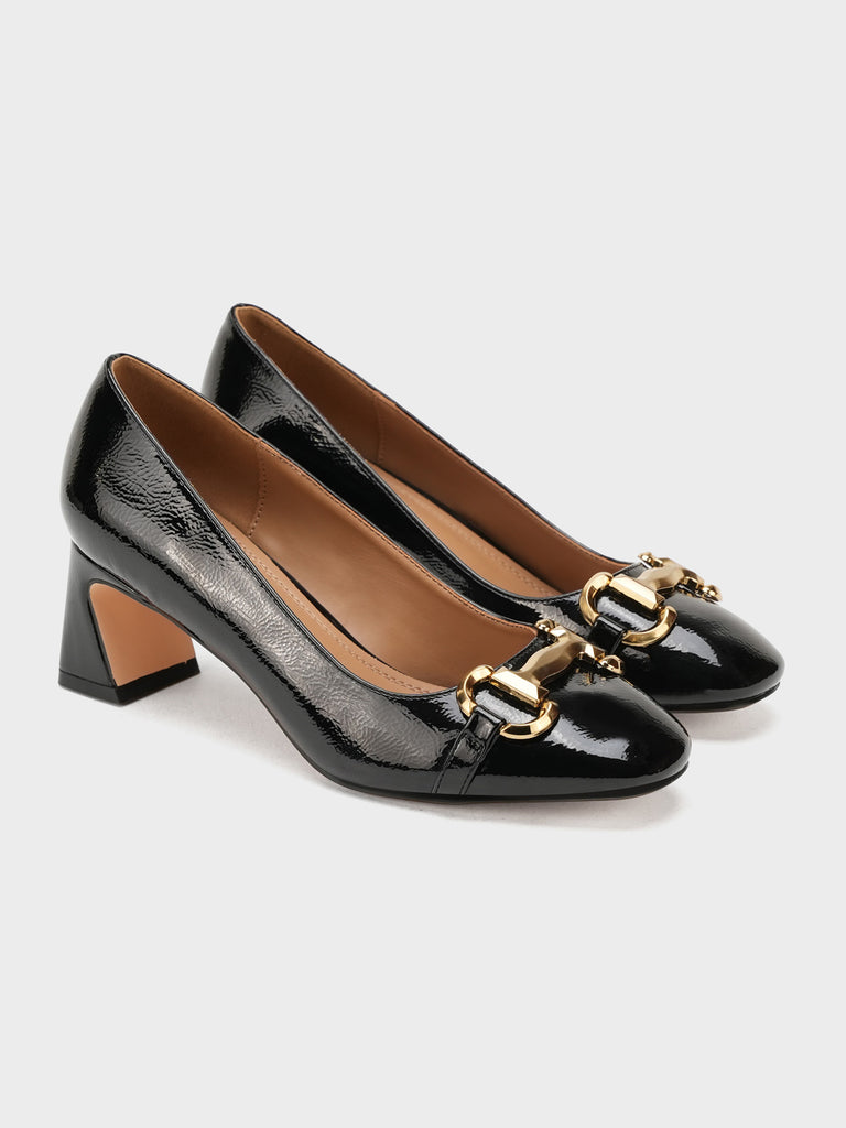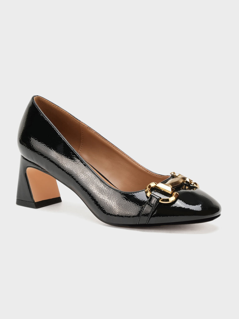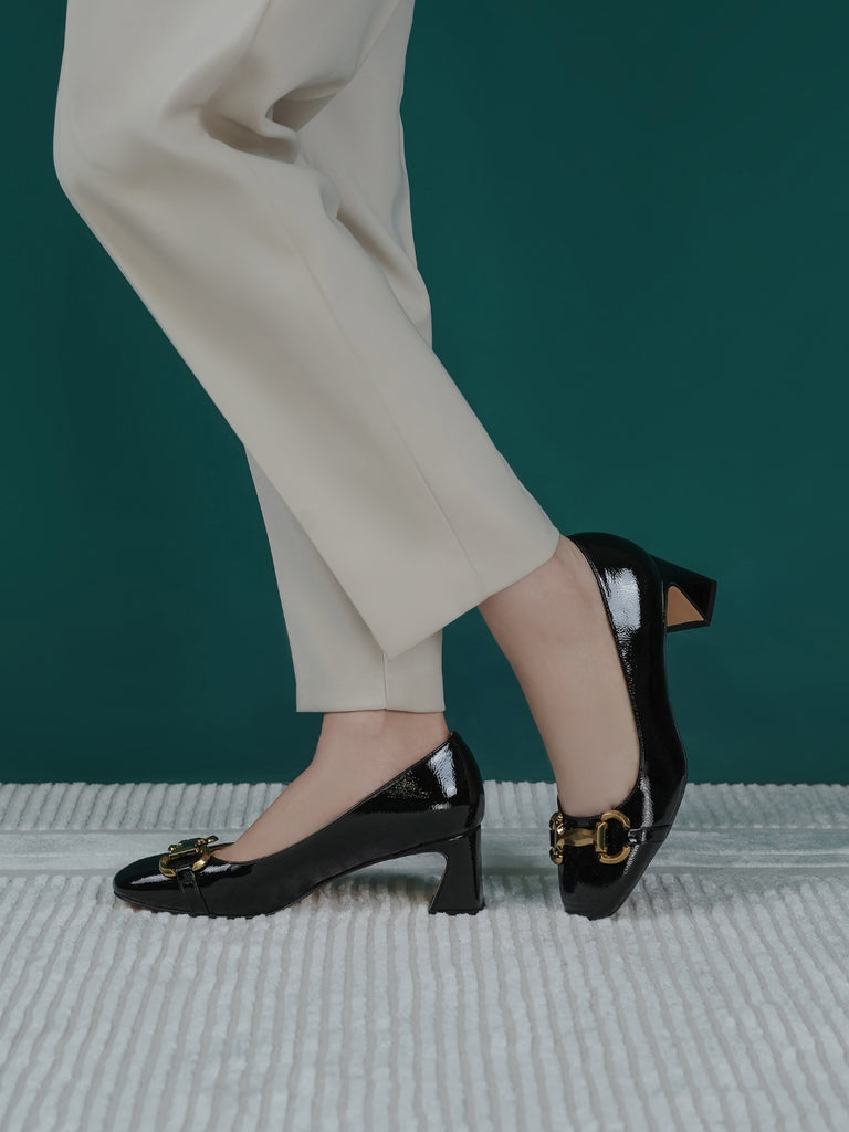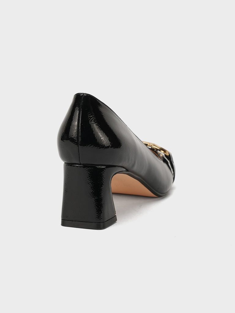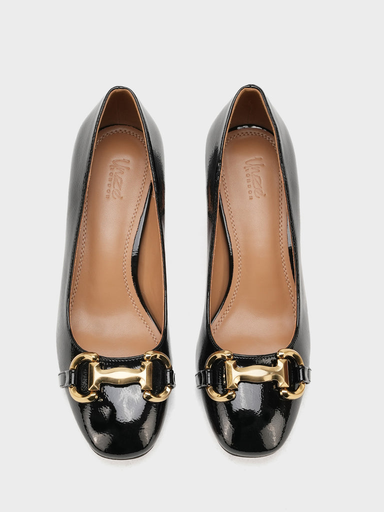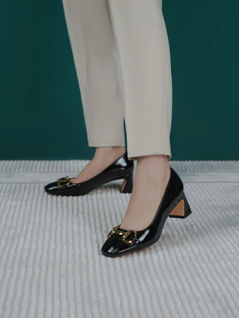 Add elegance to your step with these chic women’s low heel court shoes. Featuring a glossy finish and a bold chain detail on the front, these shoes blend sophistication with comfort.