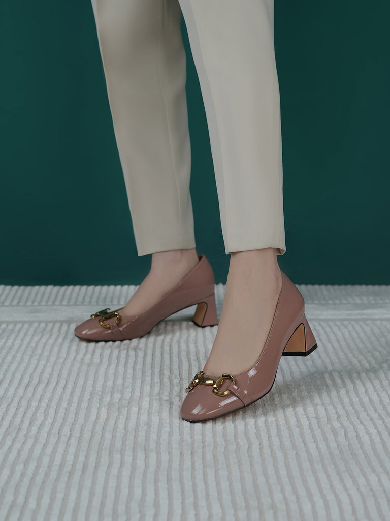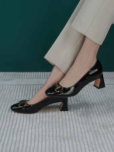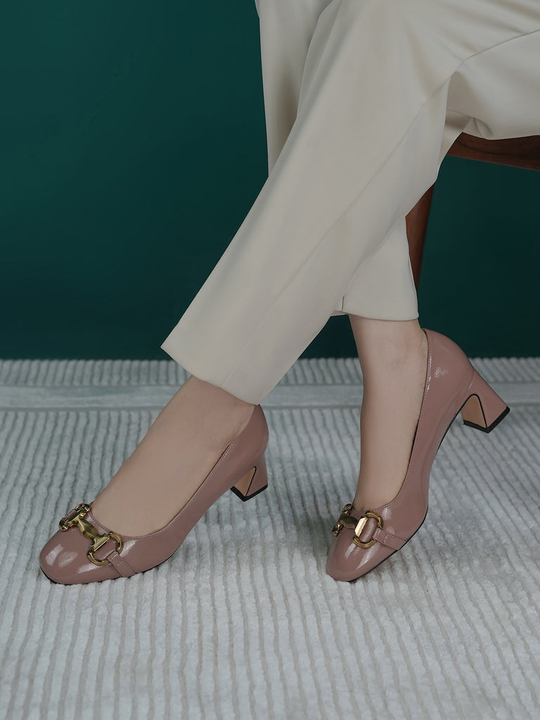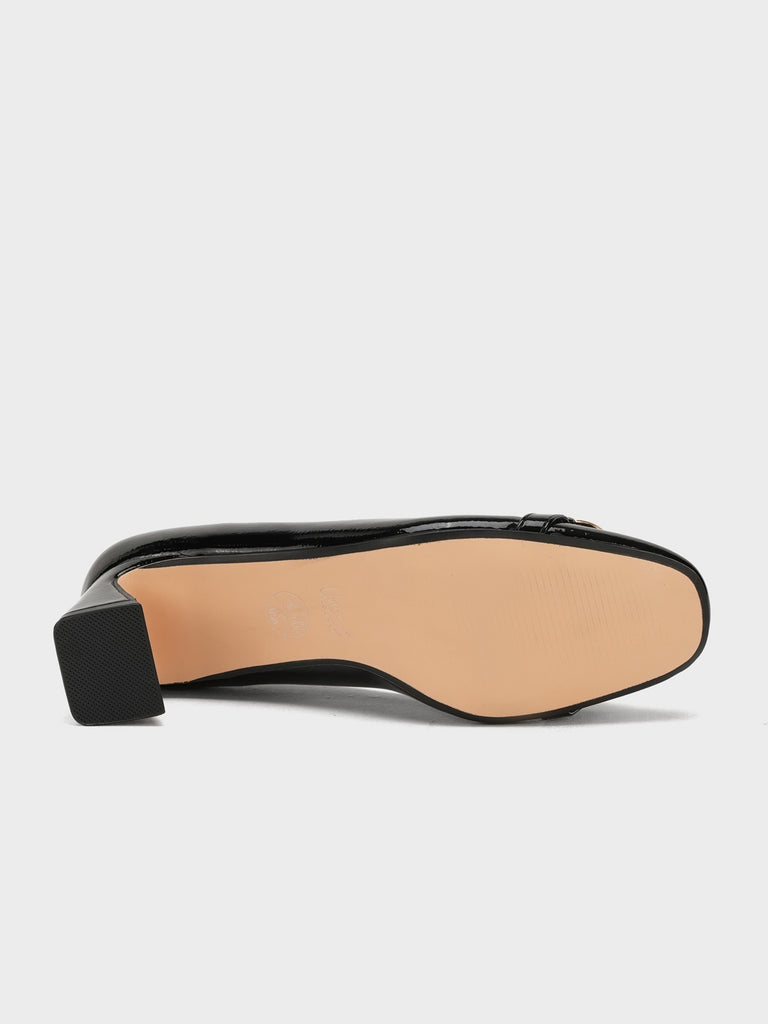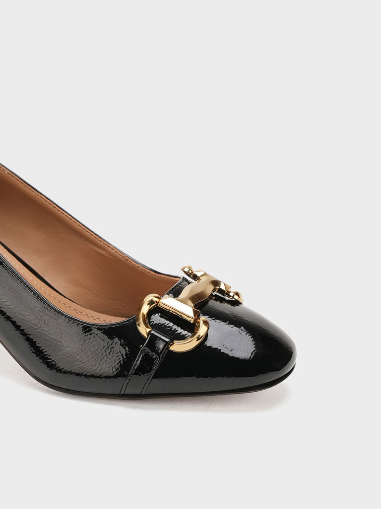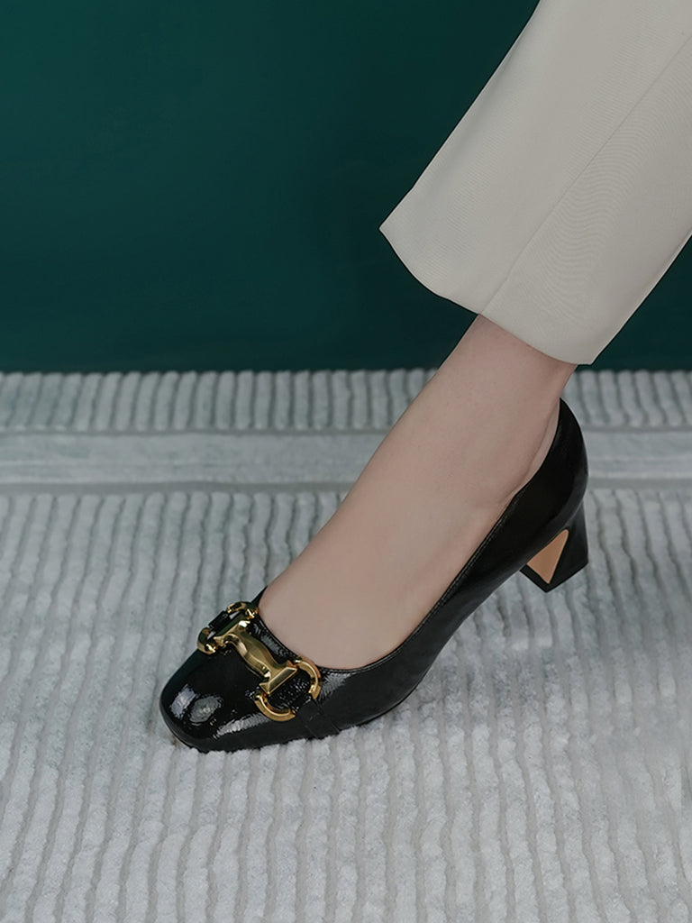 Add elegance to your step with these chic women’s low heel court shoes. Featuring a glossy finish and a bold chain detail on the front, these shoes blend sophistication with comfort.