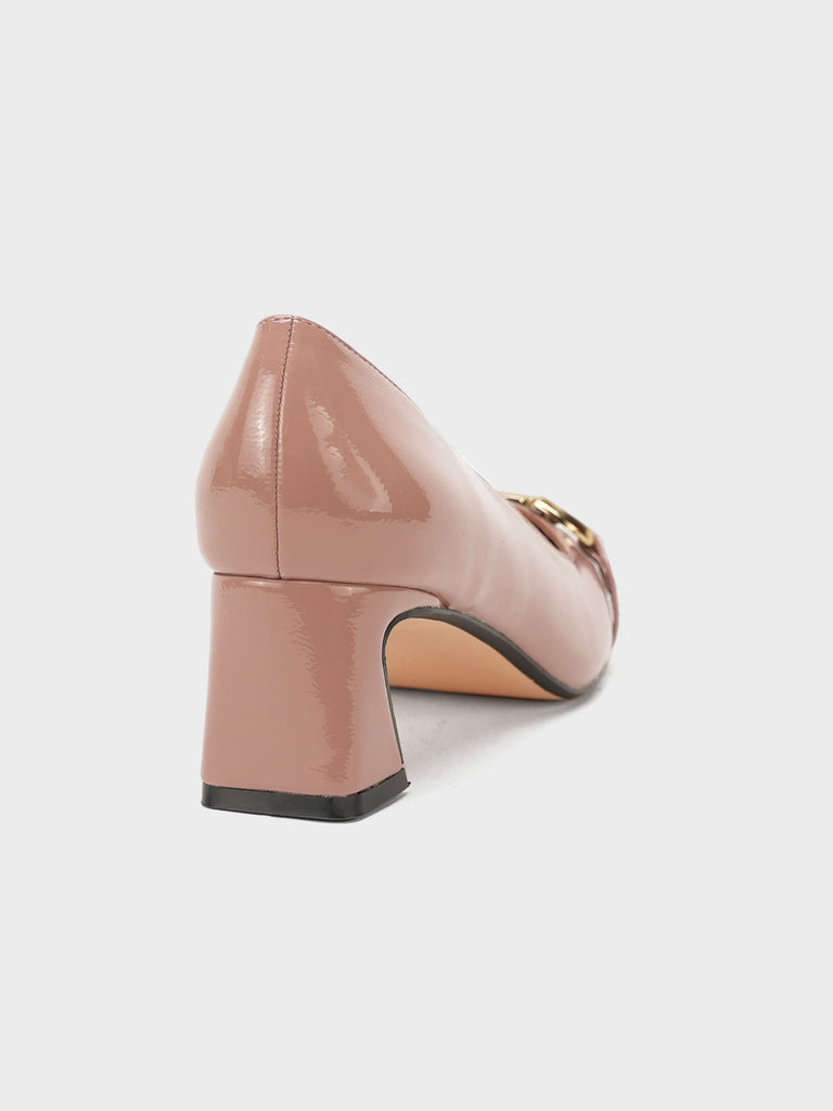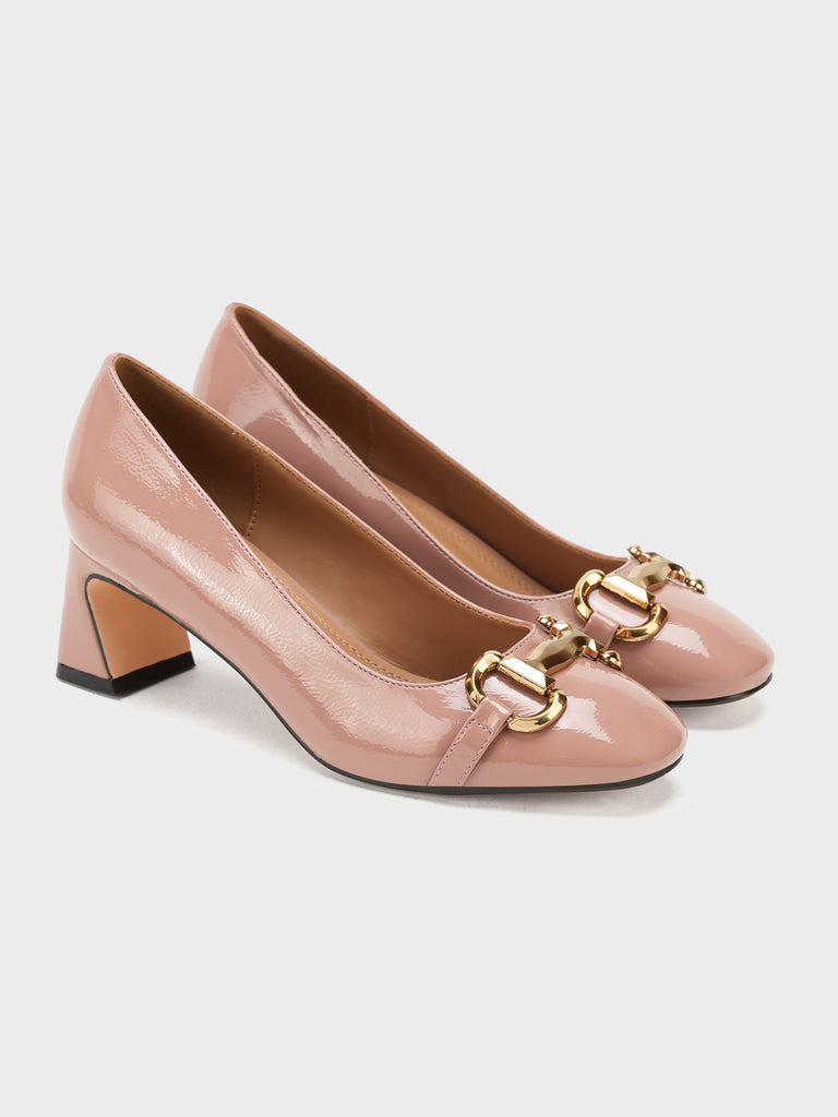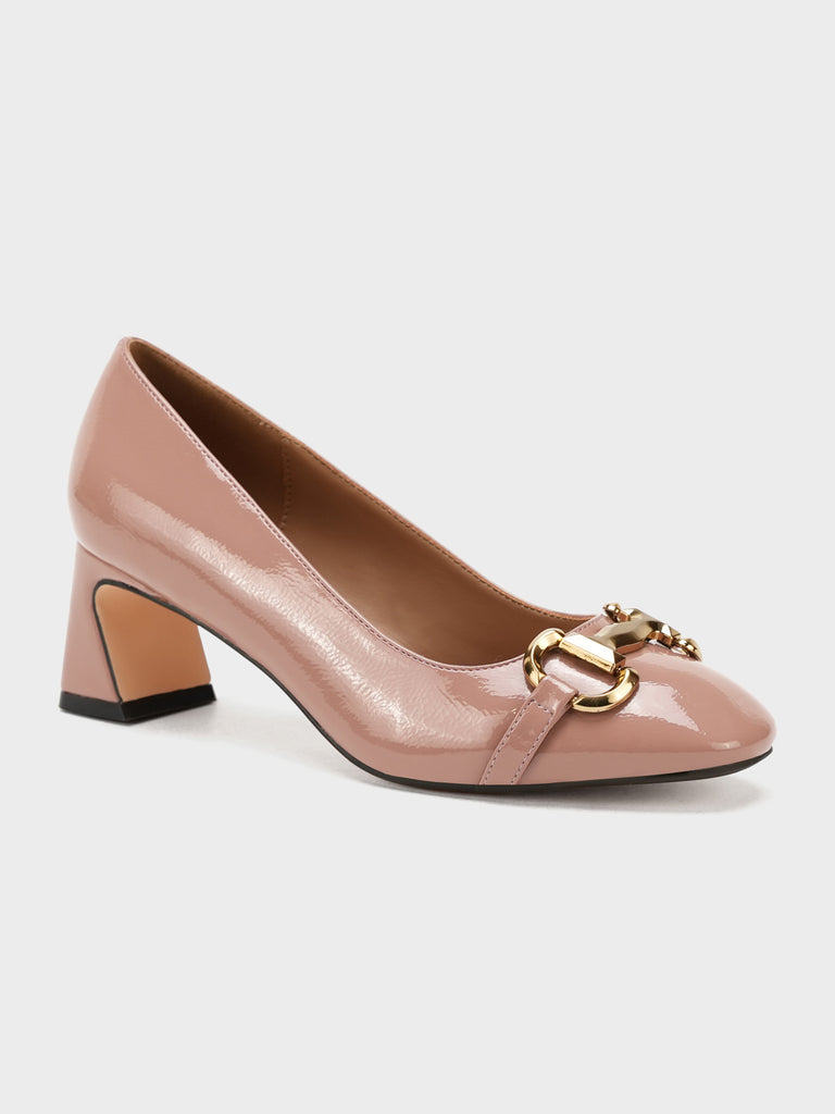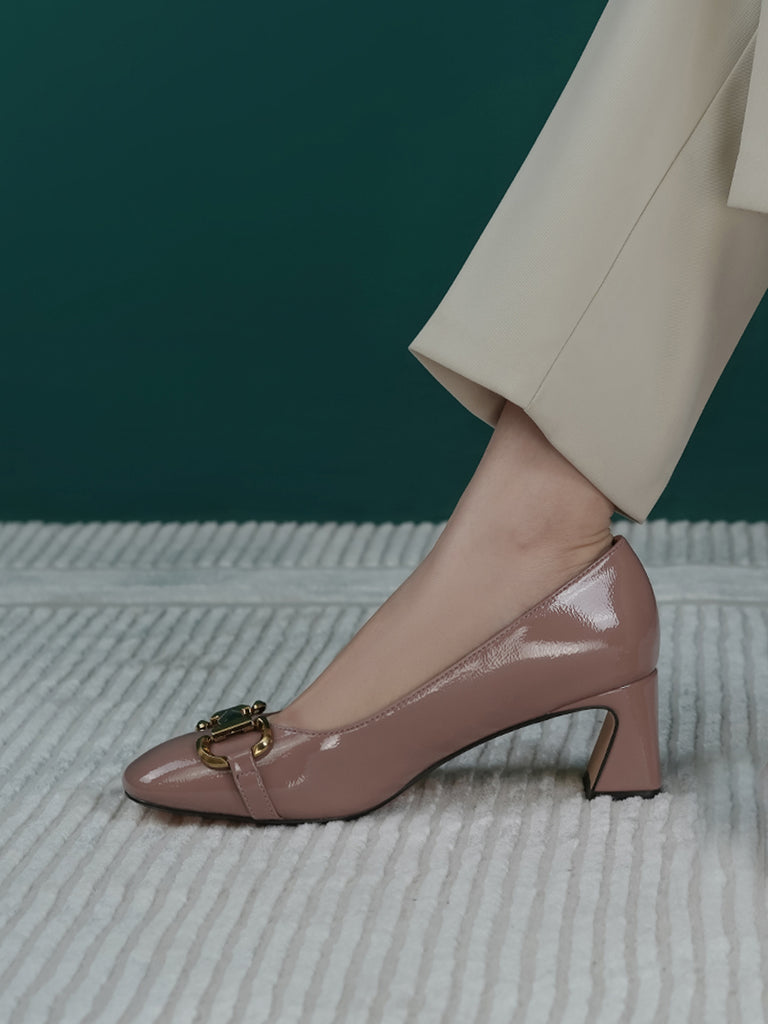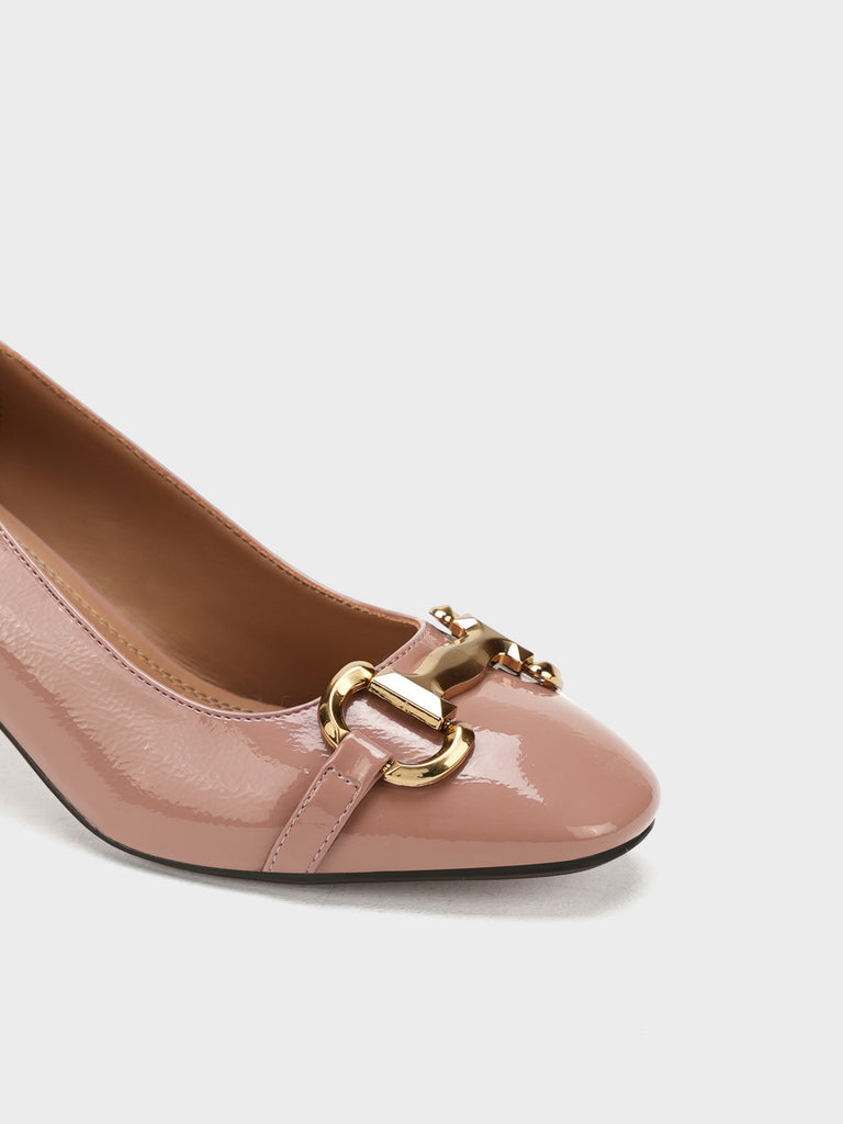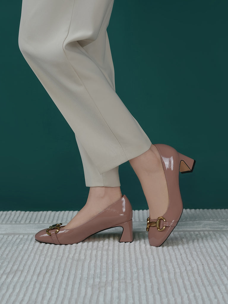 Add elegance to your step with these chic women’s low heel court shoes. Featuring a glossy finish and a bold chain detail on the front, these shoes blend sophistication with comfort.