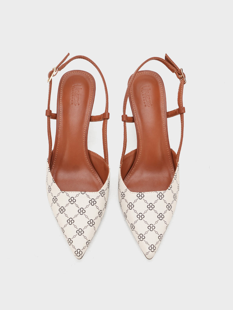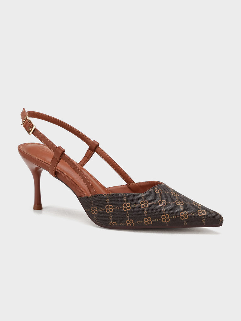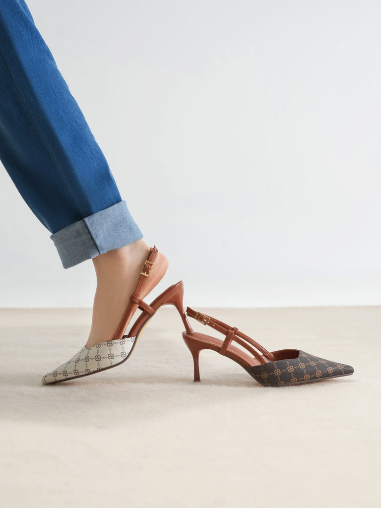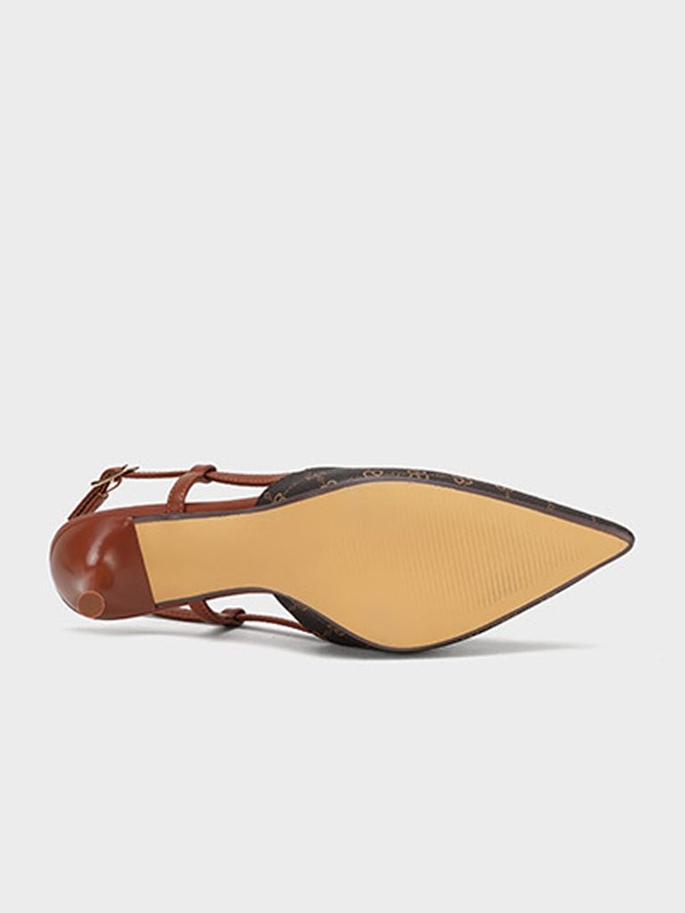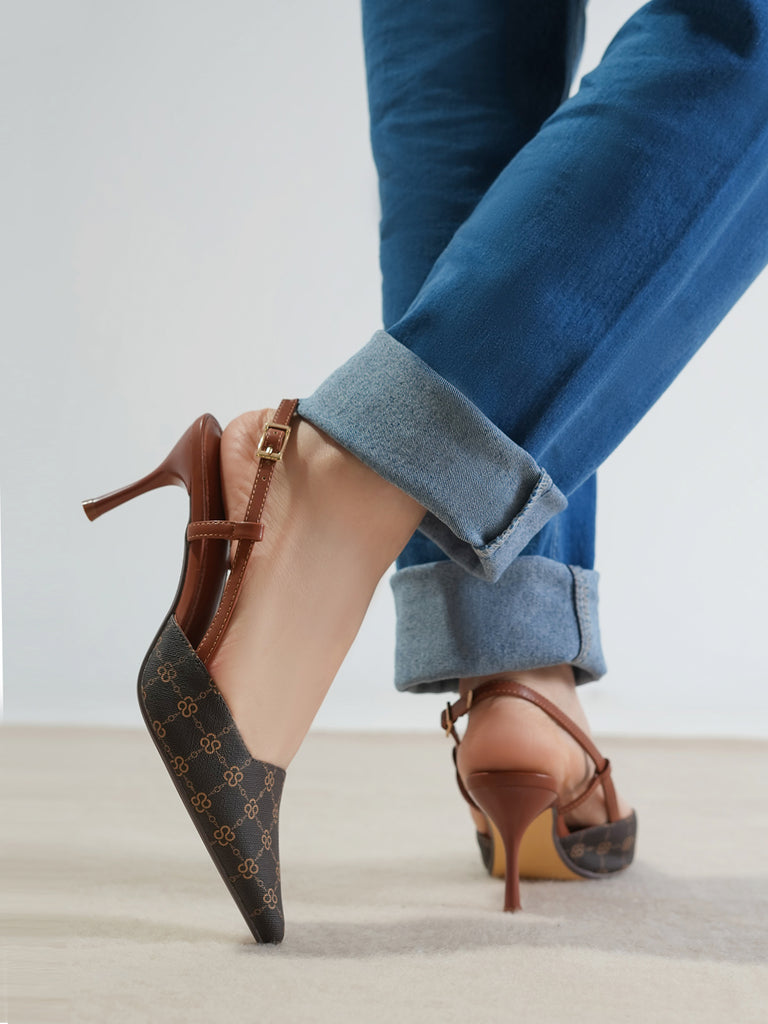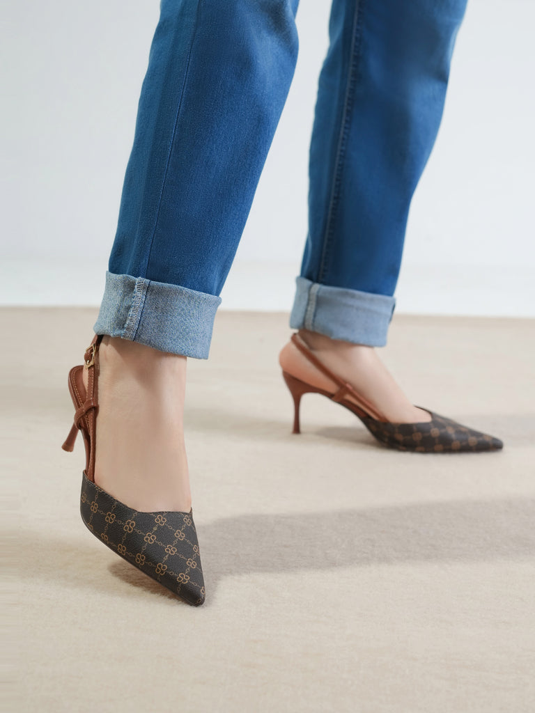 This women’s sandal showcases a sleek pointed toe with a stylish printed design, paired with a slim buckle strap for a secure fit. The slingback straps and stiletto heel add a touch of elegance, making it perfect for formal events, parties, or stylish day wear.