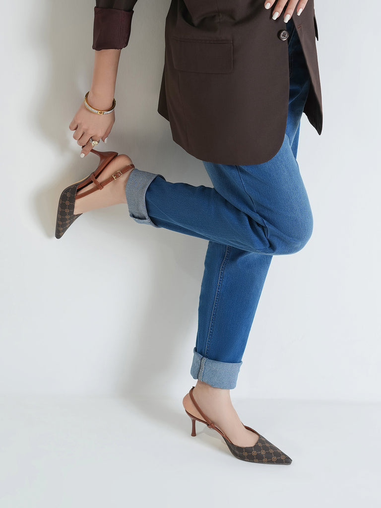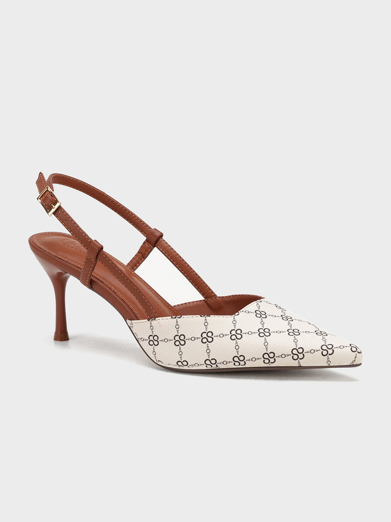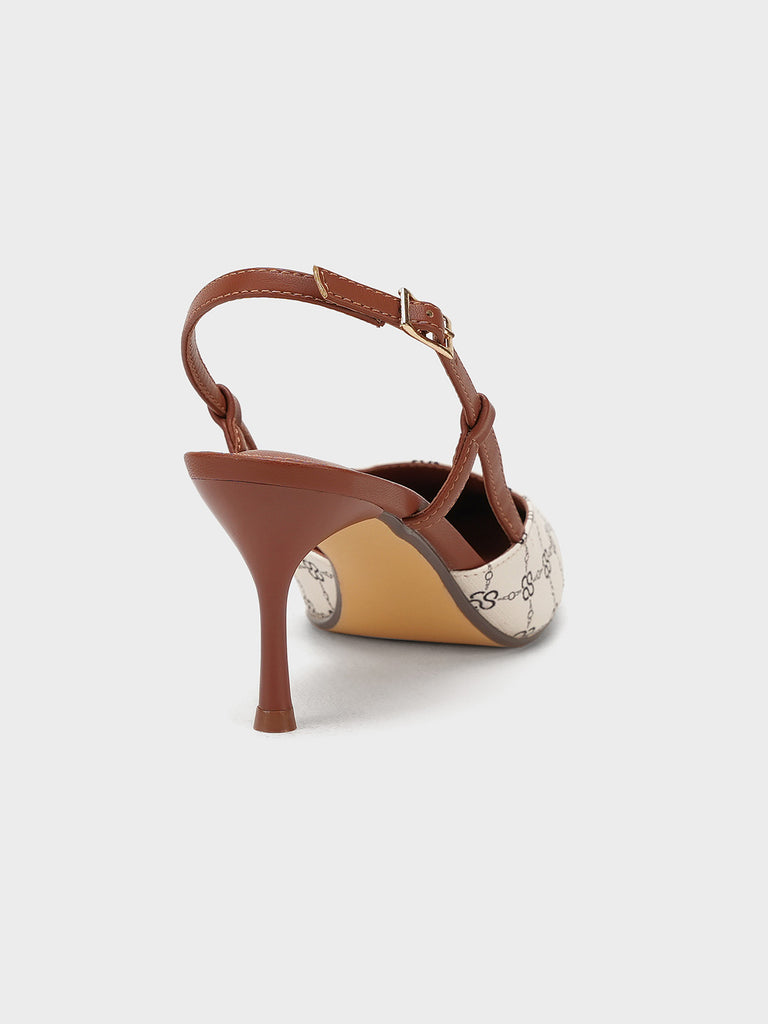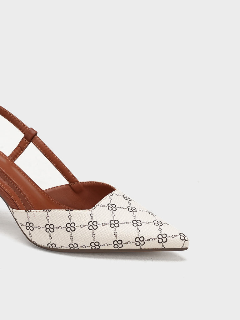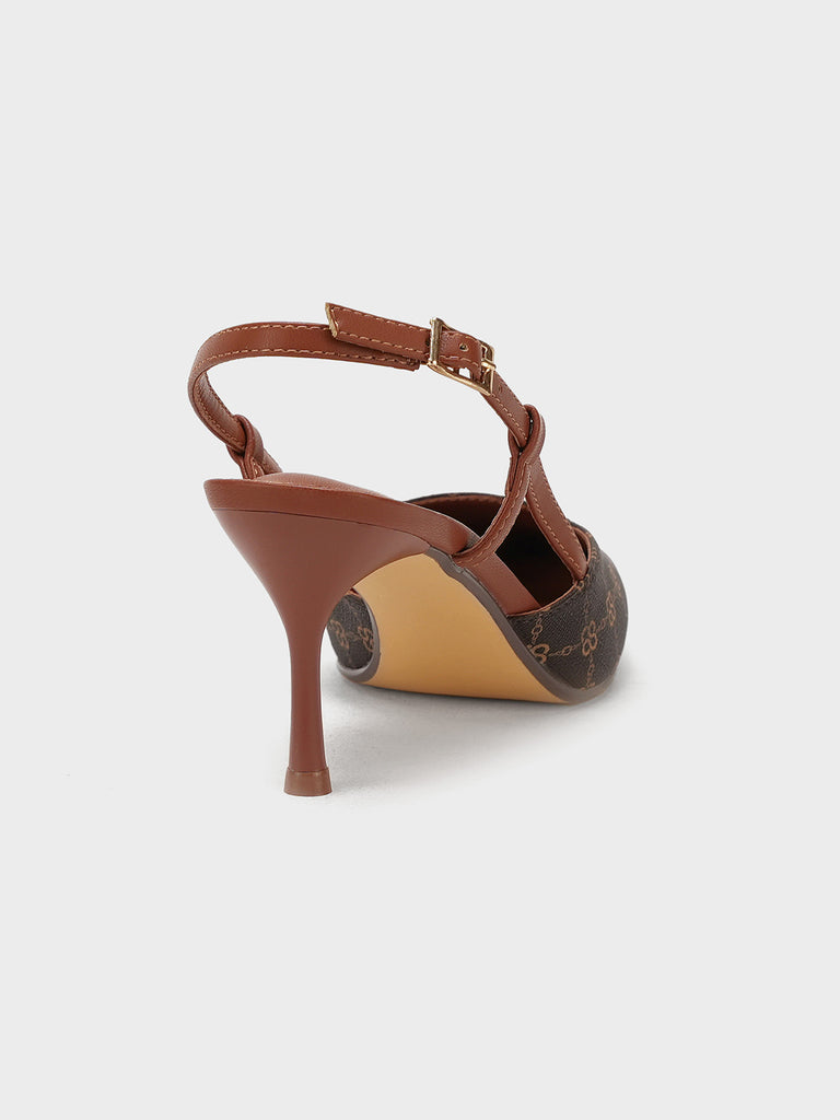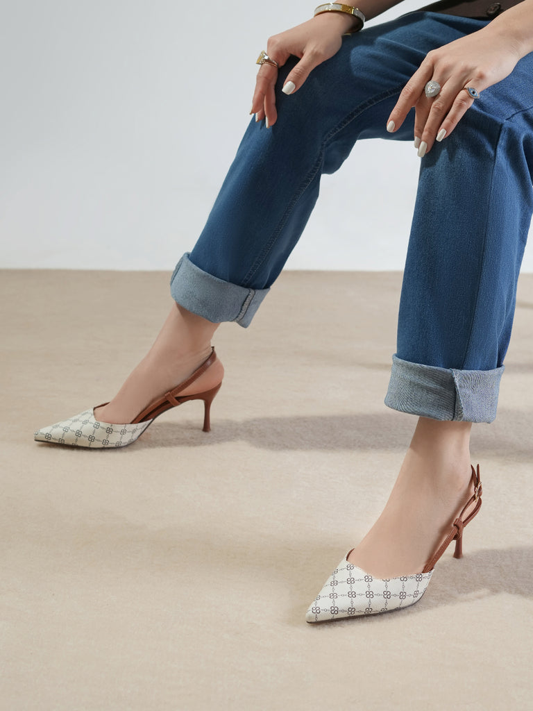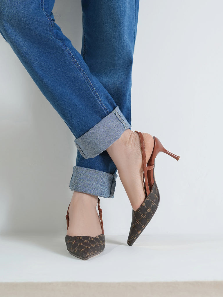 This women’s sandal showcases a sleek pointed toe with a stylish printed design, paired with a slim buckle strap for a secure fit. The slingback straps and stiletto heel add a touch of elegance, making it perfect for formal events, parties, or stylish day wear.