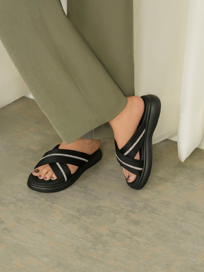 Enjoy effortless style and comfort with these open-toe cross over fabric designed casual slippers. Designed with a padded sole and a breathable fit, they’re an ideal choice for warm-weather days or indoor wear.