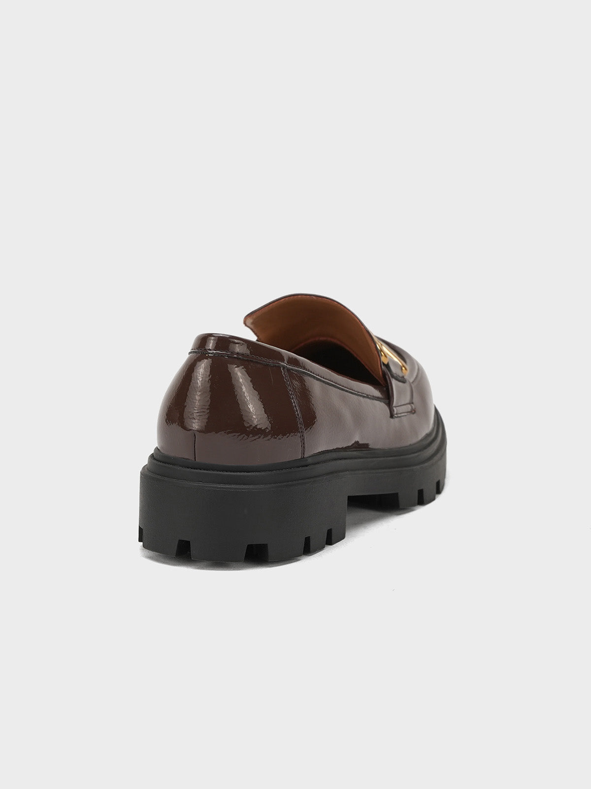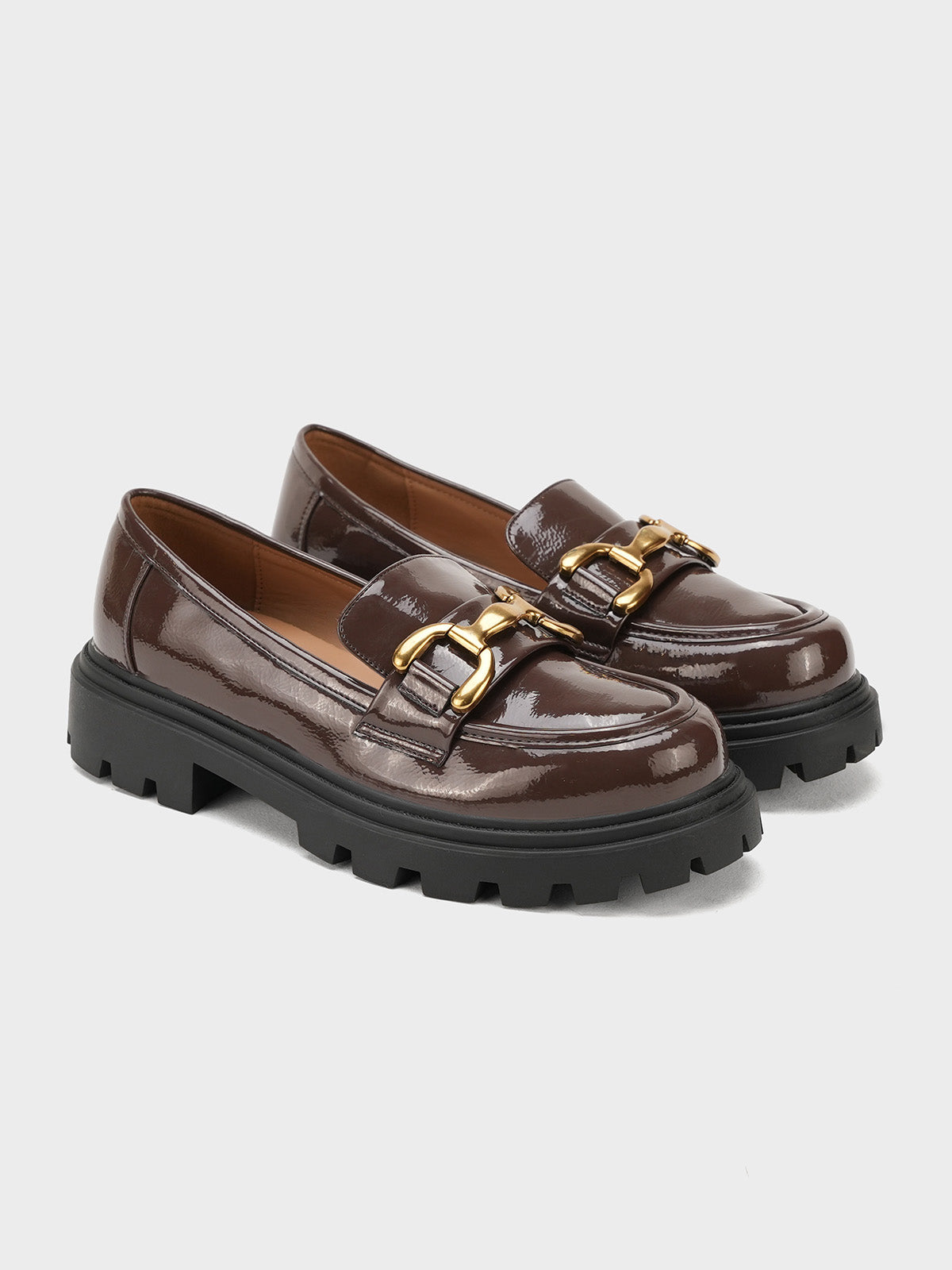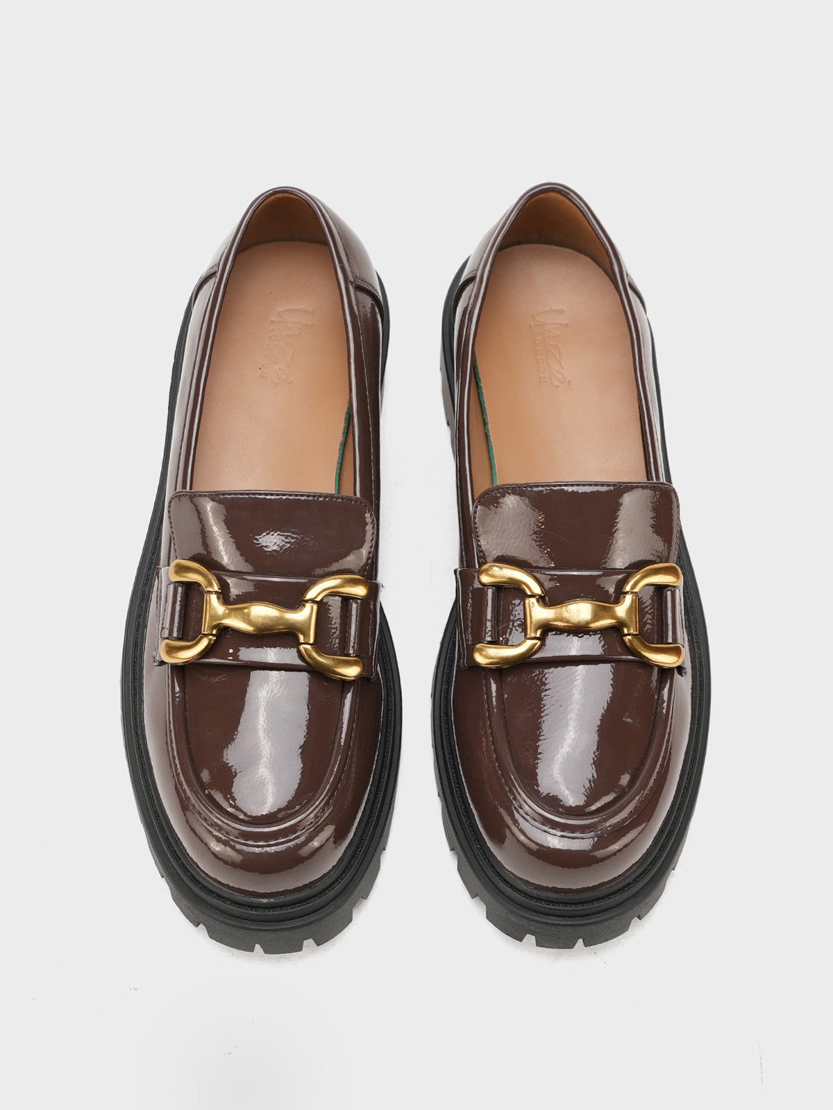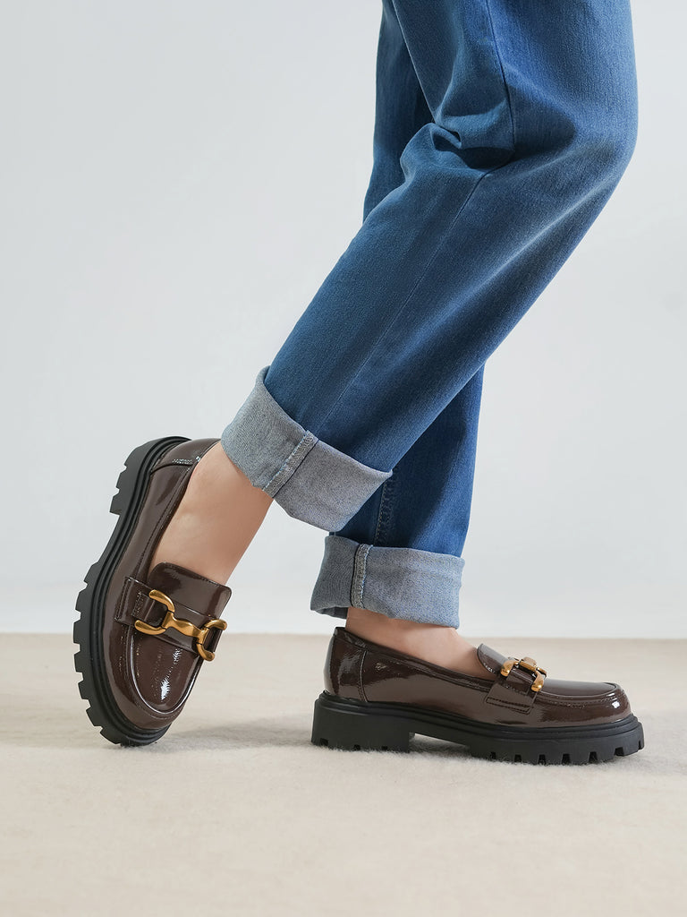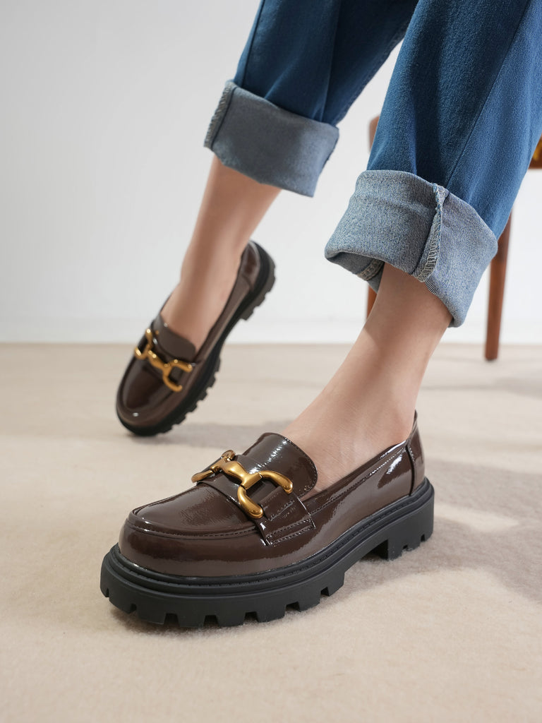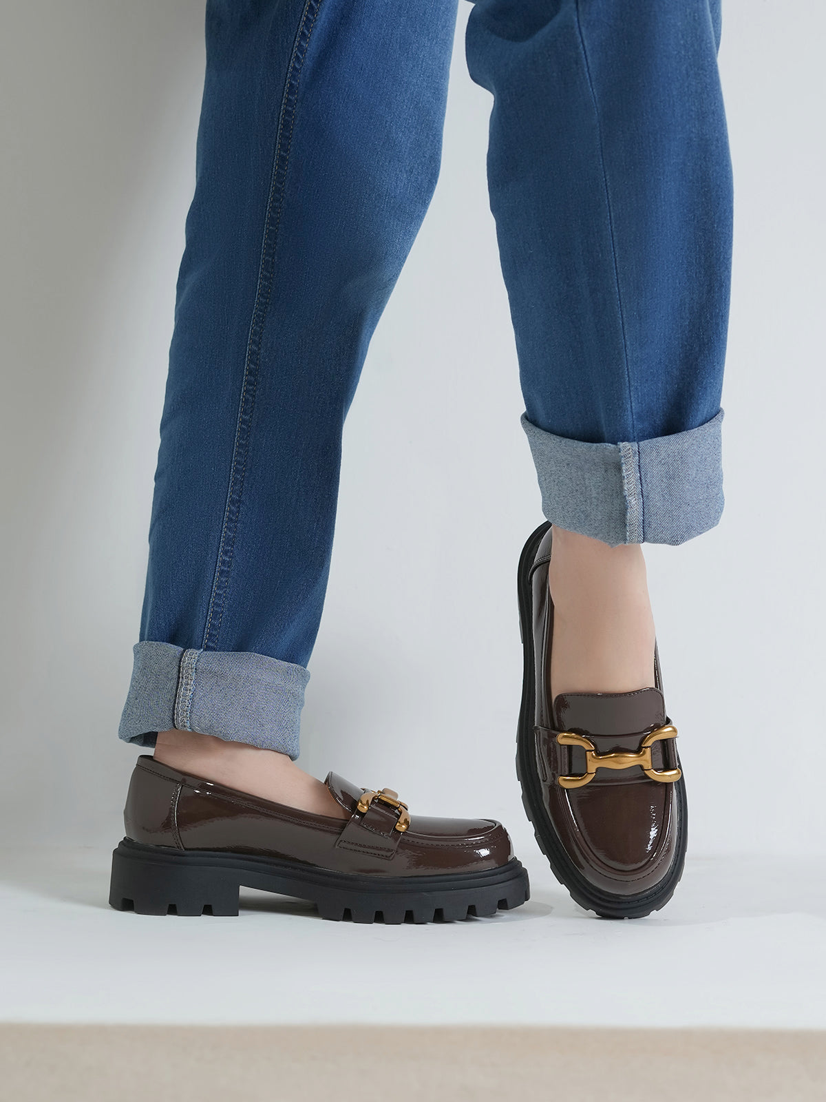 Elevate your everyday look with these stylish women’s loafers. Featuring a glossy finish and chunky sole for extra grip and height, these loafers combine fashion with function. The bold gold chain detail adds a touch of elegance, making them perfect for both casual and semi-formal outfits.
