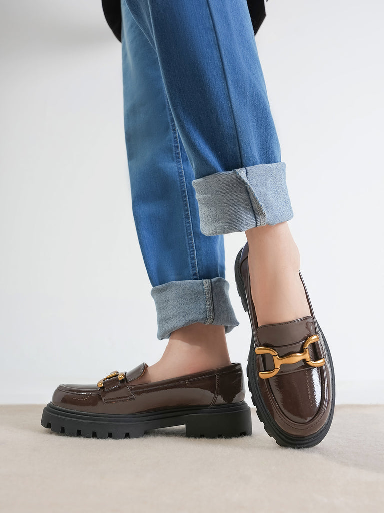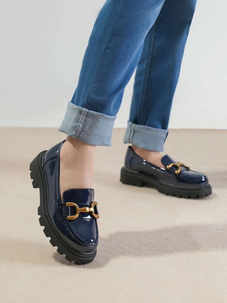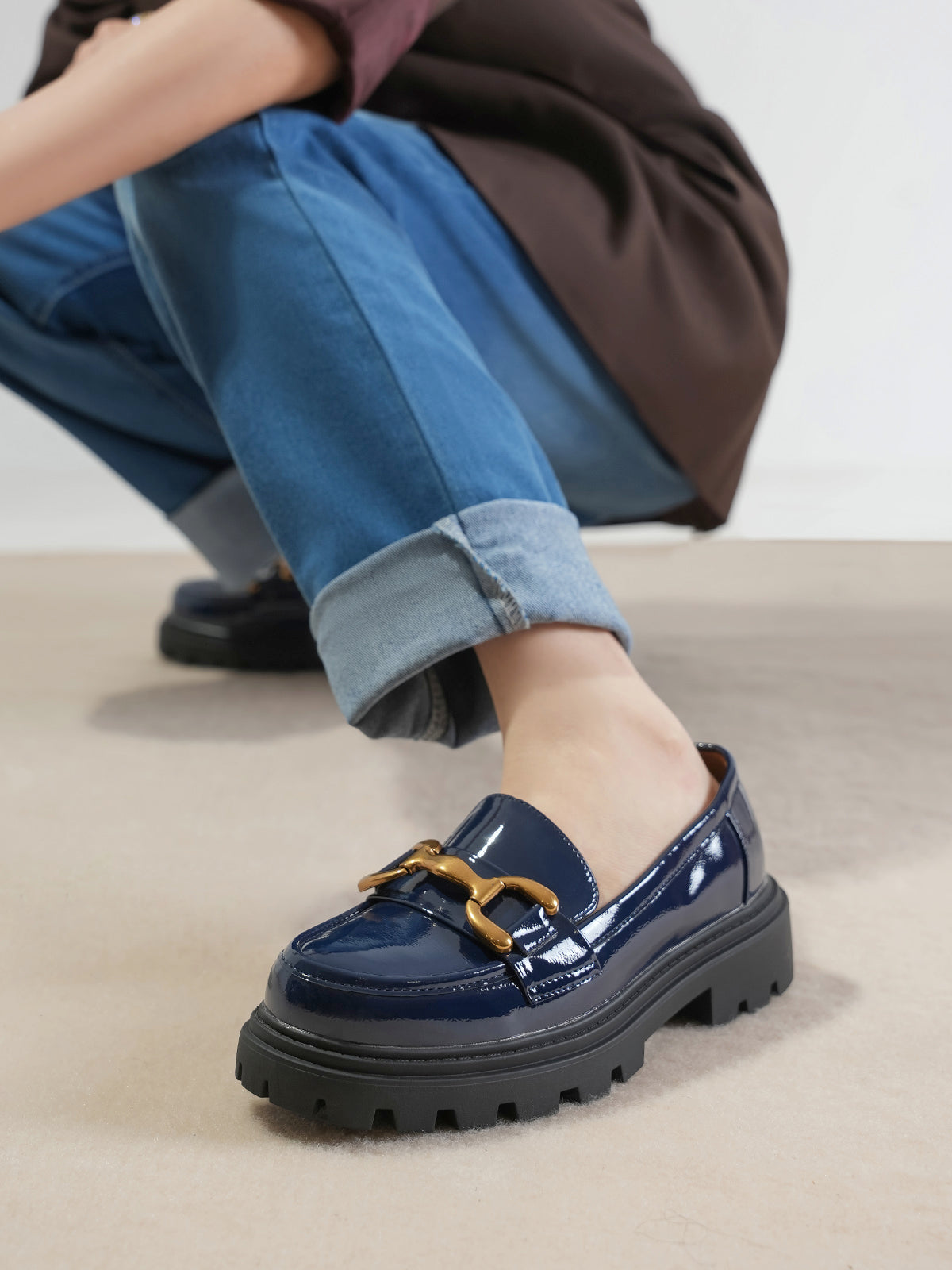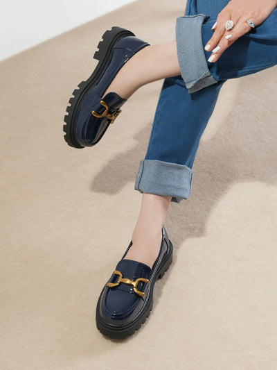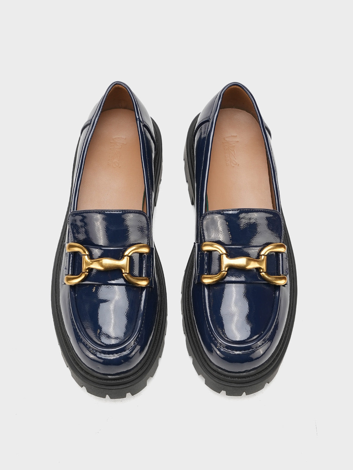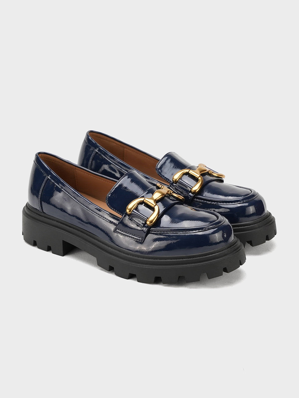 Elevate your everyday look with these stylish women’s loafers. Featuring a glossy finish and chunky sole for extra grip and height, these loafers combine fashion with function. The bold gold chain detail adds a touch of elegance, making them perfect for both casual and semi-formal outfits.