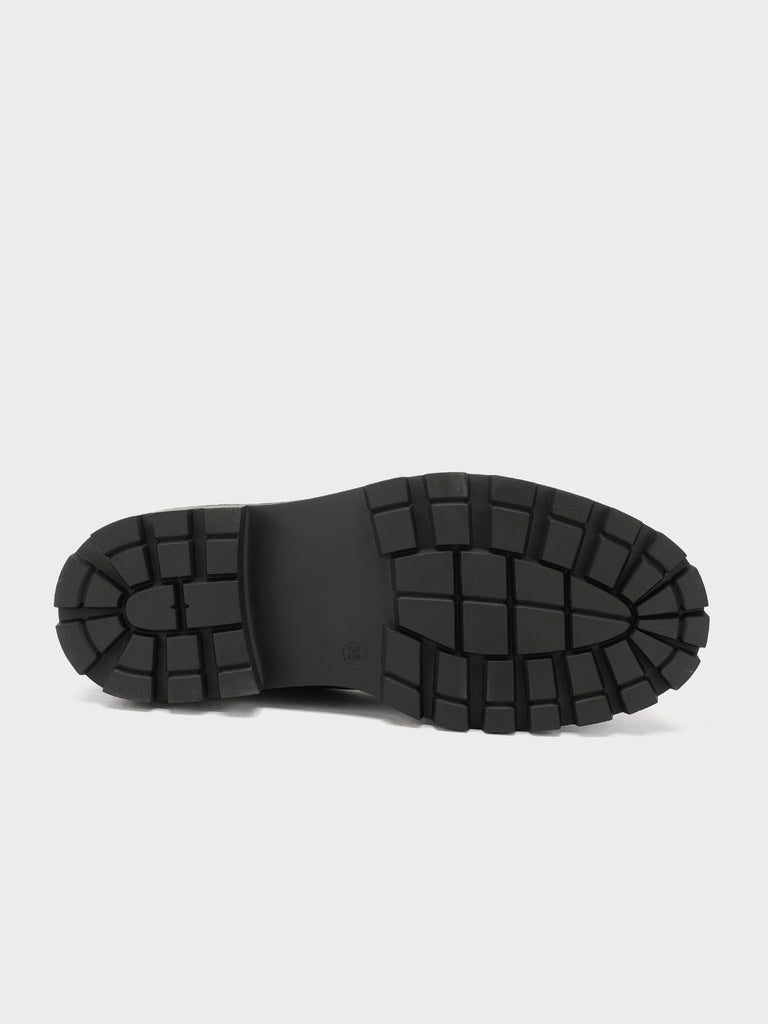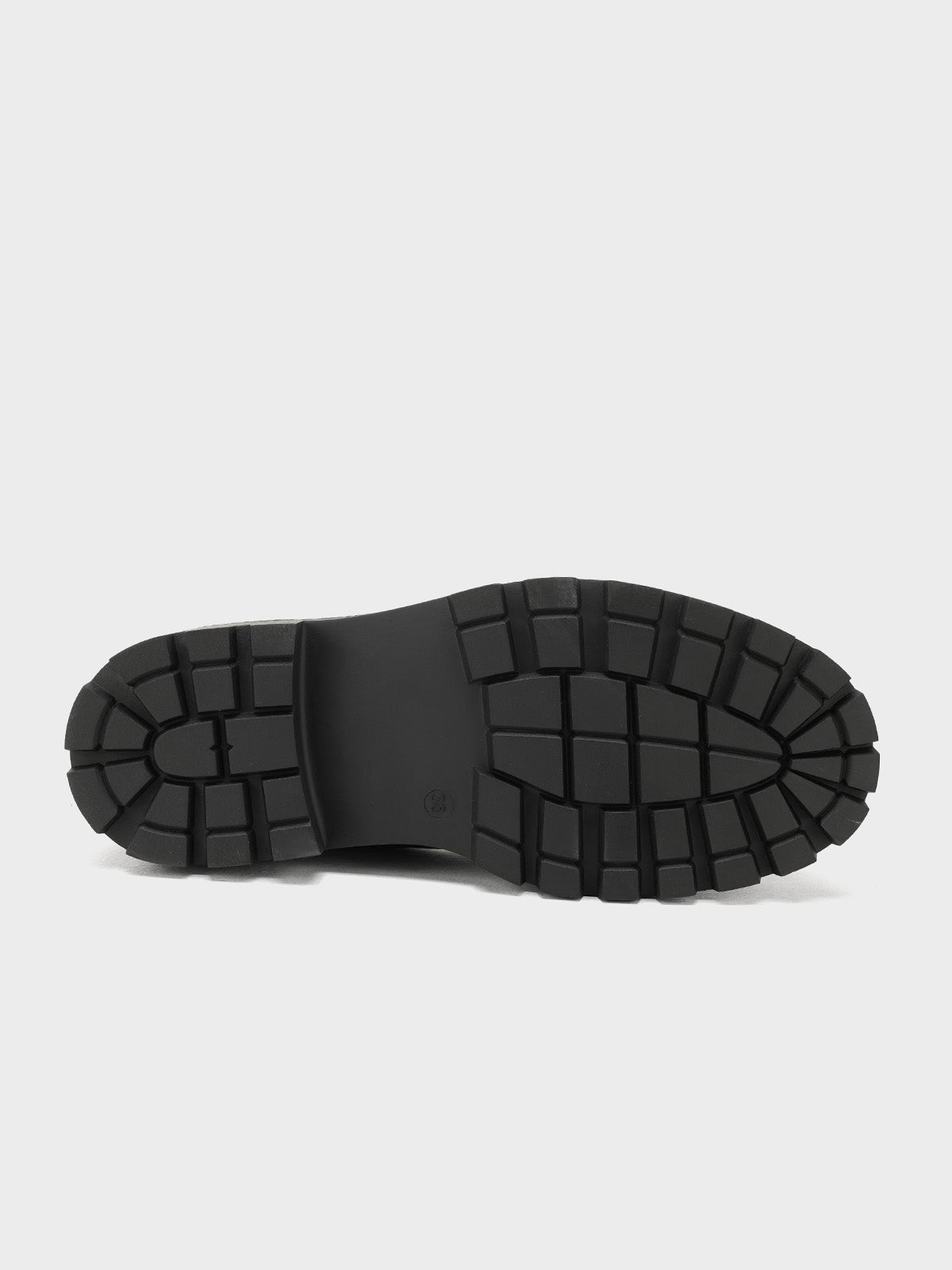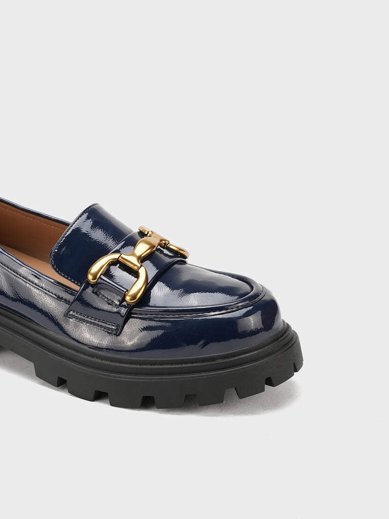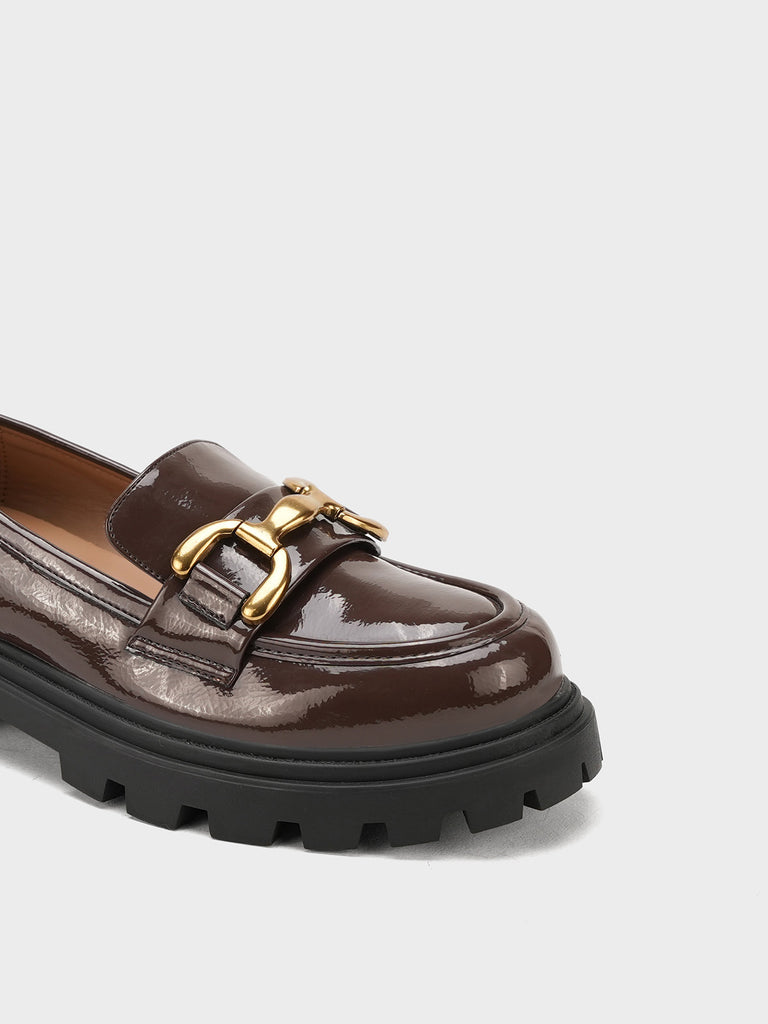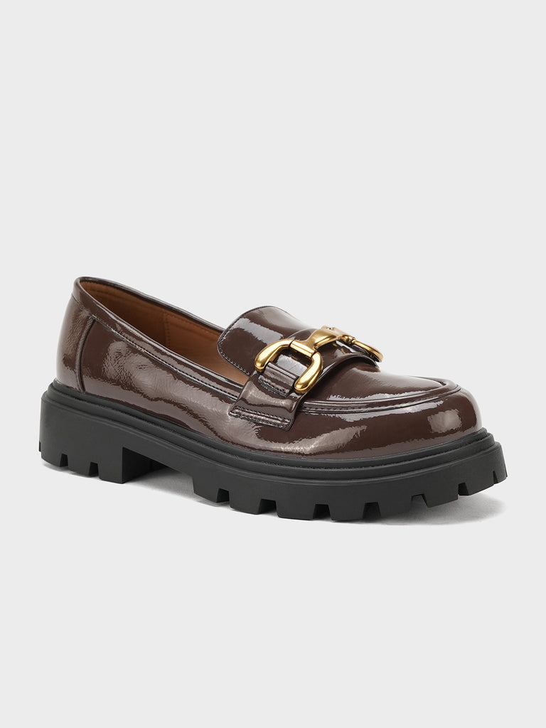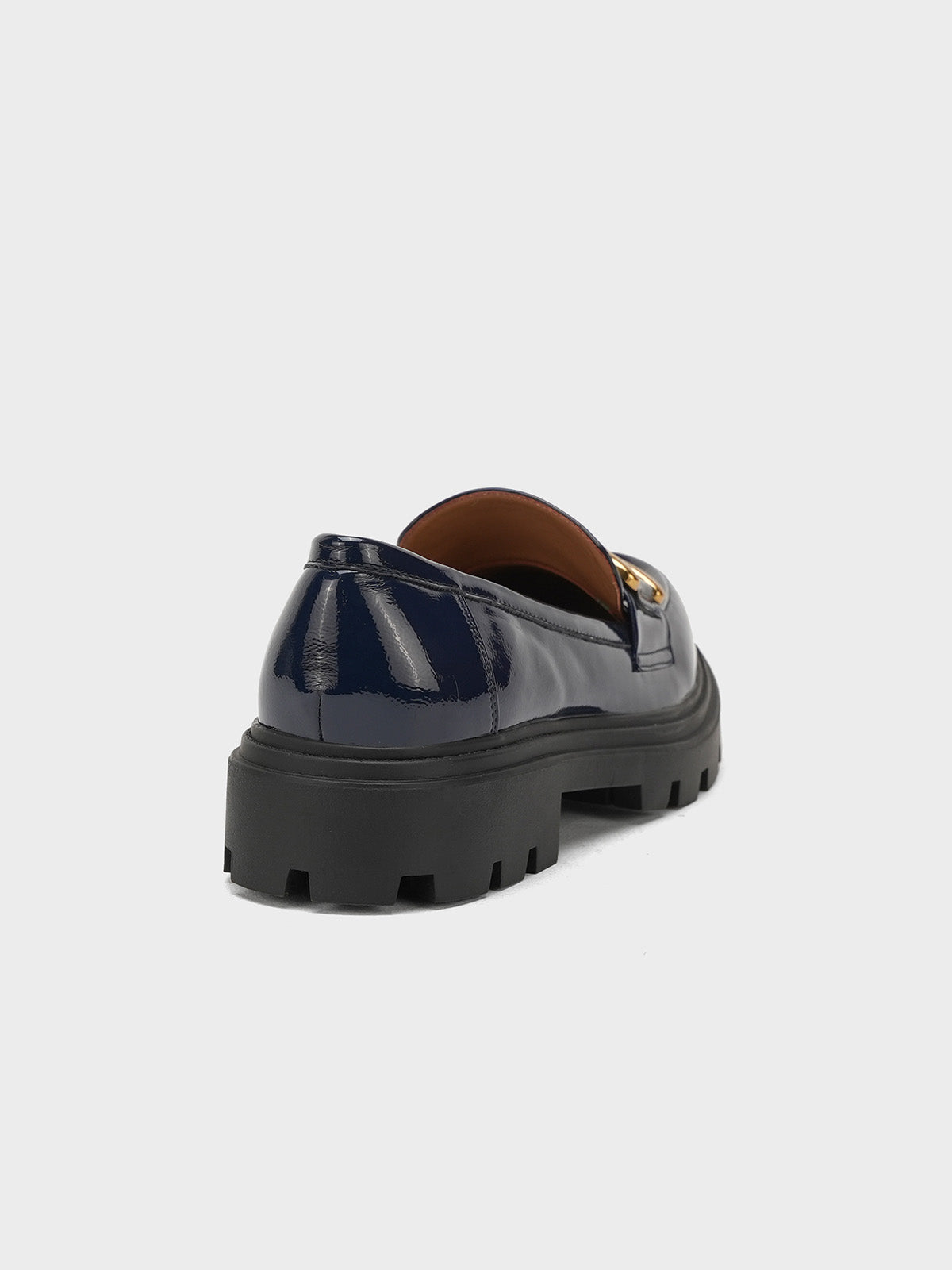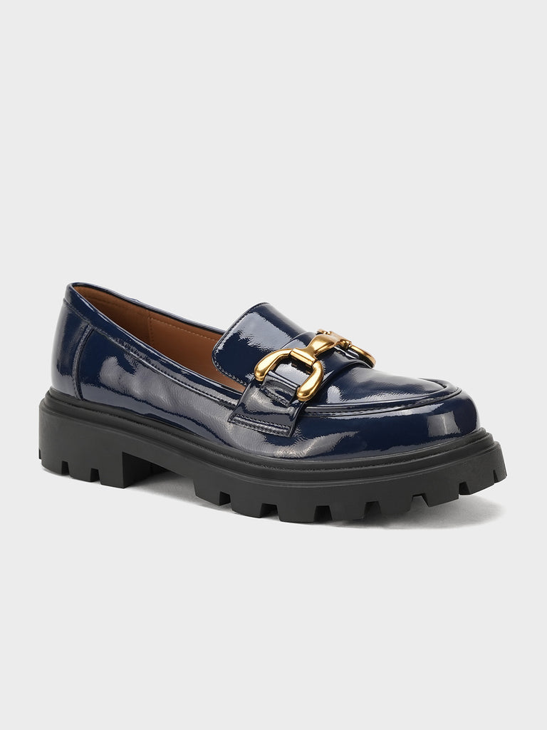 Elevate your everyday look with these stylish women’s loafers. Featuring a glossy finish and chunky sole for extra grip and height, these loafers combine fashion with function. The bold gold chain detail adds a touch of elegance, making them perfect for both casual and semi-formal outfits.
