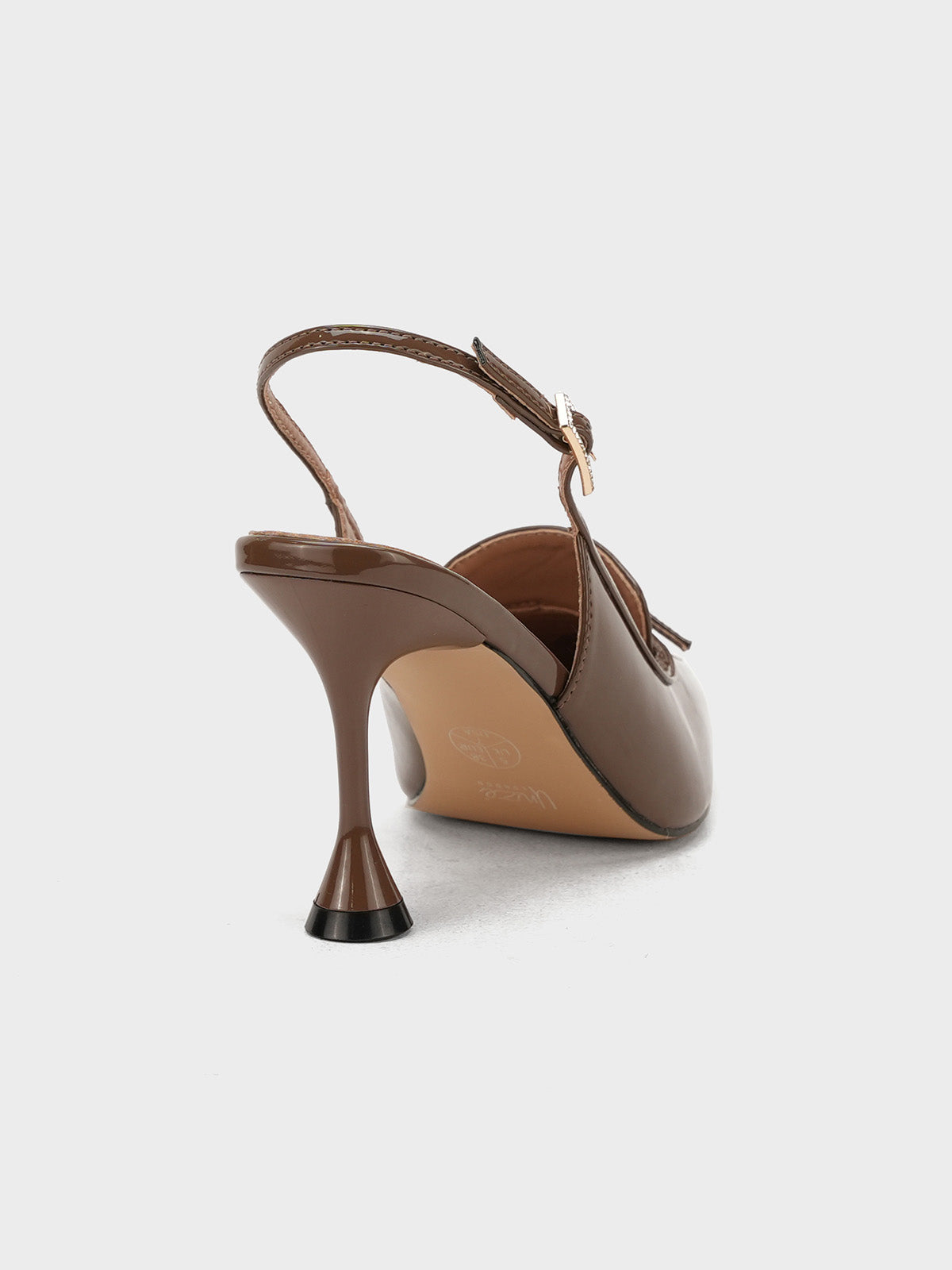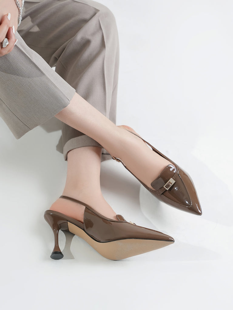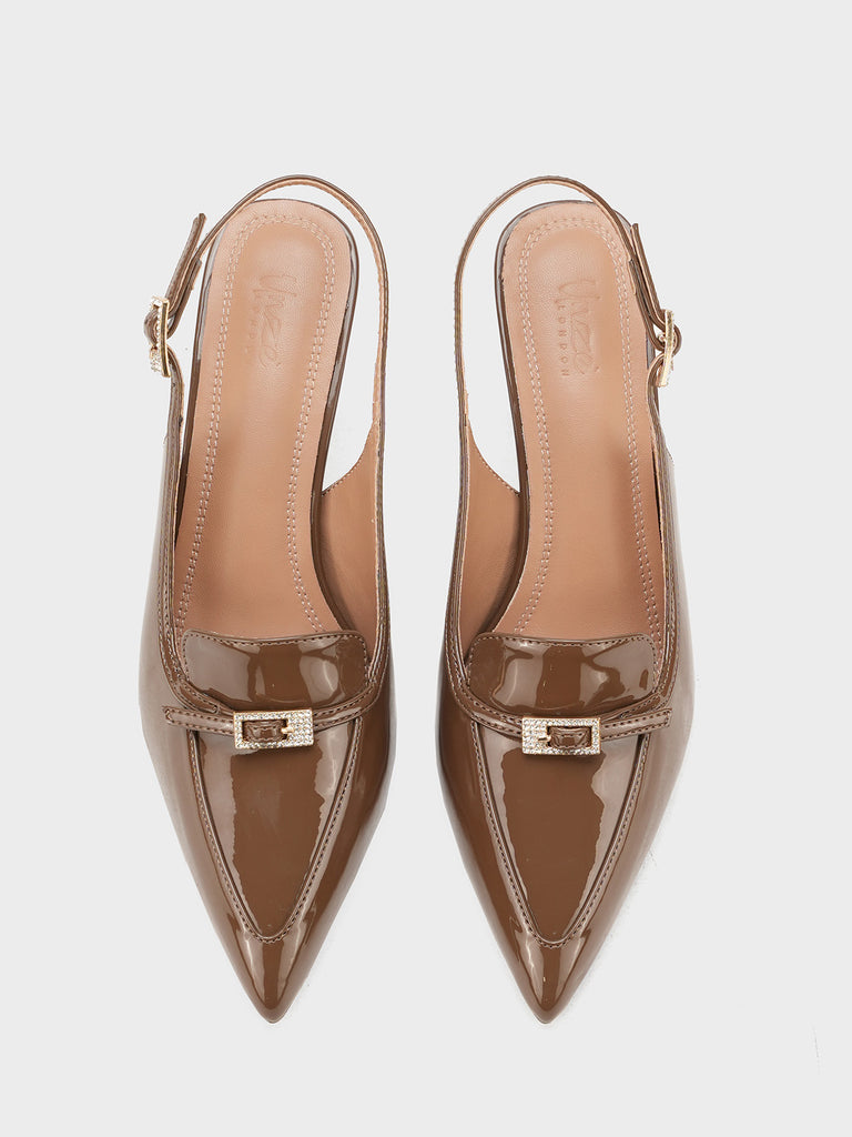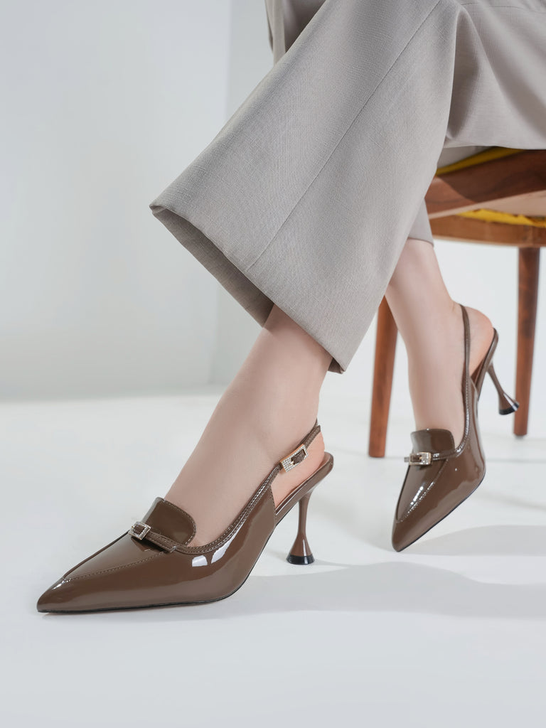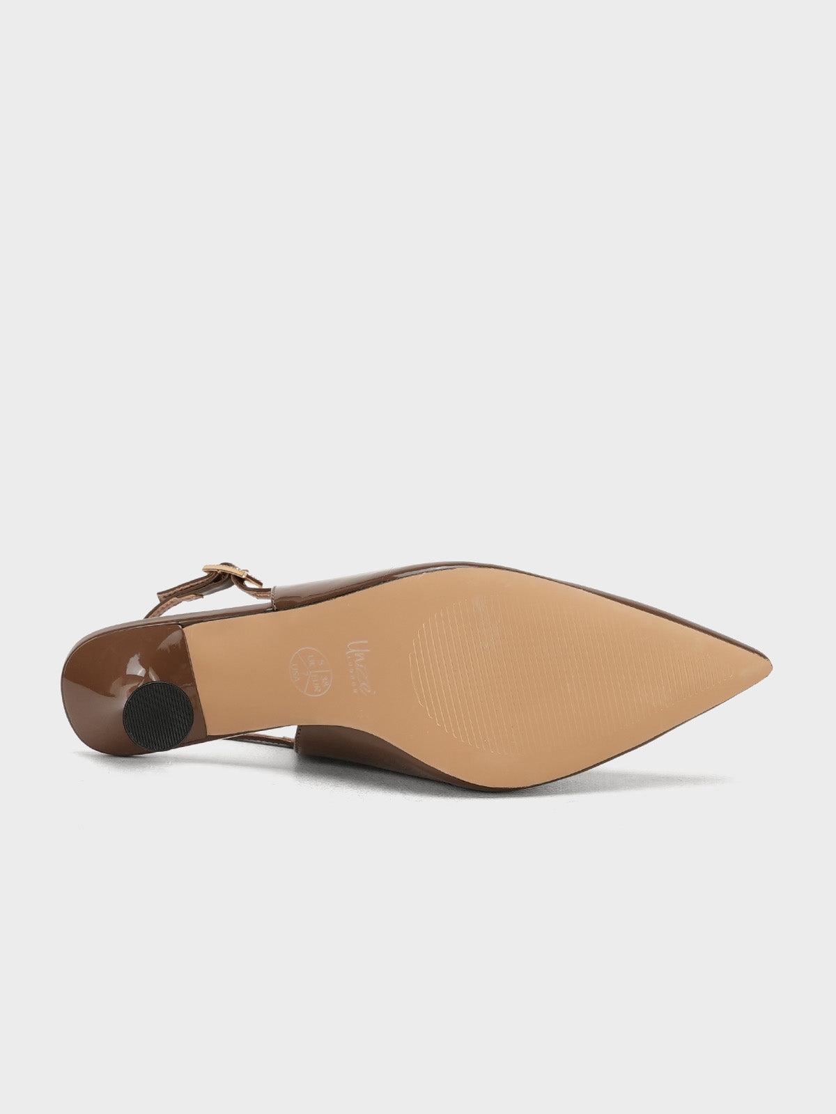 Add a touch of class to your look with these stylish women’s slingback sandals. Designed with a sleek pointed toe and glossy finish, these heels feature a trendy buckle detail on the front. The slingback strap gives a secure fit.