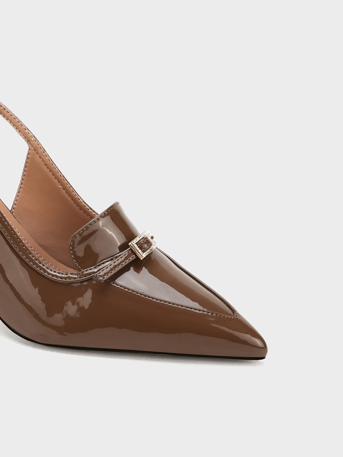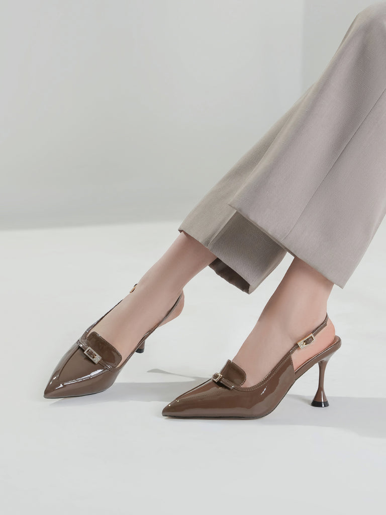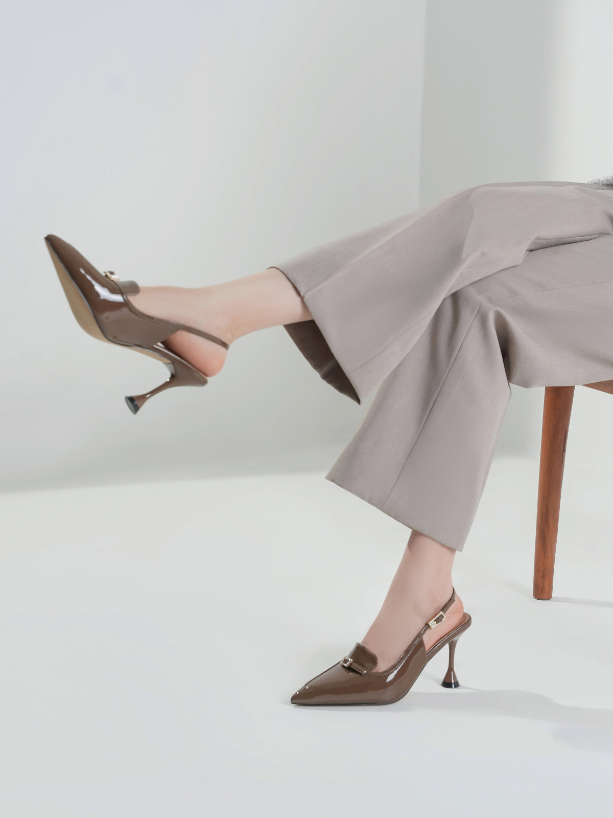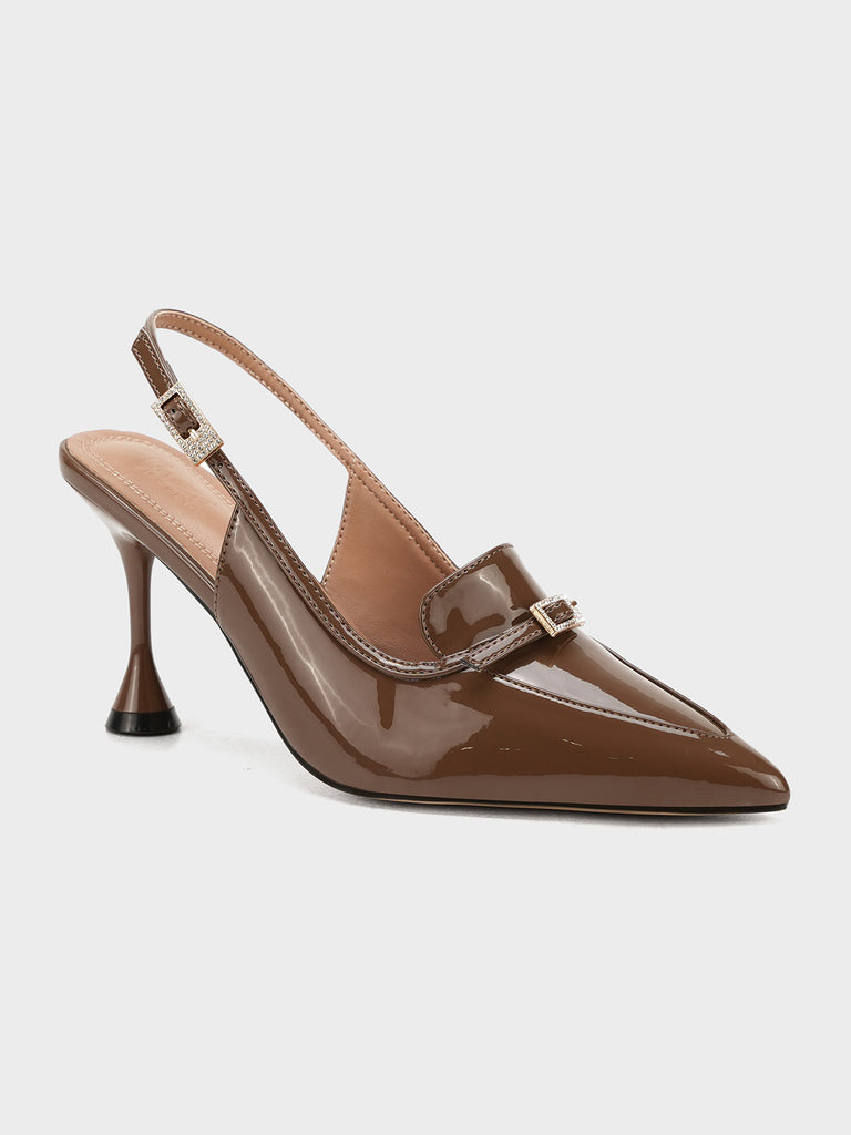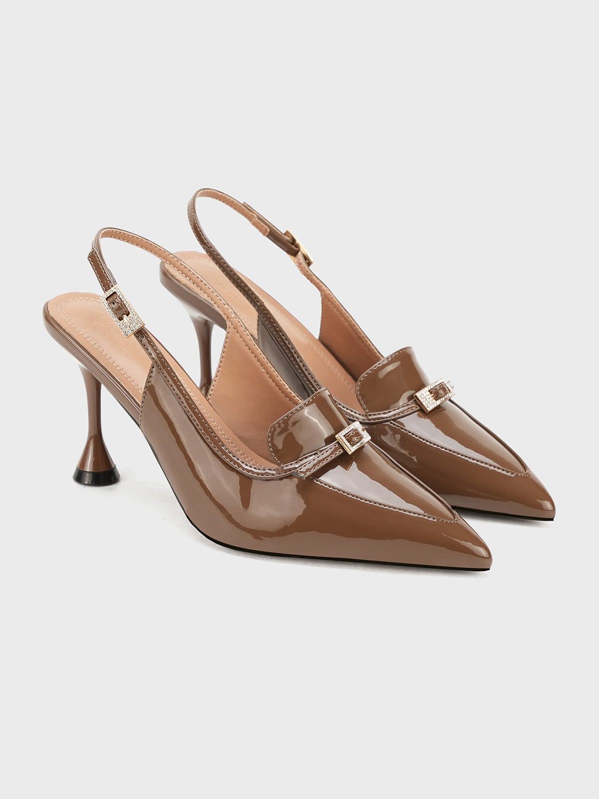 Add a touch of class to your look with these stylish women’s slingback sandals. Designed with a sleek pointed toe and glossy finish, these heels feature a trendy buckle detail on the front. The slingback strap gives a secure fit.