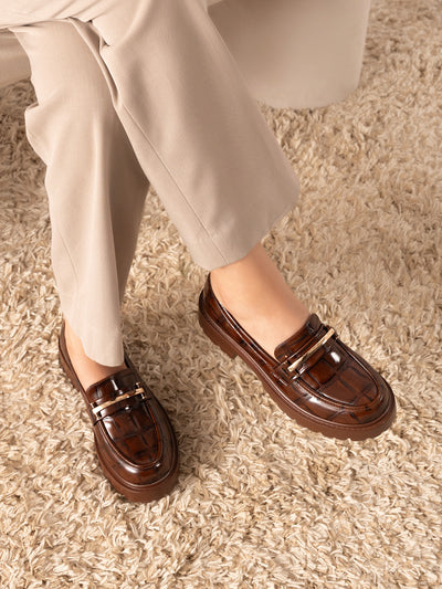 These classy moccasins feature a chic croc-textured finish with a shiny gold buckle detail. Designed for both comfort and style, they are perfect for work or casual wear. The slip-on design makes them easy to wear, while the soft sole ensures all-day comfort.