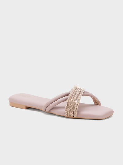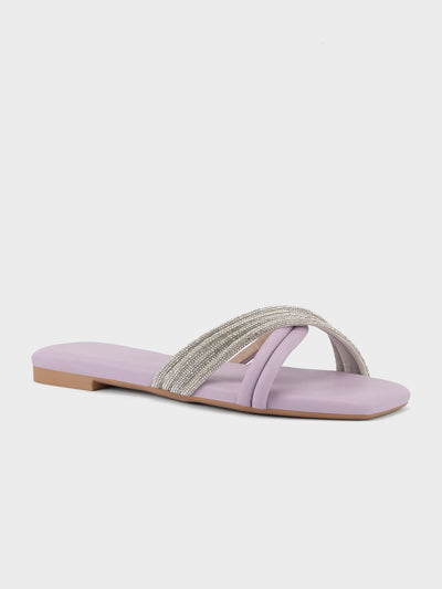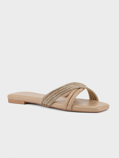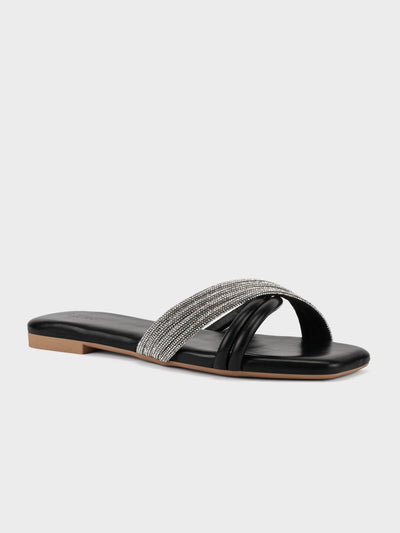 Add a touch of sparkle to your summer wardrobe with these flat open-toe slippers featuring a dazzling crystal-embellished upper. Perfect for casual outings or evening chic. These slippers have rounded toe with padded footbed.