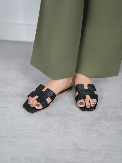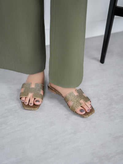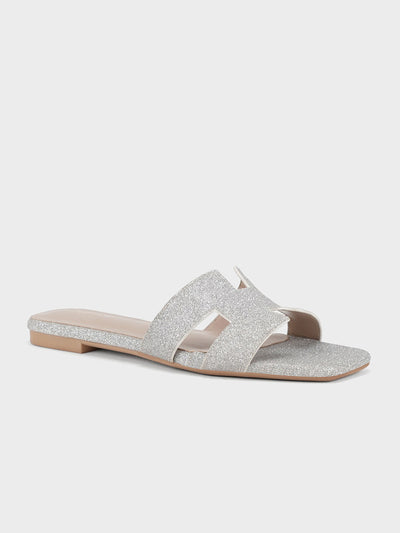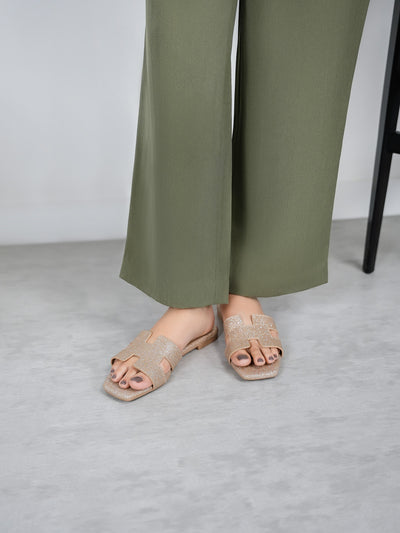 Achieve effortless elegance with these flat open-toe slippers, designed with shimmery decorated upper. Lightweight and versatile, they’re ideal for beach days or casual strolls.