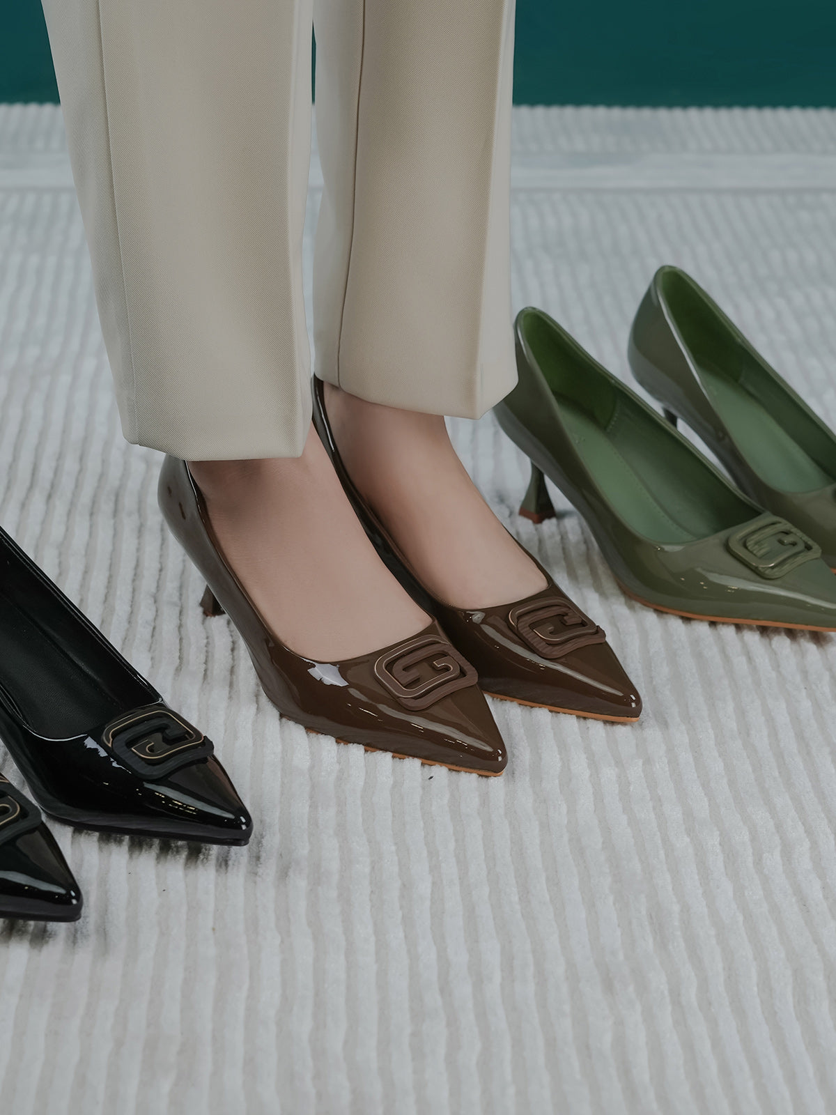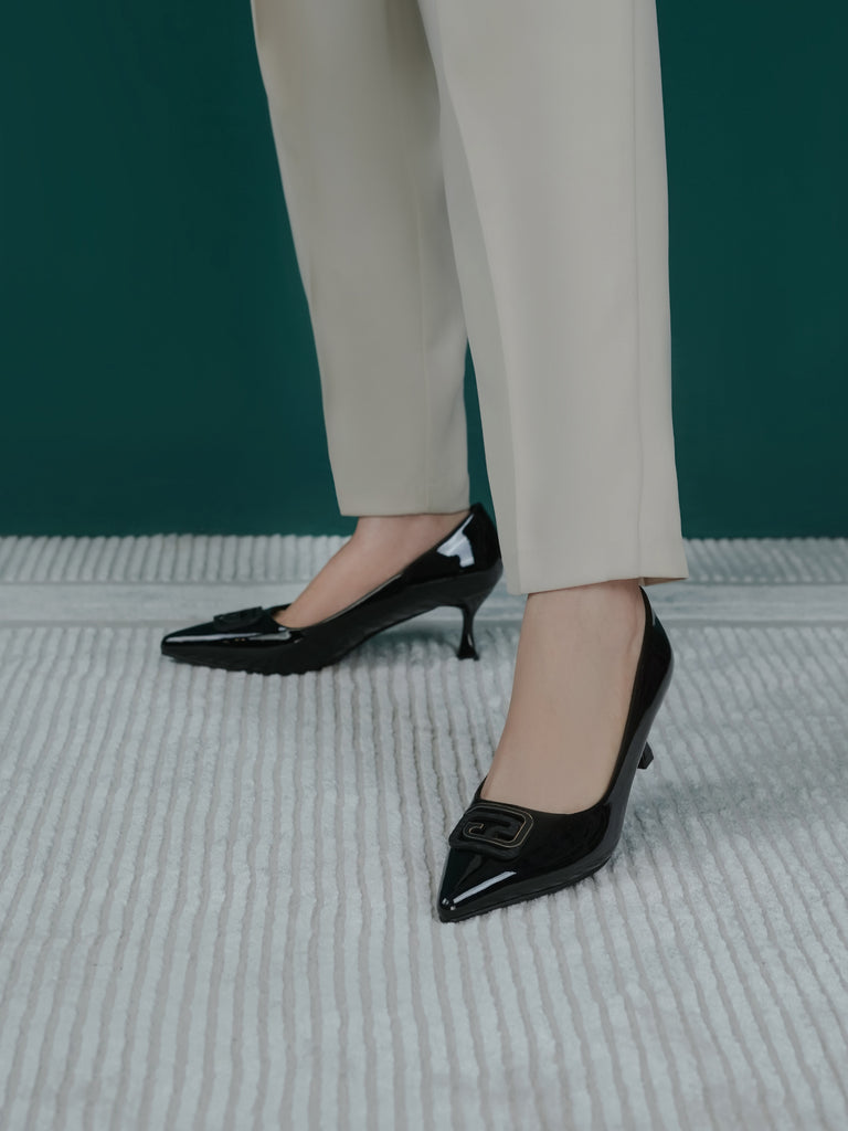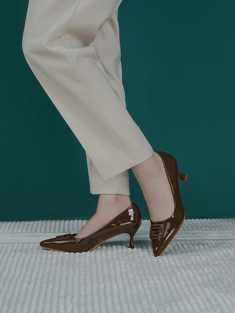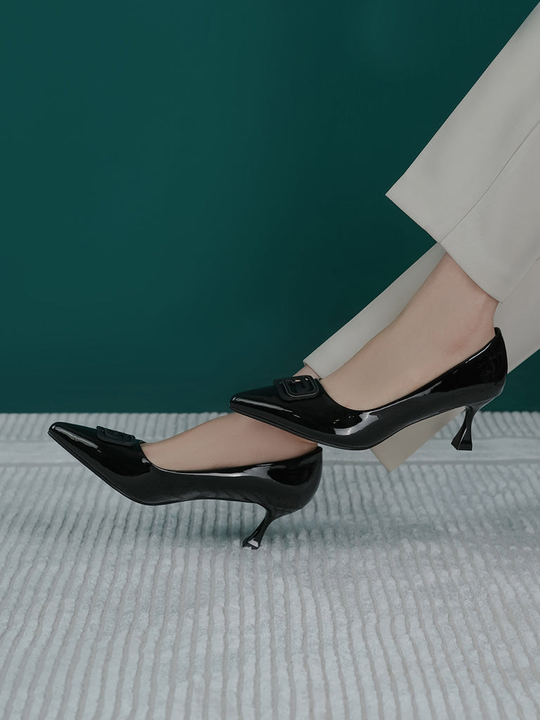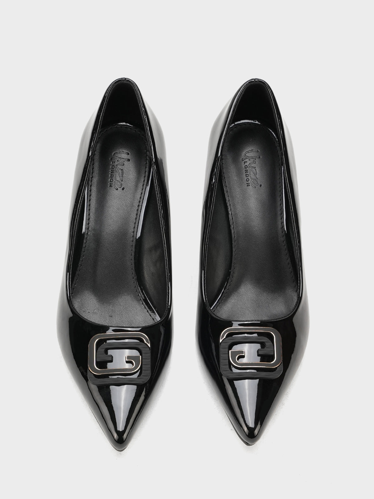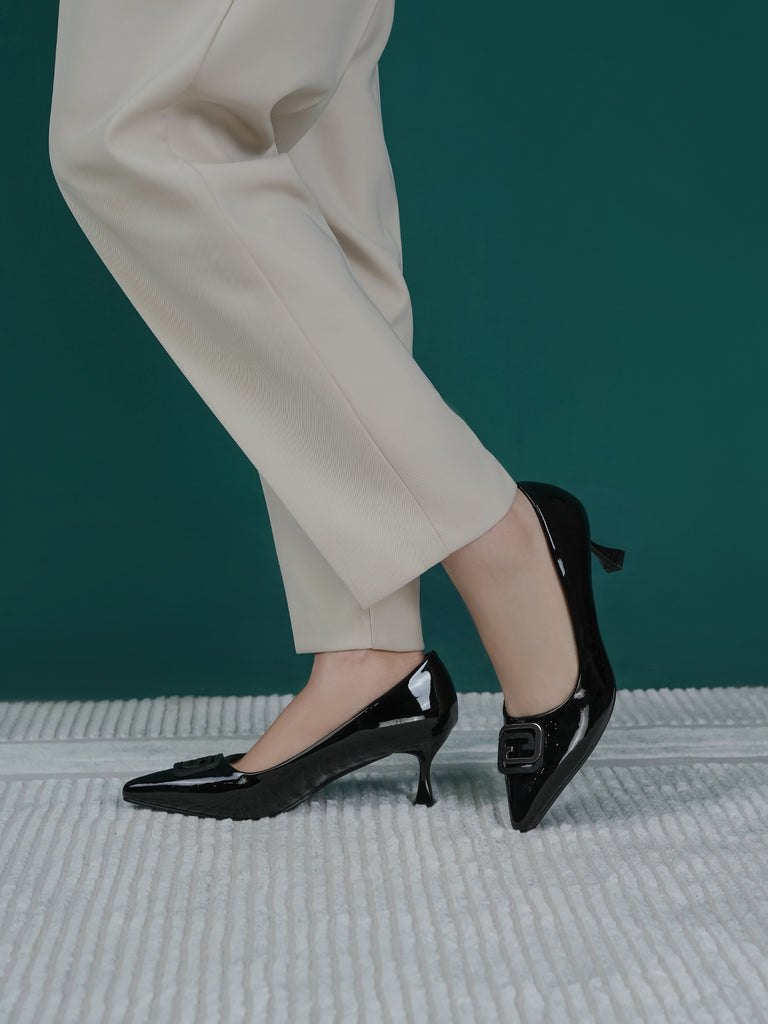 Step into elegance with these women’s court shoes featuring a pointed toe and a stylish upper buckle. The sleek silhouette adds a touch of sophistication, while the decorative buckle detail enhances the overall charm. Perfect for office wear.