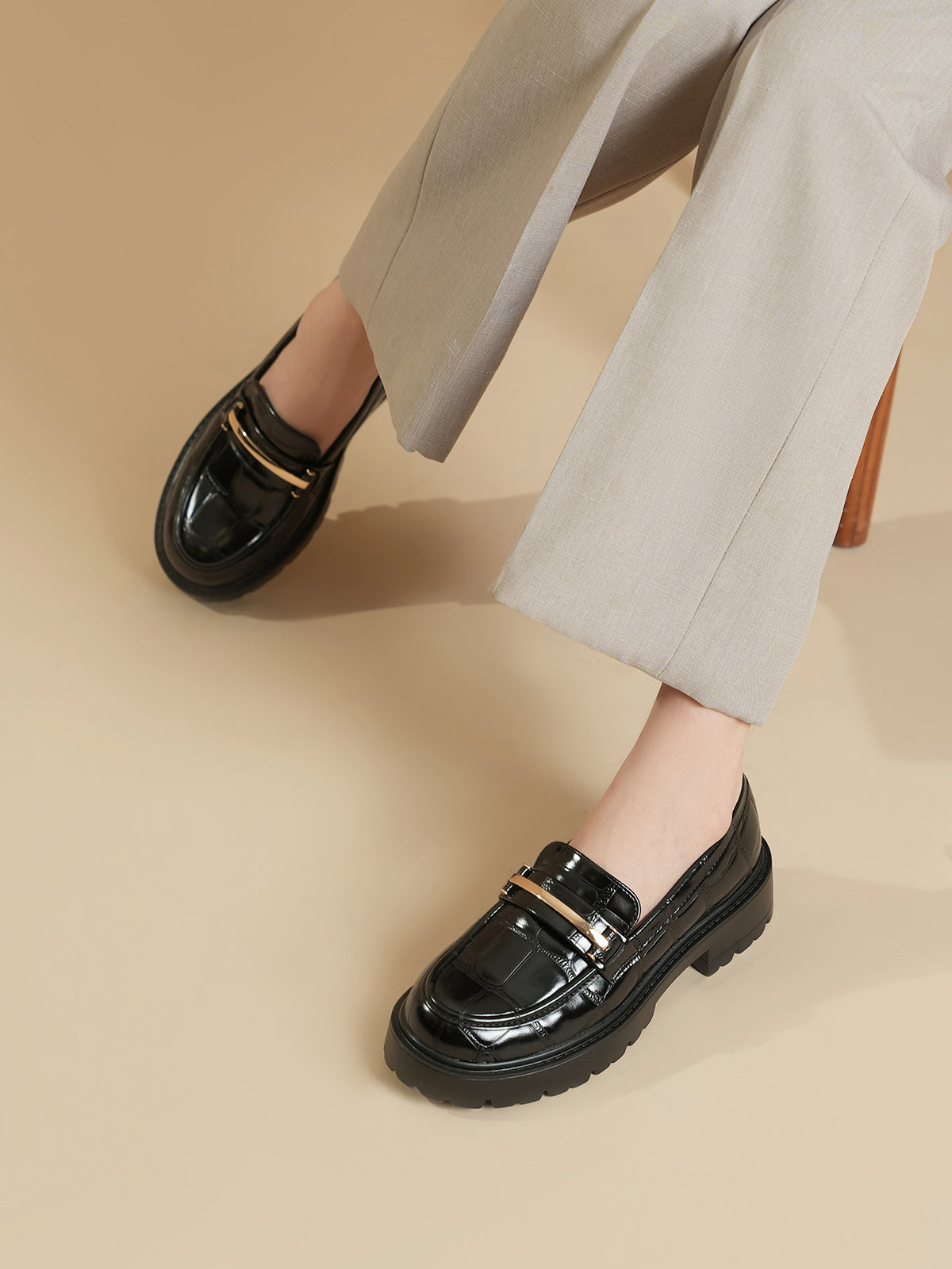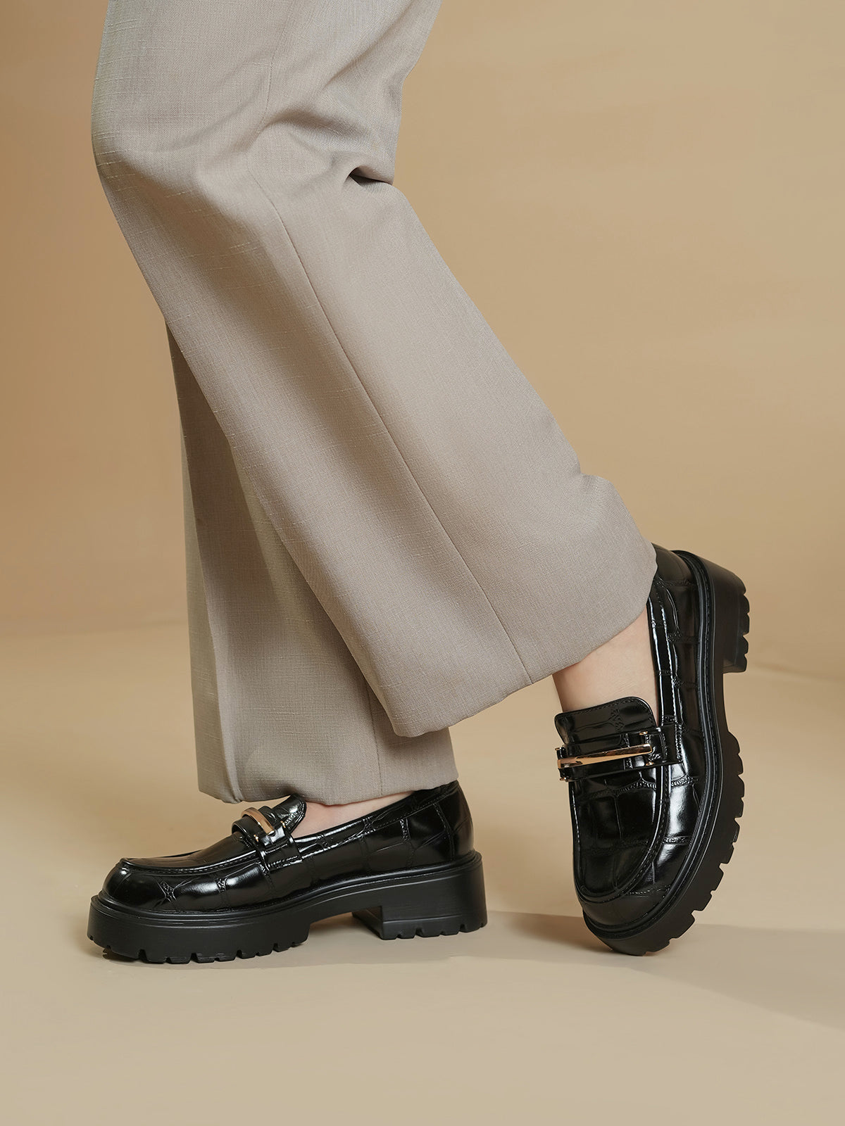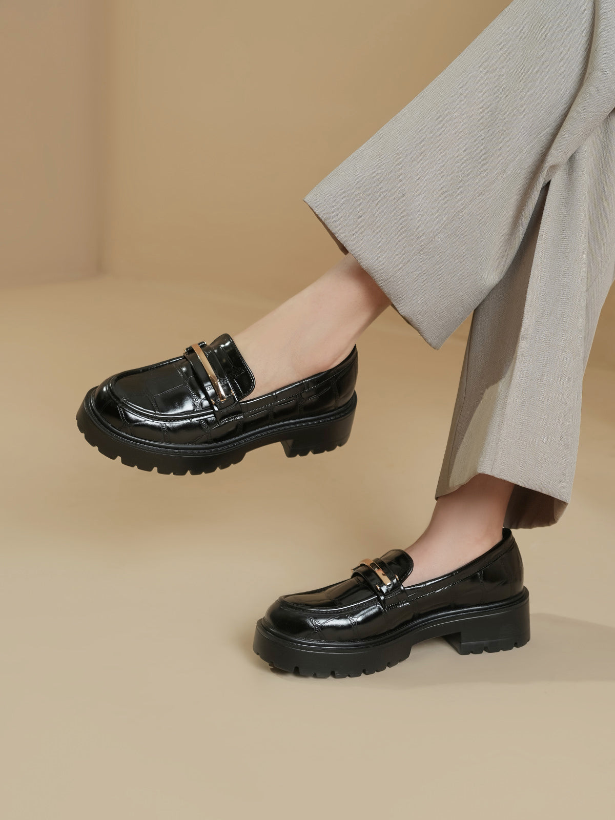 These classy moccasins feature a chic croc-textured finish with a shiny gold buckle detail. Designed for both comfort and style, they are perfect for work or casual wear. The slip-on design makes them easy to wear, while the soft sole ensures all-day comfort.