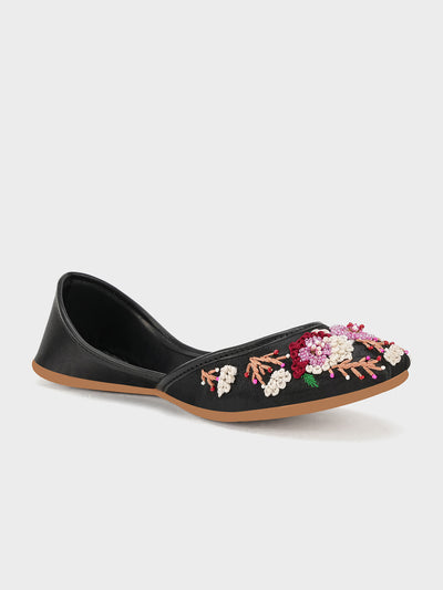 These women’s khussa shoes showcase timeless elegance with intricate hand embroidery on a sleek black base.They bring a vibrant touch of tradition and artistry. Crafted for comfort with a classic flat sole.