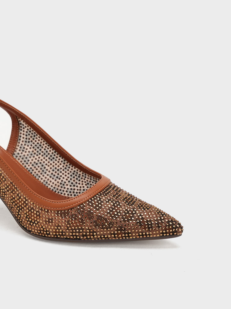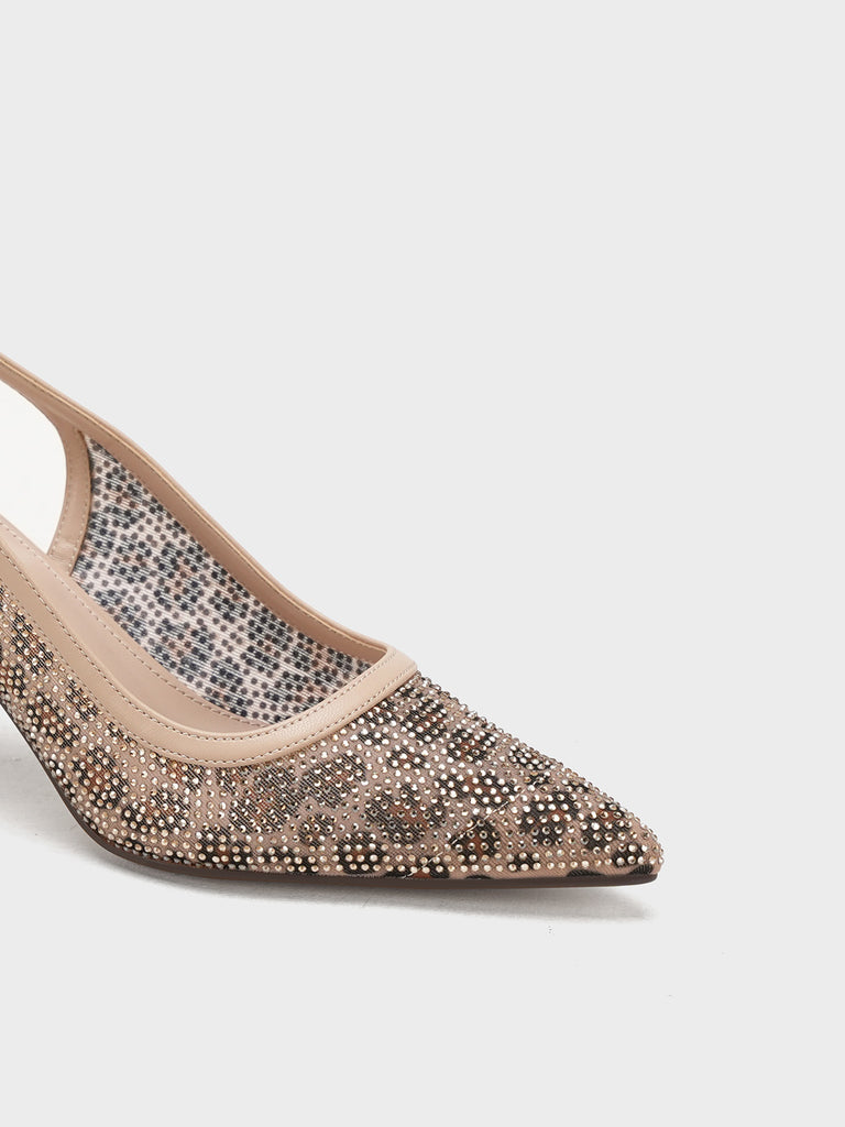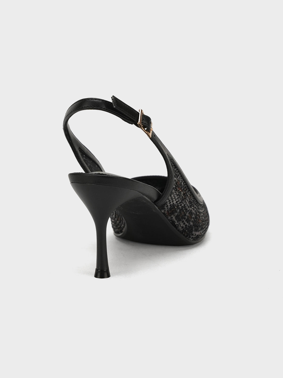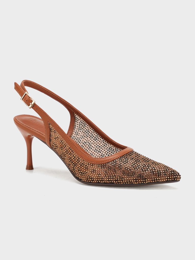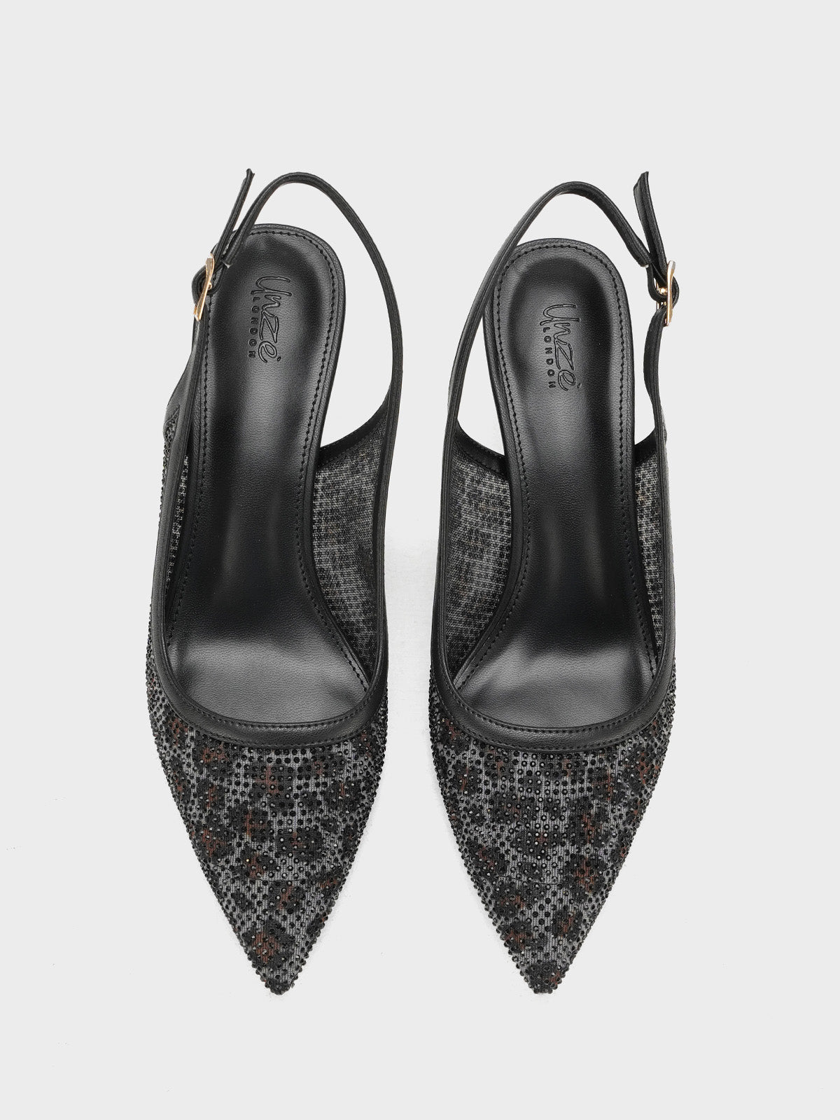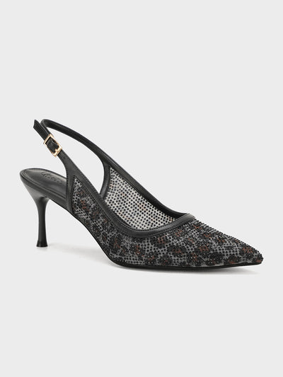 Step out in elegance with these women’s net sandals, designed with a chic pointed toe and sparkling embellishments for a glamorous touch. The slingback style with an adjustable buckle fastening ensures a comfortable and secure fit, while the pencil heel adds a refined silhouette.