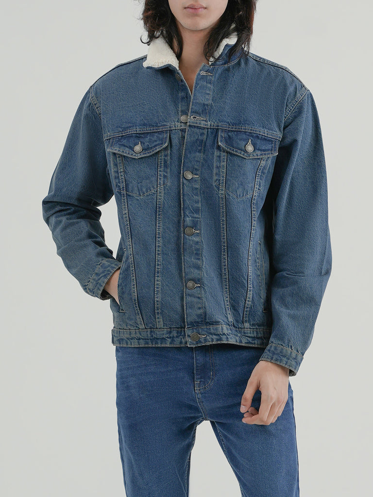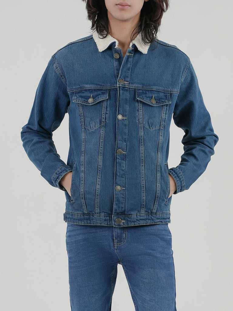 Elevate your cool-weather wardrobe with this men’s denim jacket featuring a sherpa collar for added warmth and style. Designed in a regular fit, it offers a classic silhouette that’s easy to layer over your everyday looks.