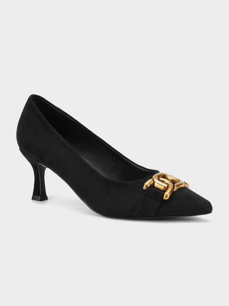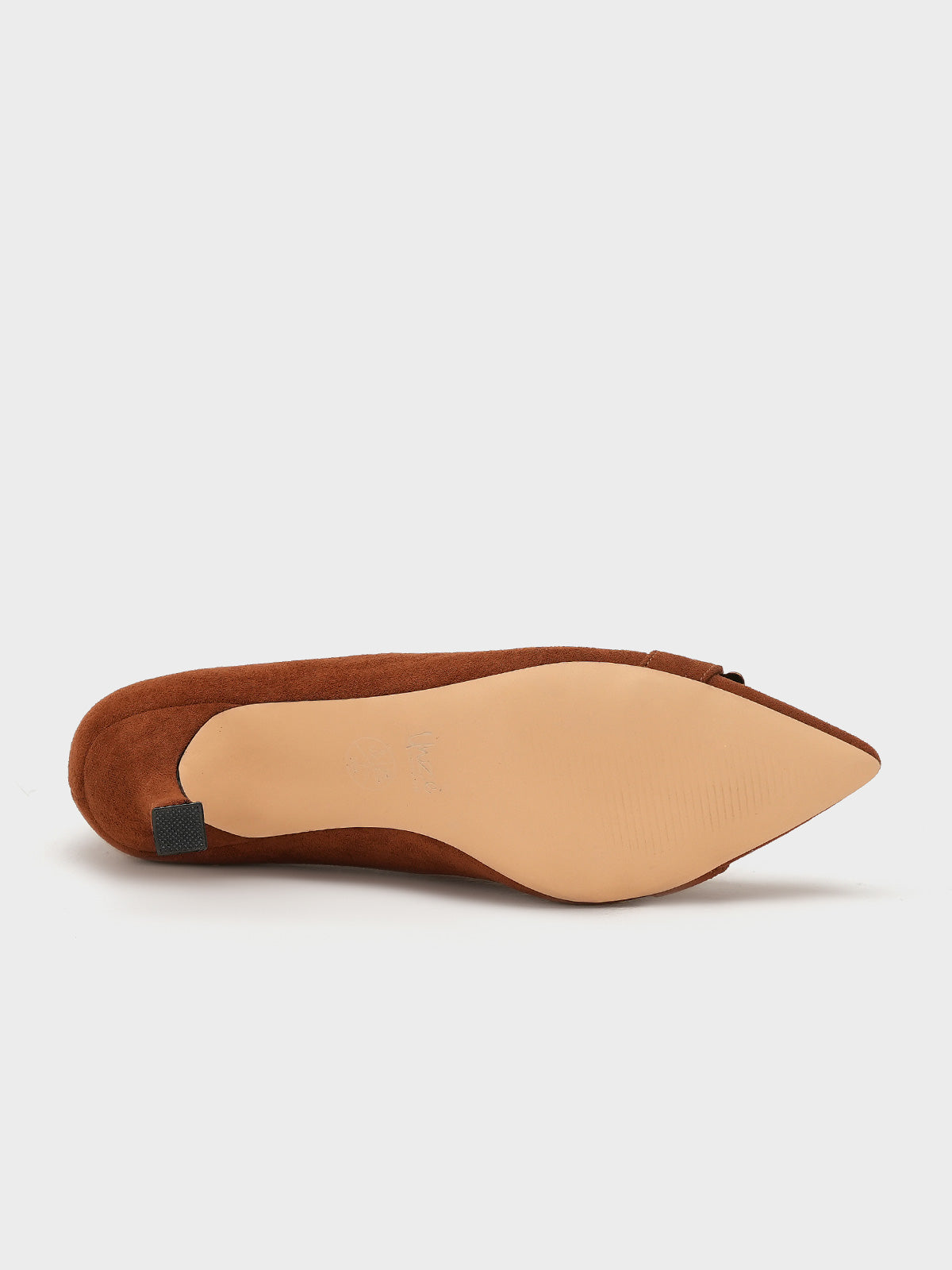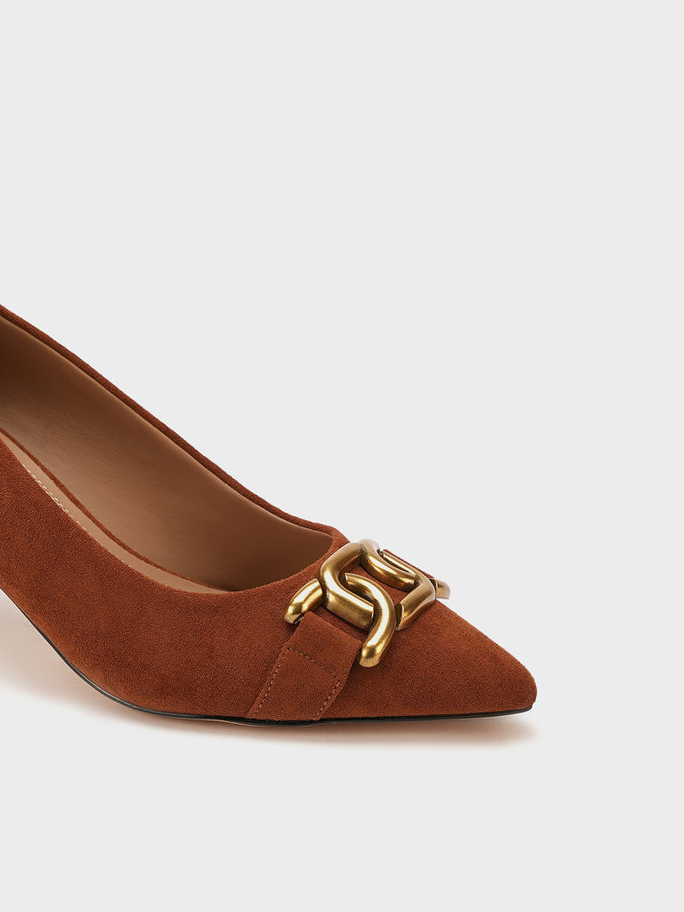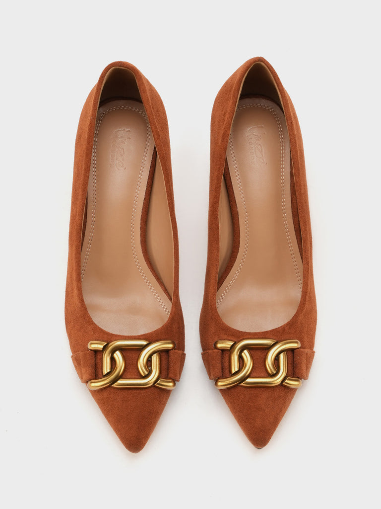 Step into elegance with this stylish women’s court shoe set. Featuring a pointed toe and sleek kitten heel, the black suede shoe is adorned with a bold gold chain detail for a chic, modern touch, while the rich brown suede pair offers a classic, clean finish.