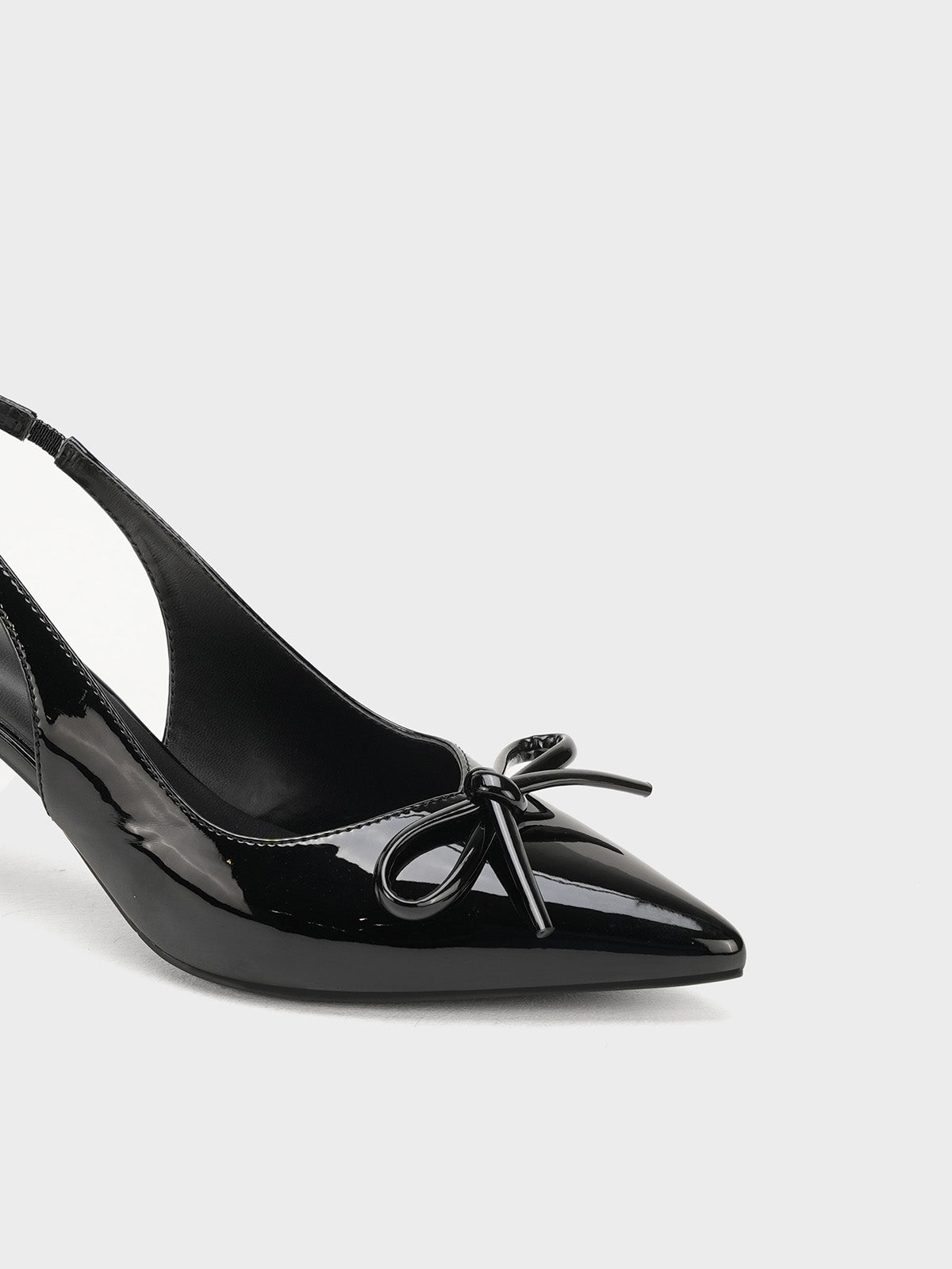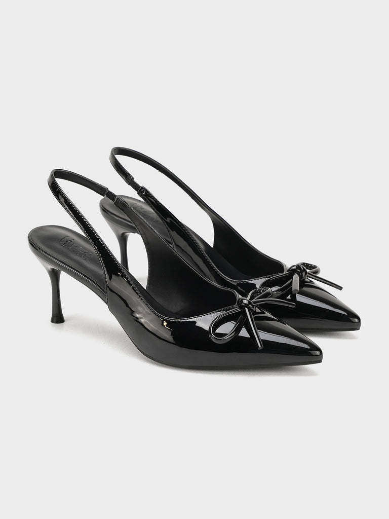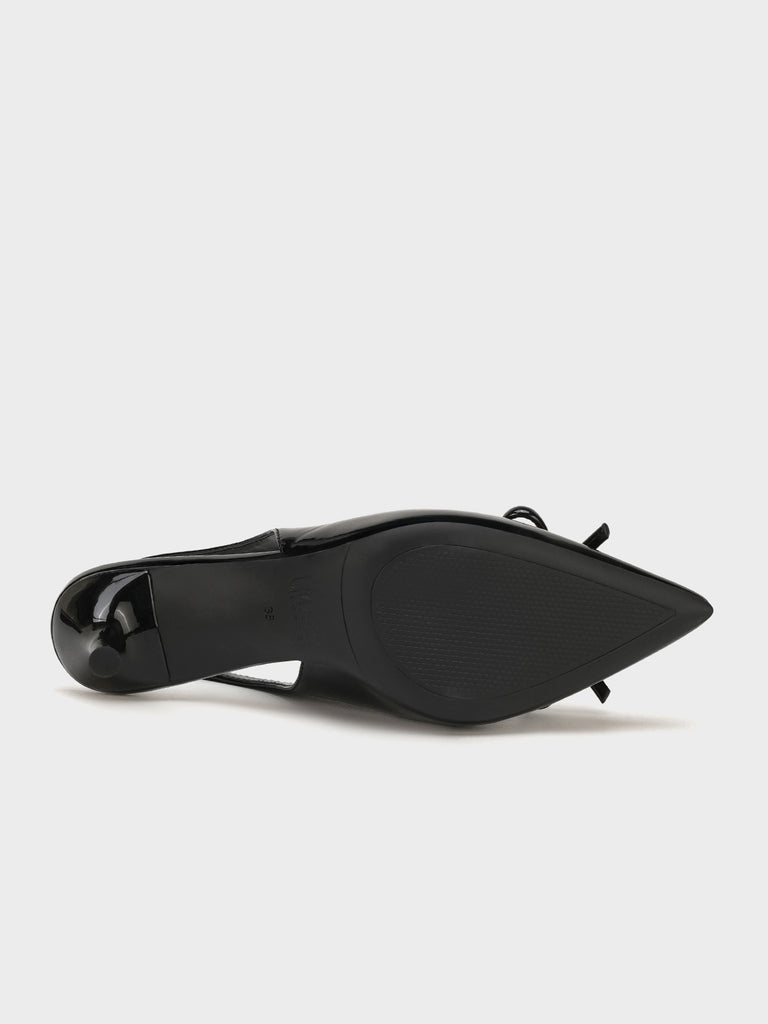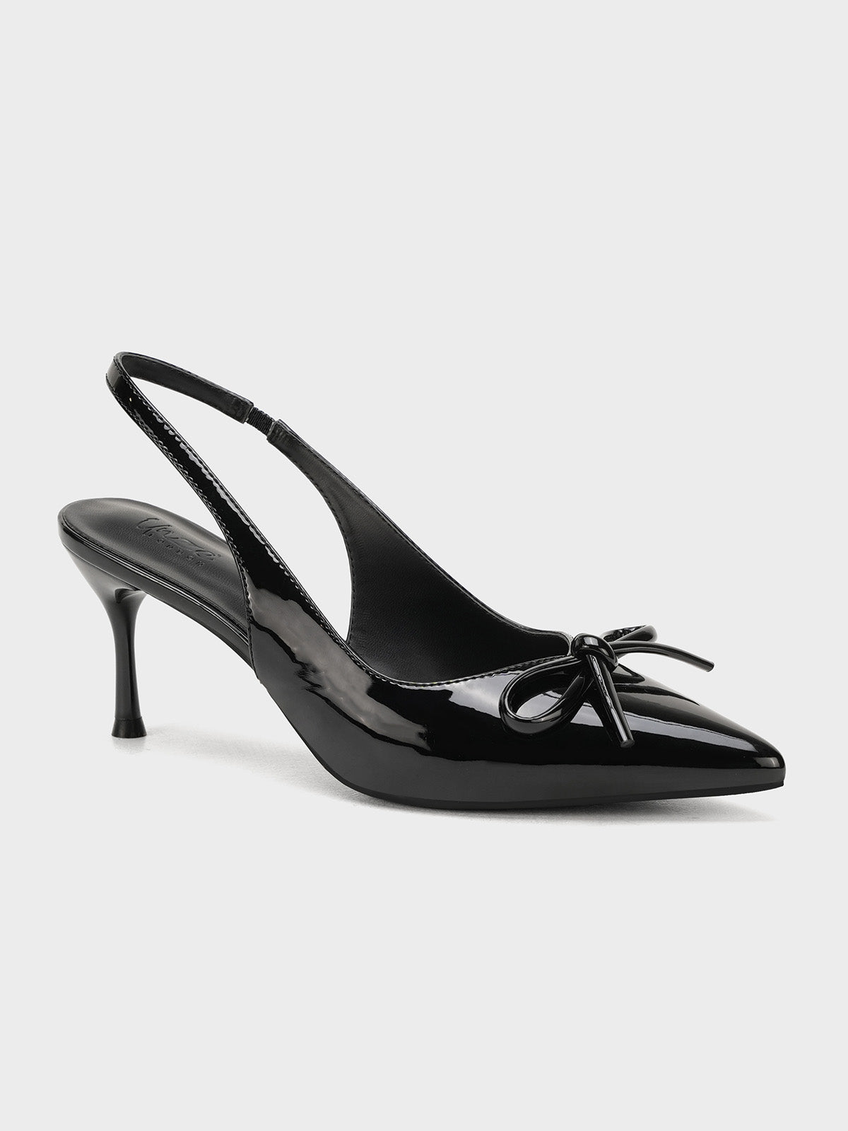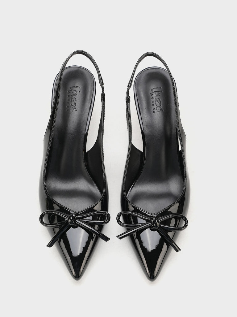 Elevate your look with these stylish women’s slingback sandals, designed with a sleek pencil heel for a touch of elegance. Crafted in a glossy finish with a pointed toe and chic bow detail, these sandals combine sophistication with modern charm.