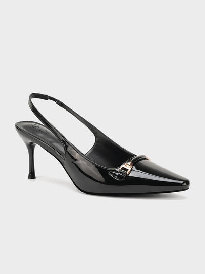 Add a touch of sophistication to your look with these women’s slingback sandals, designed with a sleek pointed toe and a slender pencil heel. The glossy finish paired with a chic gold accent detail enhances their elegance.