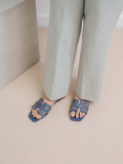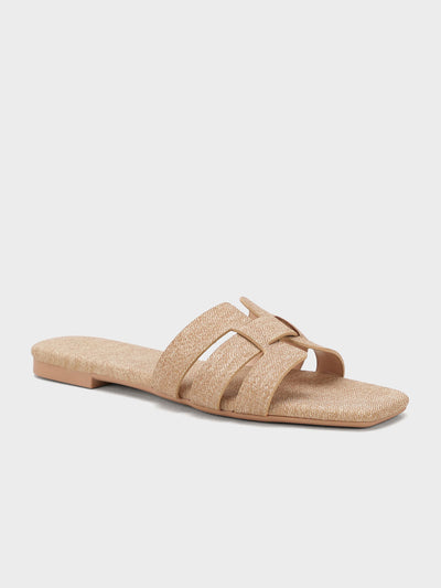 Keep it classy and comfortable with these designed flat slippers, featuring a subtle upper for a refined touch. Ideal for everyday wear with a stylish twist. Square toe with padded insole is for ultimate comfort.